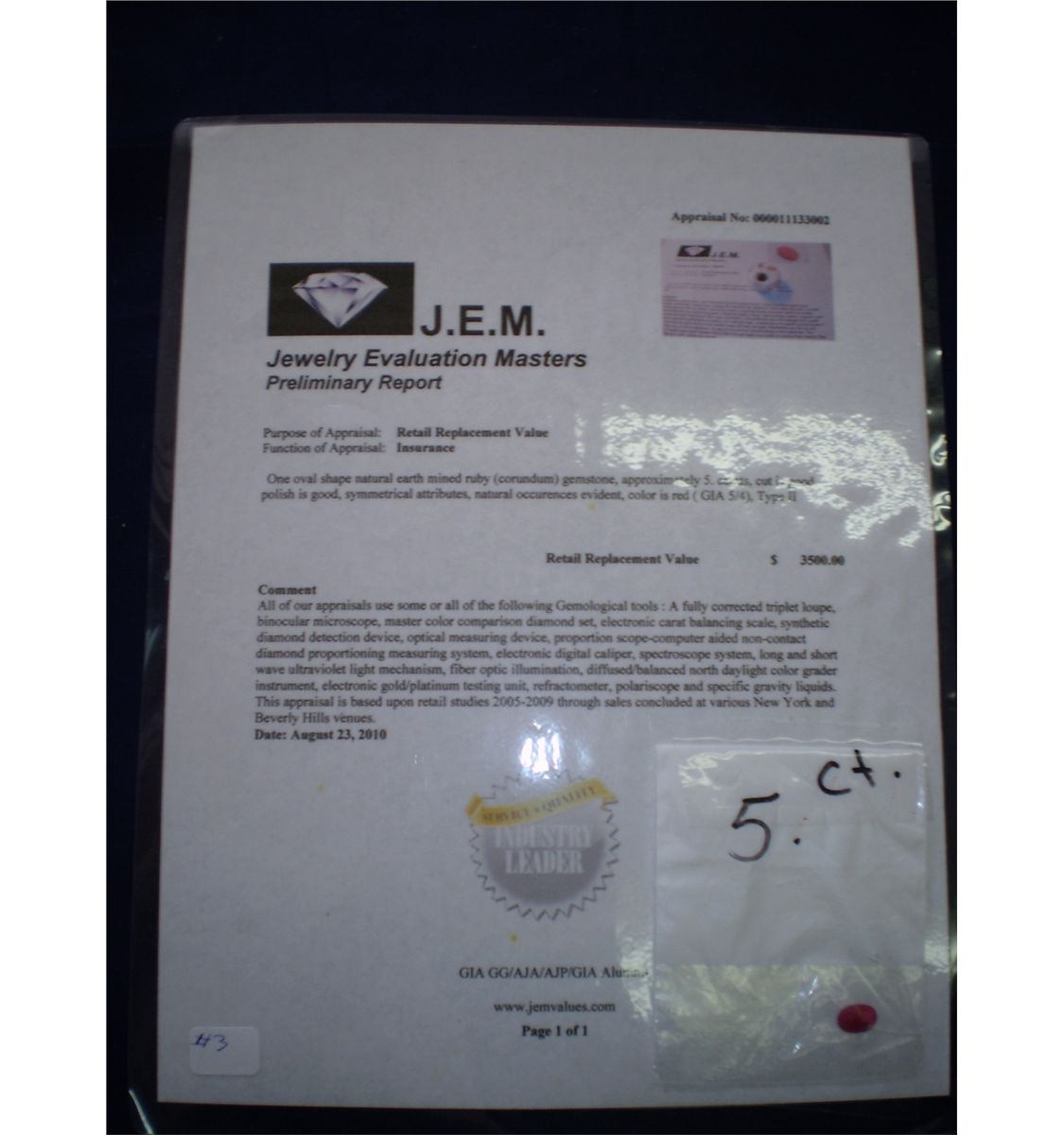 Ruby with certificate to show appraisal