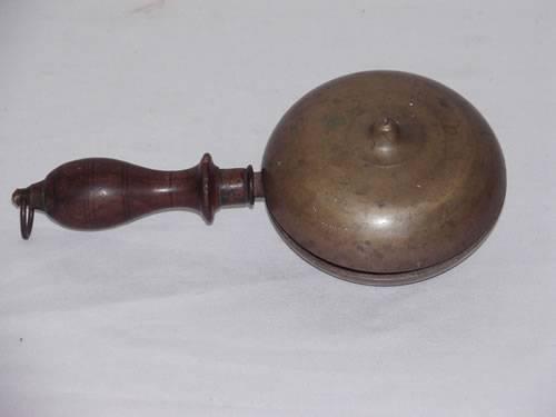 5" BRASS MUFFIN BELL - MINOR CHIP TO TOP RIM OF WOOD, 1 SIDE OF BELL STRIPPED;