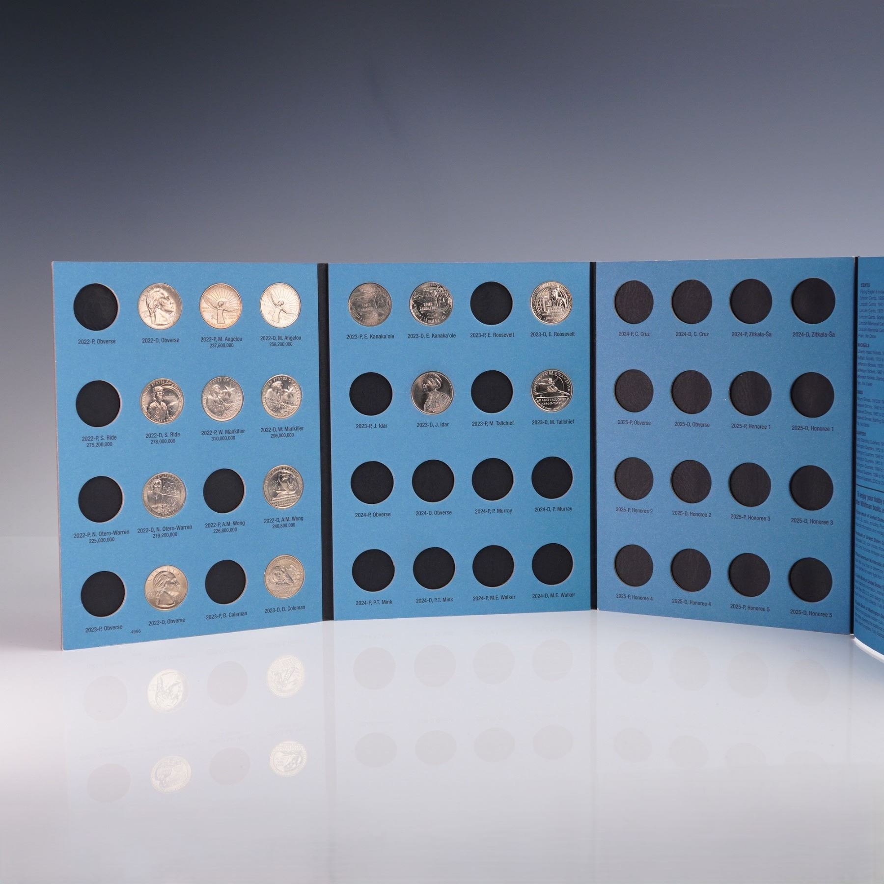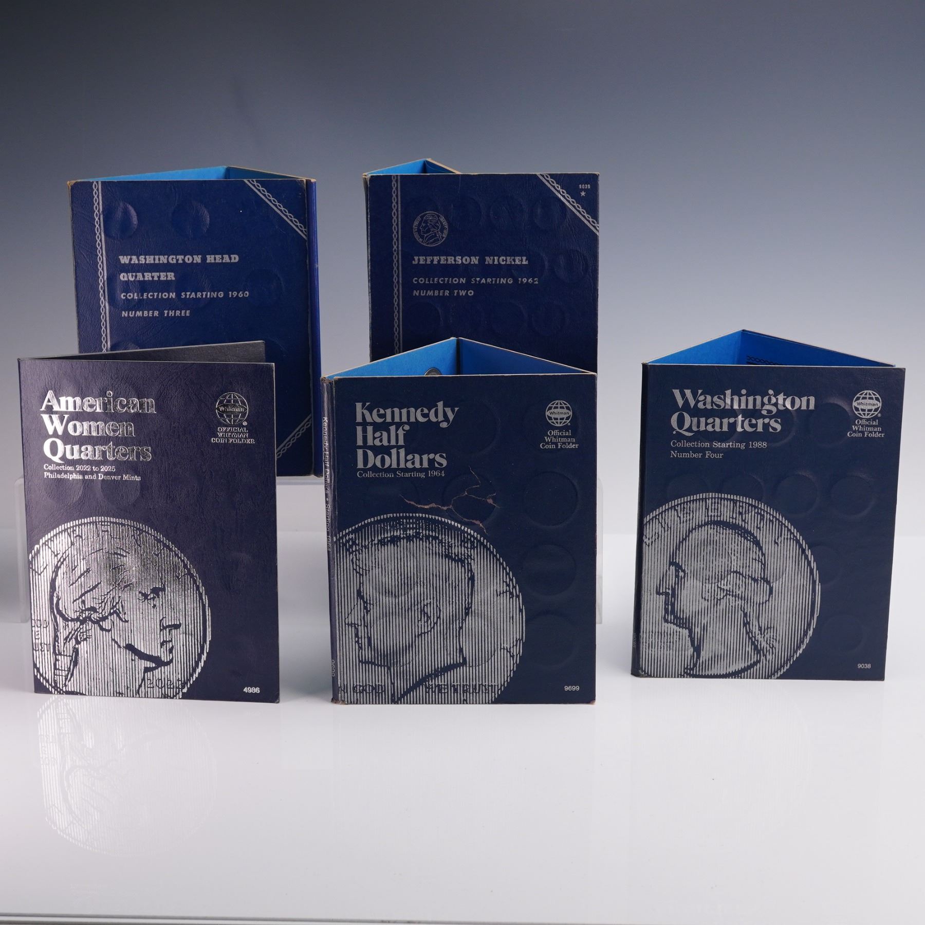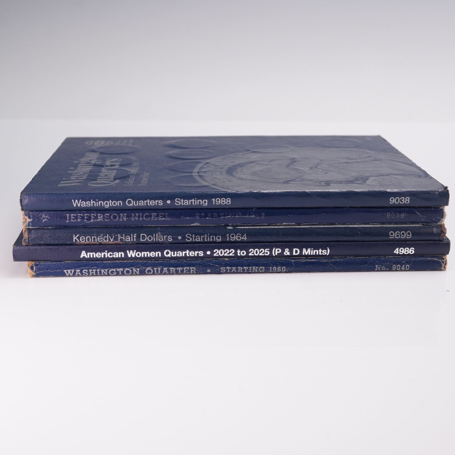 A five-piece array of Whitman official coin folders curated to encompass a selection of modern United States coinage across several denominations and eras. Includes Washington Head Quarter Collection staring 1960, Jefferson Nickel Collection starting 1962, Kennedy Half Dollars Collection starting 1964, Washington Quarters Collection starting 1988, and American Woman Quarter Collection 2022-2025. Each trifold album is equipped with individually labeled openings denoting year, mintmark, and production volume. Washington Head Quarter folder includes 33 of 36 coins, Jefferson Nickel folder includes 64 of 64 coins, Kennedy Half Dollar Folder includes 32 of 36, Washington Quarter Folder includes 22 of 41 coins, and American Woman Quarter Folder includes 15 of 48 coins. These structured archival folders present a chronological snapshot of American numismatics.
