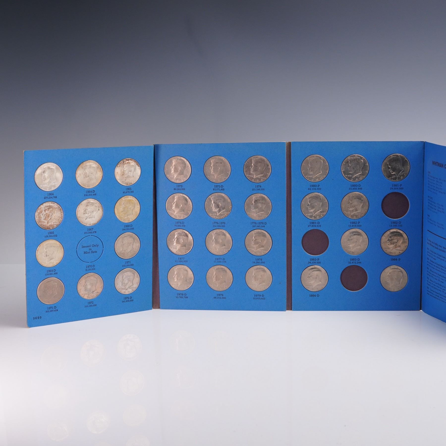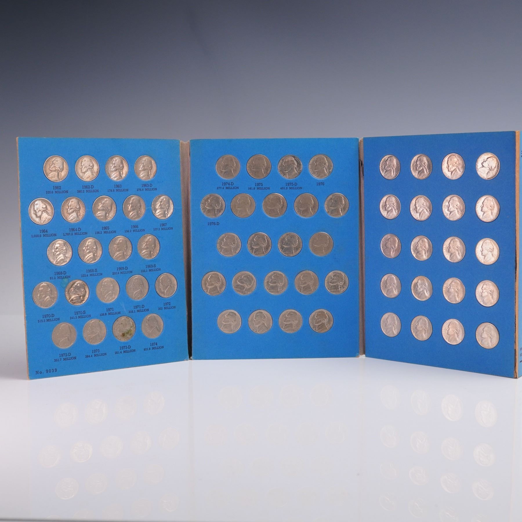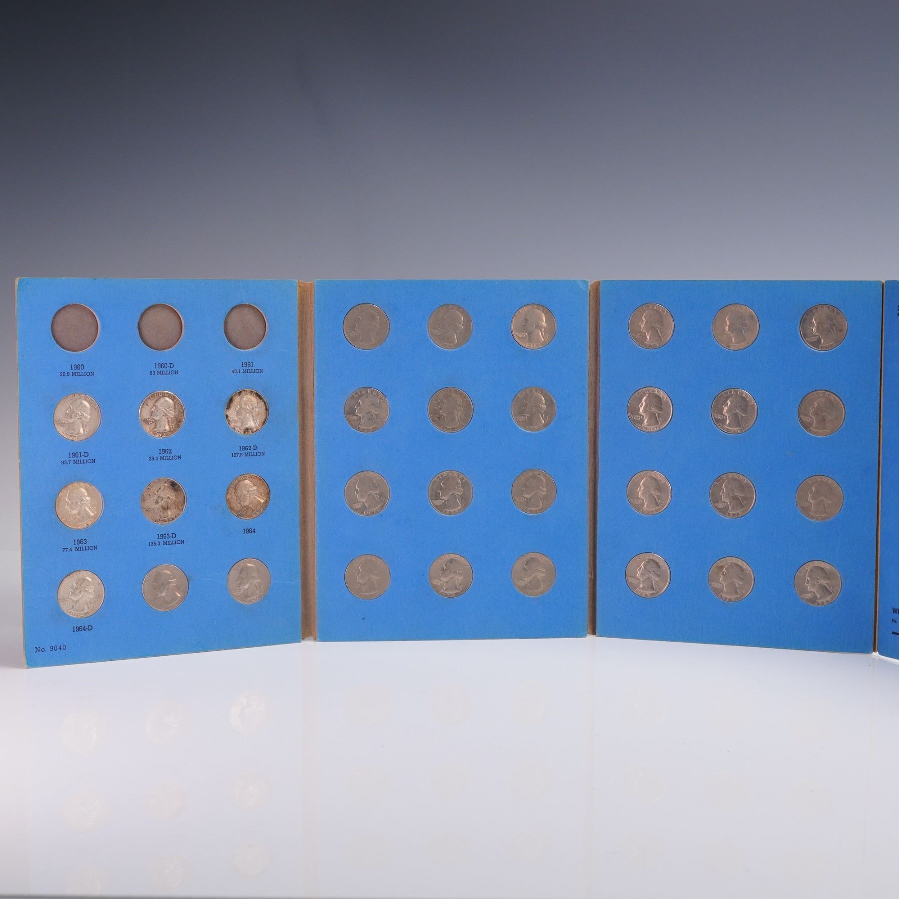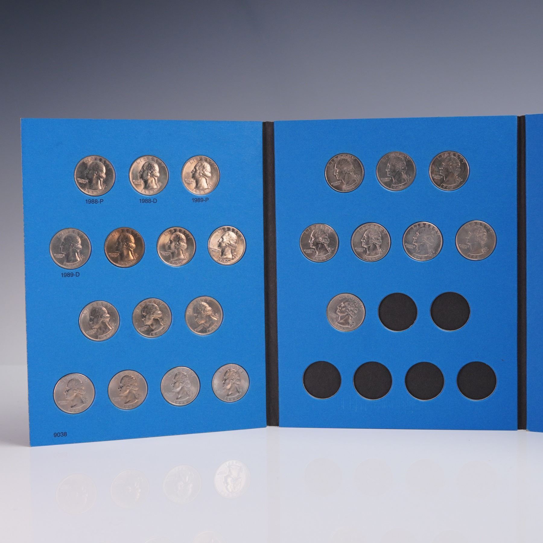 A five-piece array of Whitman official coin folders curated to encompass a selection of modern United States coinage across several denominations and eras. Includes Washington Head Quarter Collection staring 1960, Jefferson Nickel Collection starting 1962, Kennedy Half Dollars Collection starting 1964, Washington Quarters Collection starting 1988, and American Woman Quarter Collection 2022-2025. Each trifold album is equipped with individually labeled openings denoting year, mintmark, and production volume. Washington Head Quarter folder includes 33 of 36 coins, Jefferson Nickel folder includes 64 of 64 coins, Kennedy Half Dollar Folder includes 32 of 36, Washington Quarter Folder includes 22 of 41 coins, and American Woman Quarter Folder includes 15 of 48 coins. These structured archival folders present a chronological snapshot of American numismatics.