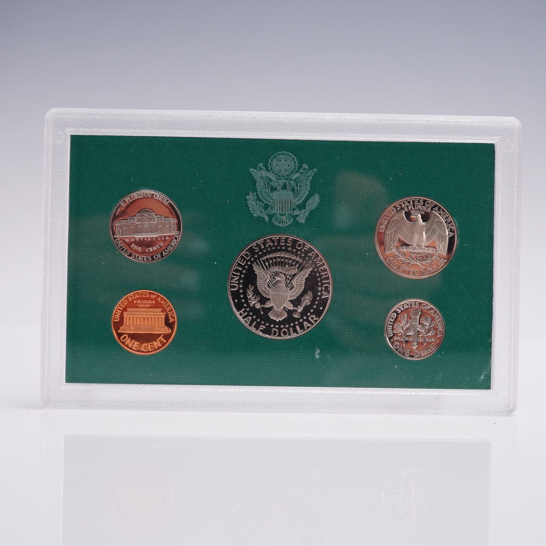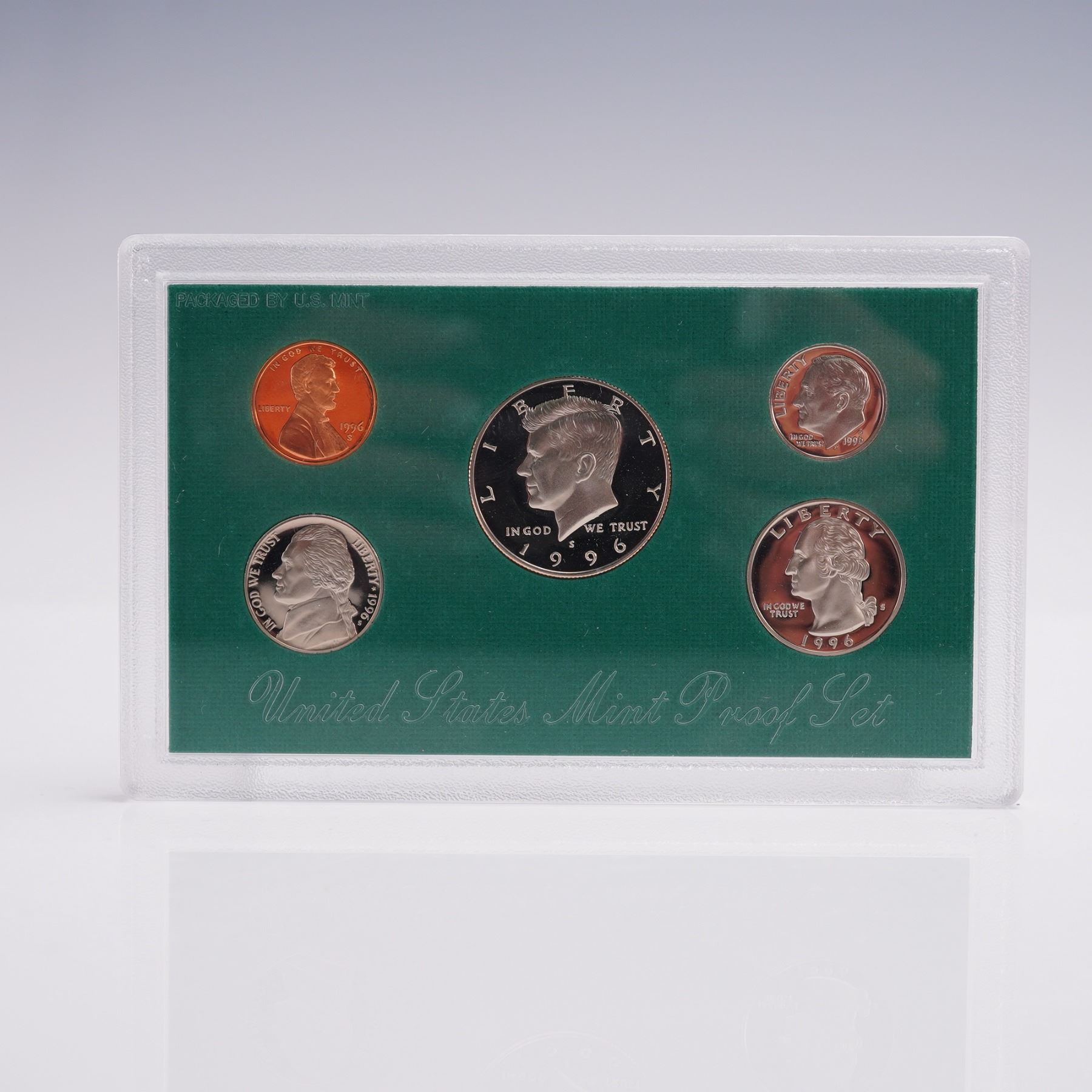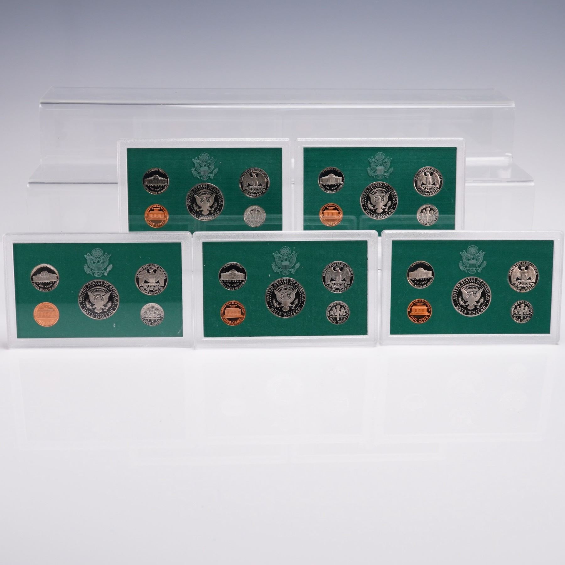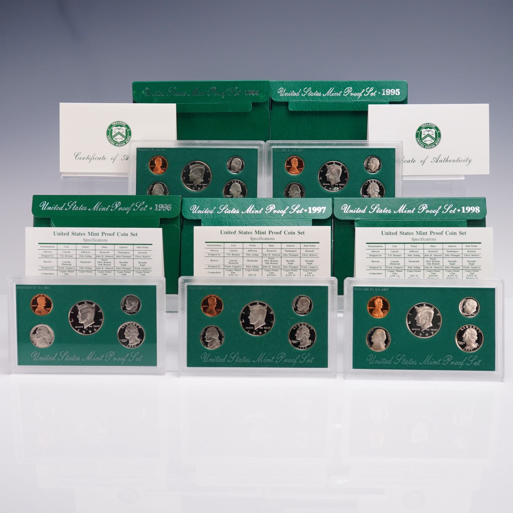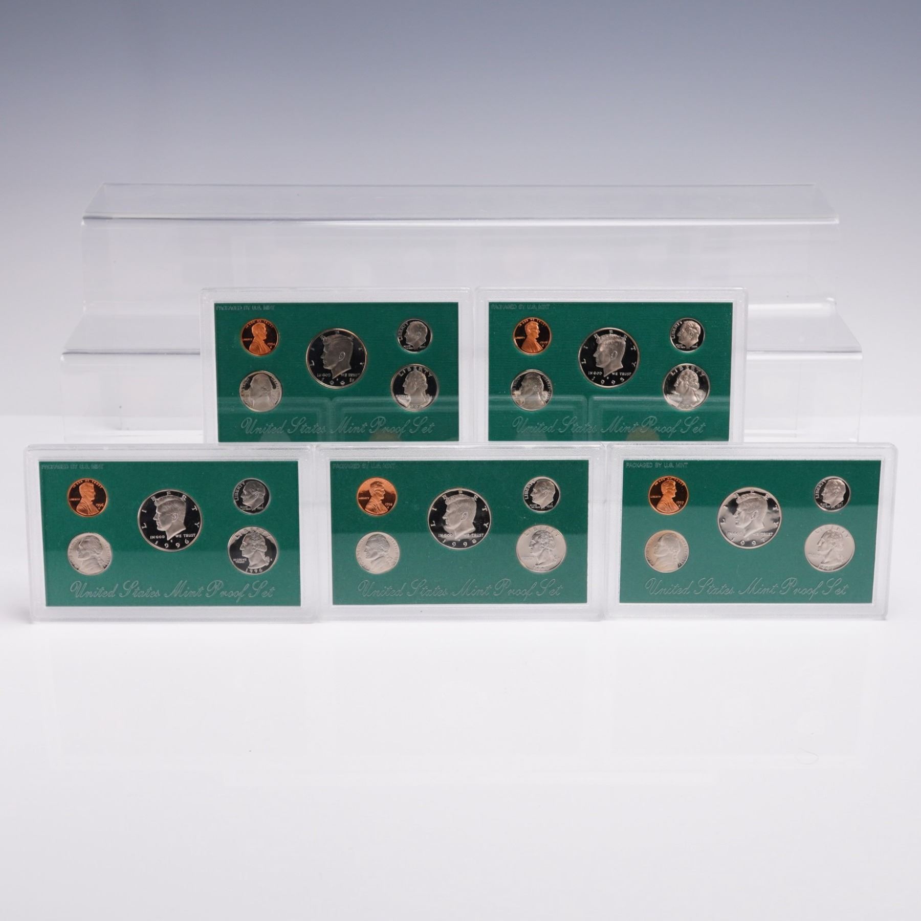 United States Mint Proof Coin Sets, each corresponding to the years 1994, 1995, 1996, 1997, and 1998. All coins in these sets were struck at the San Francisco Mint, as denoted by the "S" mint mark. Each set is encased in its original hard plastic display holder with a green background, and includes a Certificate of Authenticity and specification card from the U.S. Mint. Each annual set contains five denominations: a Kennedy Half Dollar, a Washington Quarter, a Roosevelt Dime, a Jefferson Nickel, and a Lincoln Penny. These coins were manufactured using the proof minting process, featuring sharp details and mirror-like surfaces. The obverse and reverse sides of all coins are included, with clear presentation of design elements, inscriptions, and mint marks. All coins display consistent and crisp strike quality typical of U.S. Mint proof issues. The packaging includes both obverse and reverse panels for each year, and all sets are housed in protective plastic cases, ideal for collectors and archival storage. These sets represent five consecutive years of American coinage history during the 1990s. A U.S. Mint box: 5.5"L x 3.5"W x 0.25"H.