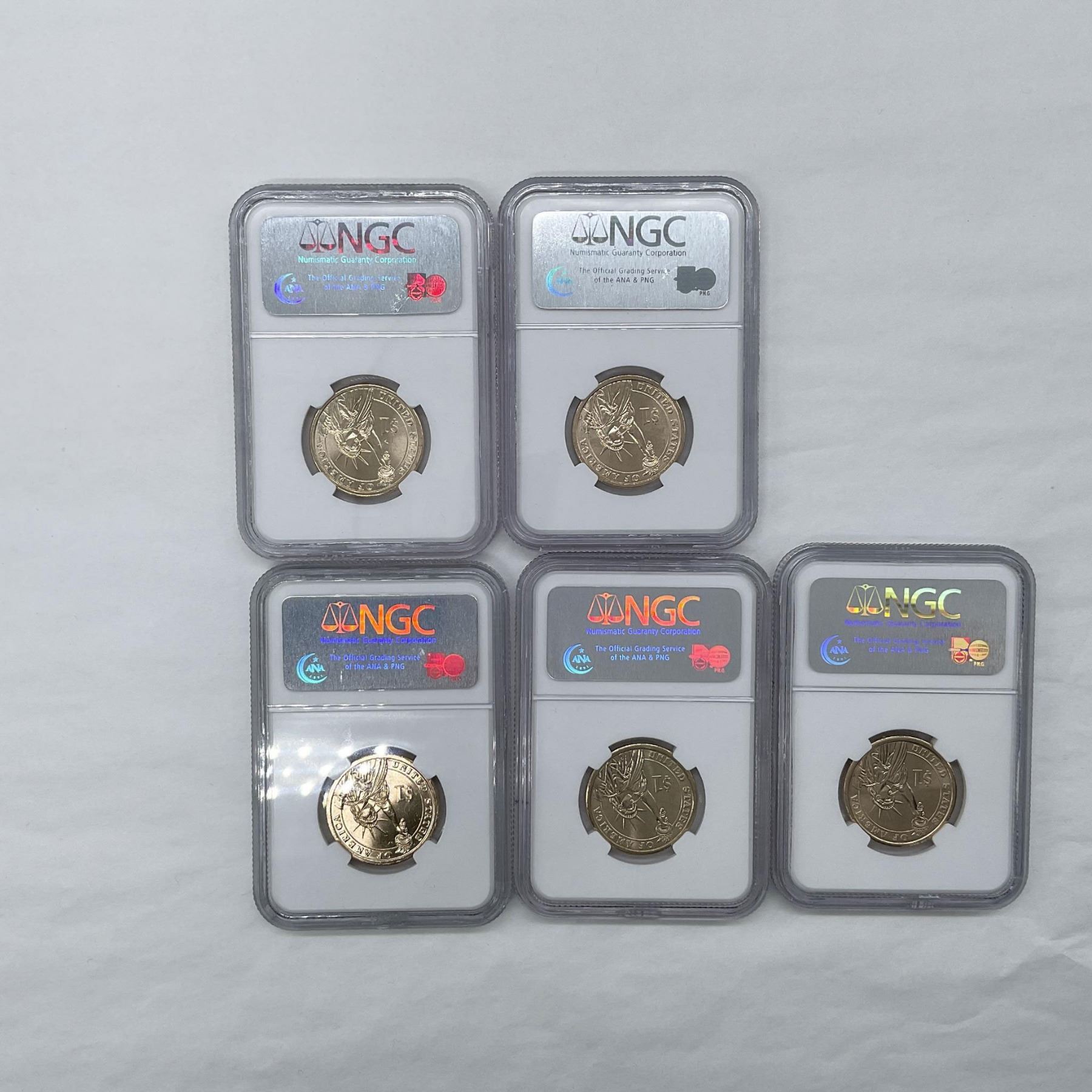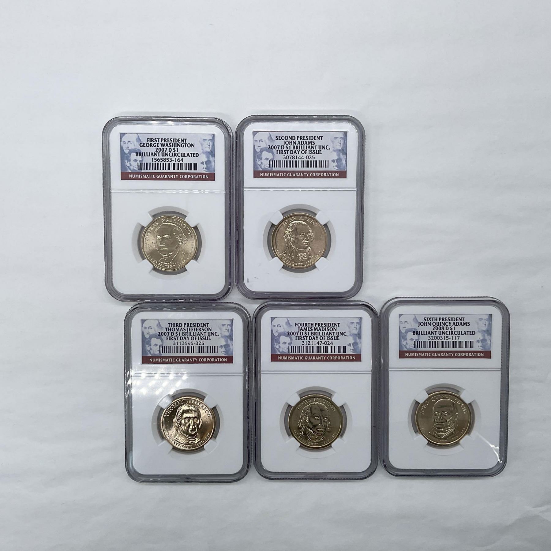Each coin is NGC Graded. Includes 2007 Denver Mint First President George Washington, Slabbed Brilliant Uncirculated; 2007 Denver Mint Second President John Adams, Slabbed Brilliant Uncirculated, First Day Of Issue; 2007 Denver Mint Third President Thomas Jefferson, Slabbed Brilliant Uncirculated, First Day Of Issue; 2007 Denver Mint Fourth President James Madison, Slabbed Brilliant Uncirculated, First Day Of Issue; and 2008 Denver Mint Sixth President John Quincy Adams, Slabbed Brilliant Uncirculated. Each coin obverse side depicts the profile of the presidents, and the reverse side features the Statue of Liberty. Each coin are in a protective case. A case is approximately: 2.25"L x 0.5"W x 3.25"H.