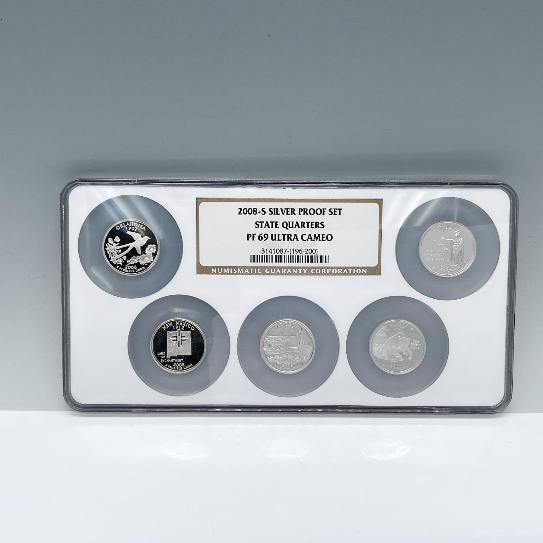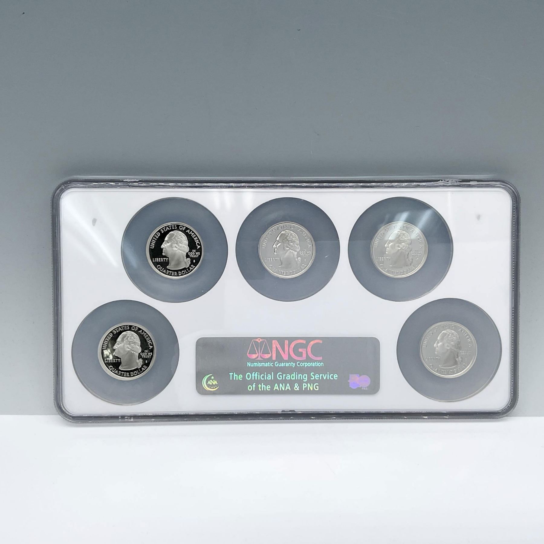 Slabbed PF69 Ultra Cameo. San Francisco Mint. The set includes Oklahoma, New Mexico, Arizona, Alaska, and Hawaii. Each quarter obverse side depicts the profile of George Washington looking left. Oklahoma State Quarter reverse side features the state bird, Scissortail Flycatcher, over the state wildflower, the Indian Blanket. New Mexico State Quarter reverse side depicts a Zia sun symbol over a topographical outline of the State. Arizona State Quarter reverse side shows the Grand Canyon with a Saguaro cactus. Alaska State Quarter reverse side depicts a grizzly bear with a salmon in its jaw. The Hawaii State Quarter reverse side features Hawaiian monarch King Kamehameha I. The coins are in a protective case. The case is approximately: 7.75"L x 0.5"W x 4"H.
