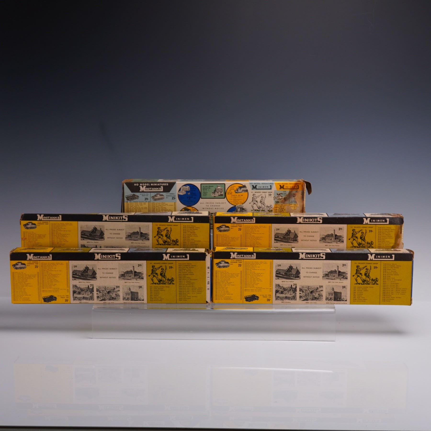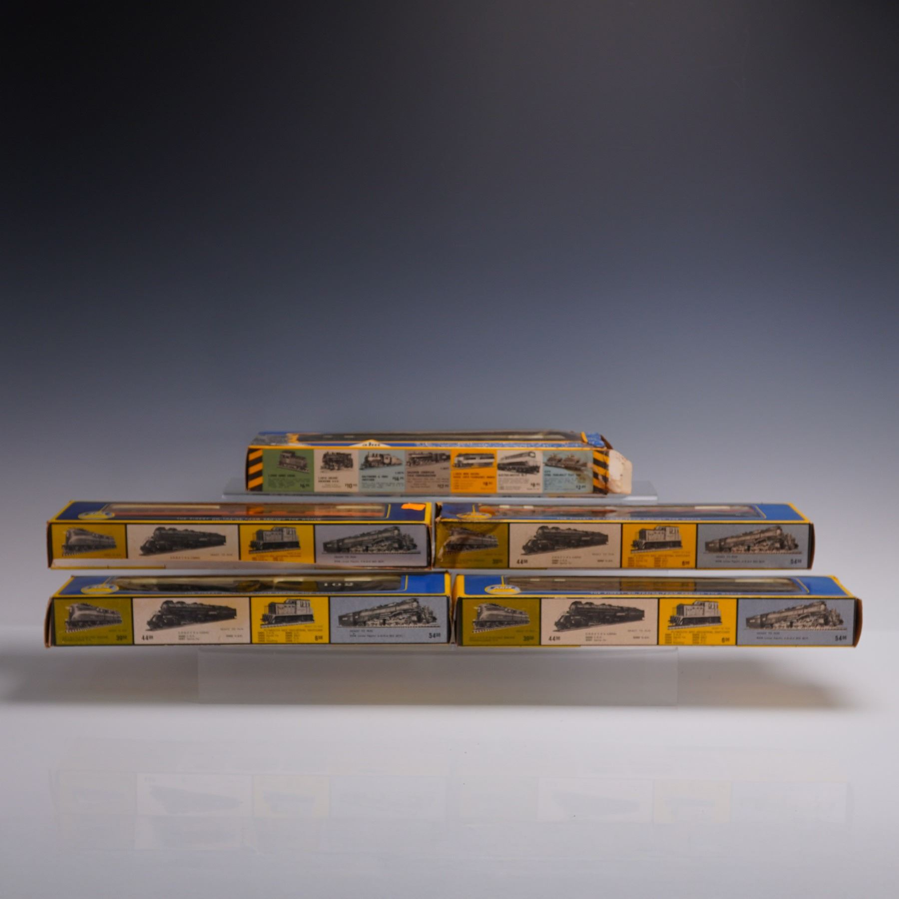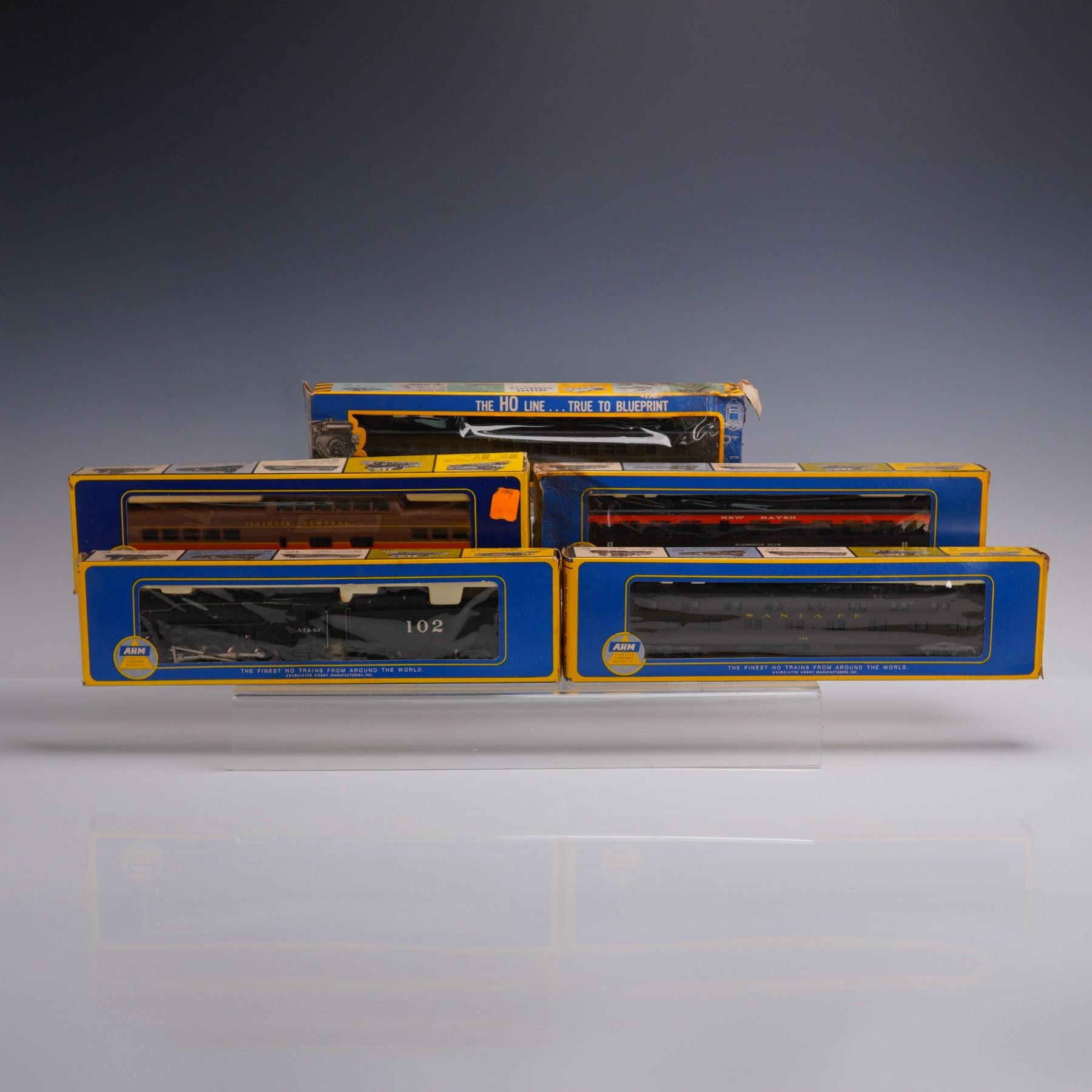 Lot of five vintage AHM HO scale model railroad cars, each presented in original blue-and-yellow packaging. This assortment includes passenger and freight cars from various road names and styles, notably steam-era passenger coaches and freight cars. All appear well-preserved, with packaging exhibiting moderate wear from age and storage. Ideal pieces for collectors and HO scale enthusiasts.