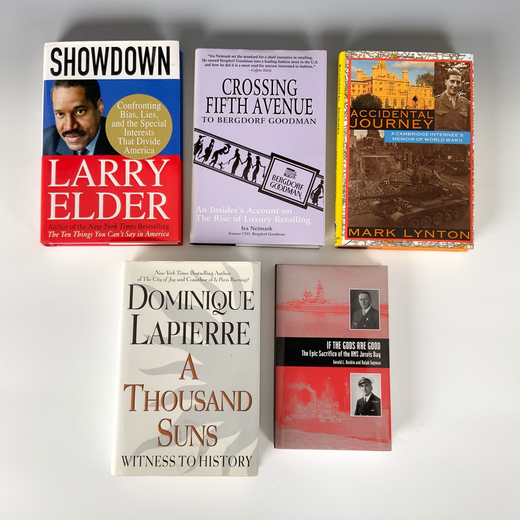 This lot features a collection of five hardcover books spanning history, memoirs, politics, and business. Included are If the Gods Are Good by Stephen R. Donaldson, A Thousand Suns by Dominique Lapierre, Accidental Journey: A Cambridge Internee's Memoir of World War II by Mark Lynton, Crossing Fifth Avenue to Bergdorf Goodman: An Insider's Account on the Rise of Luxury Retailing by Ira Neimark, and Showdown by Larry Elder. Largest book measures 9.5"H.