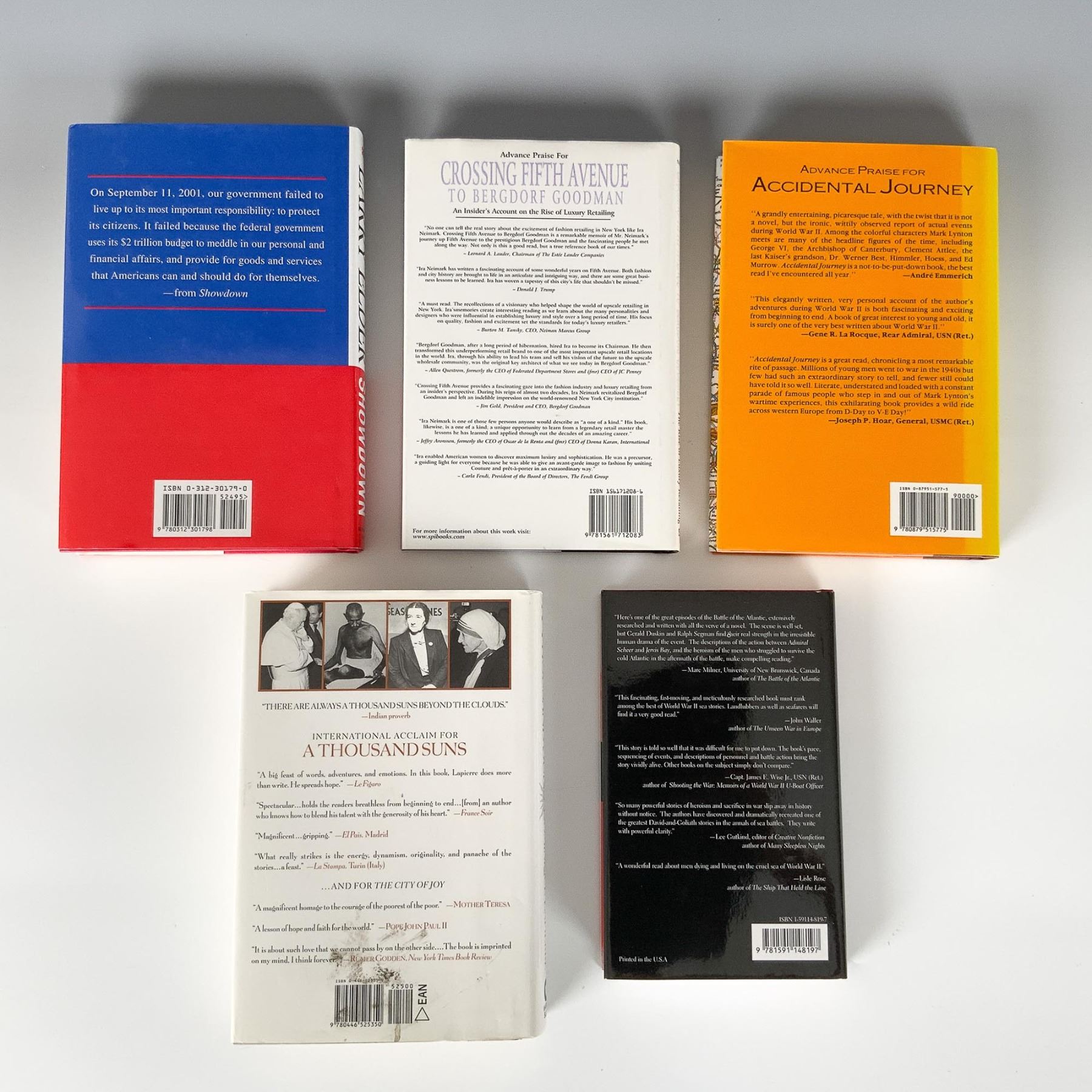 This lot features a collection of five hardcover books spanning history, memoirs, politics, and business. Included are If the Gods Are Good by Stephen R. Donaldson, A Thousand Suns by Dominique Lapierre, Accidental Journey: A Cambridge Internee’s Memoir of World War II by Mark Lynton, Crossing Fifth Avenue to Bergdorf Goodman: An Insider’s Account on the Rise of Luxury Retailing by Ira Neimark, and Showdown by Larry Elder. Largest book measures 9.5"H.