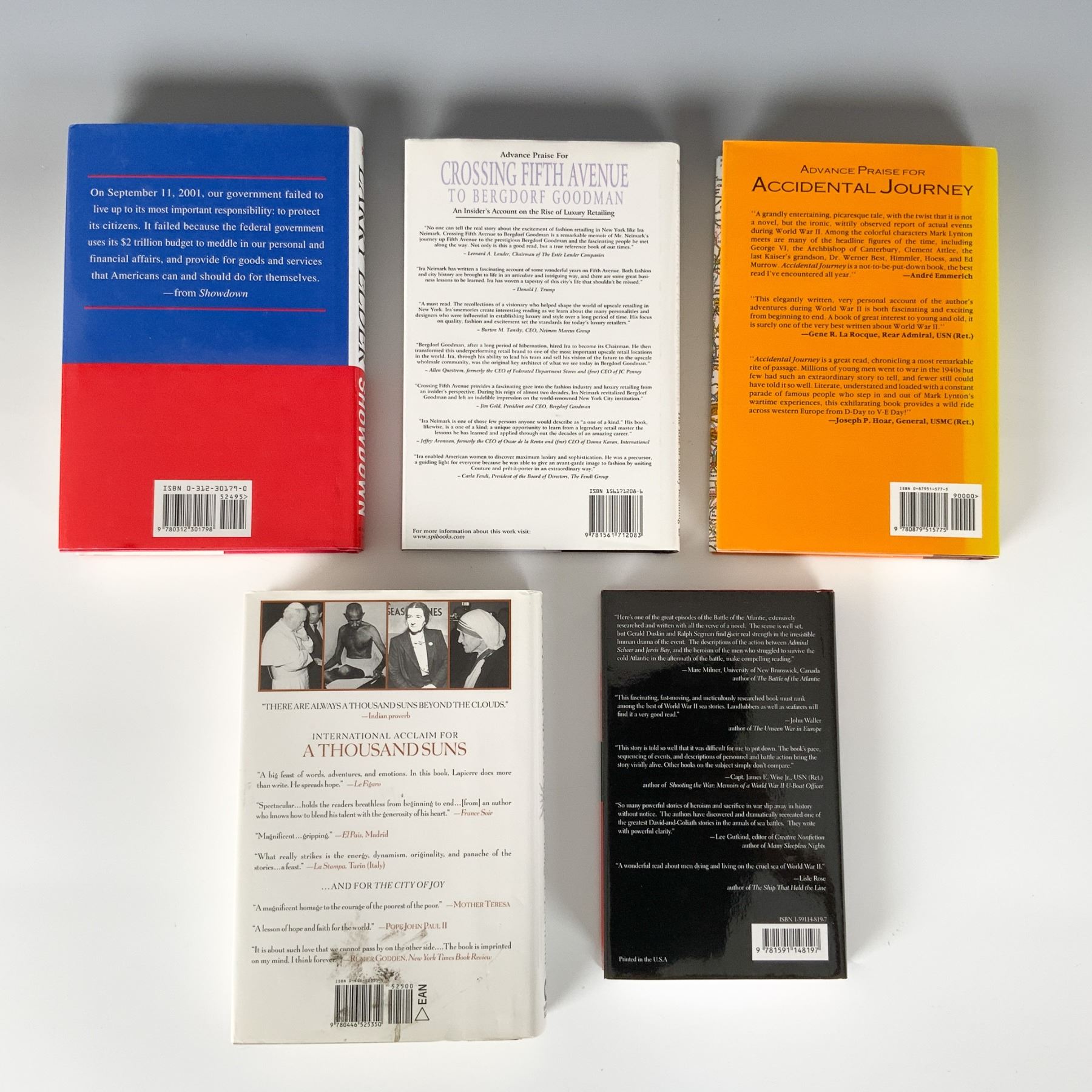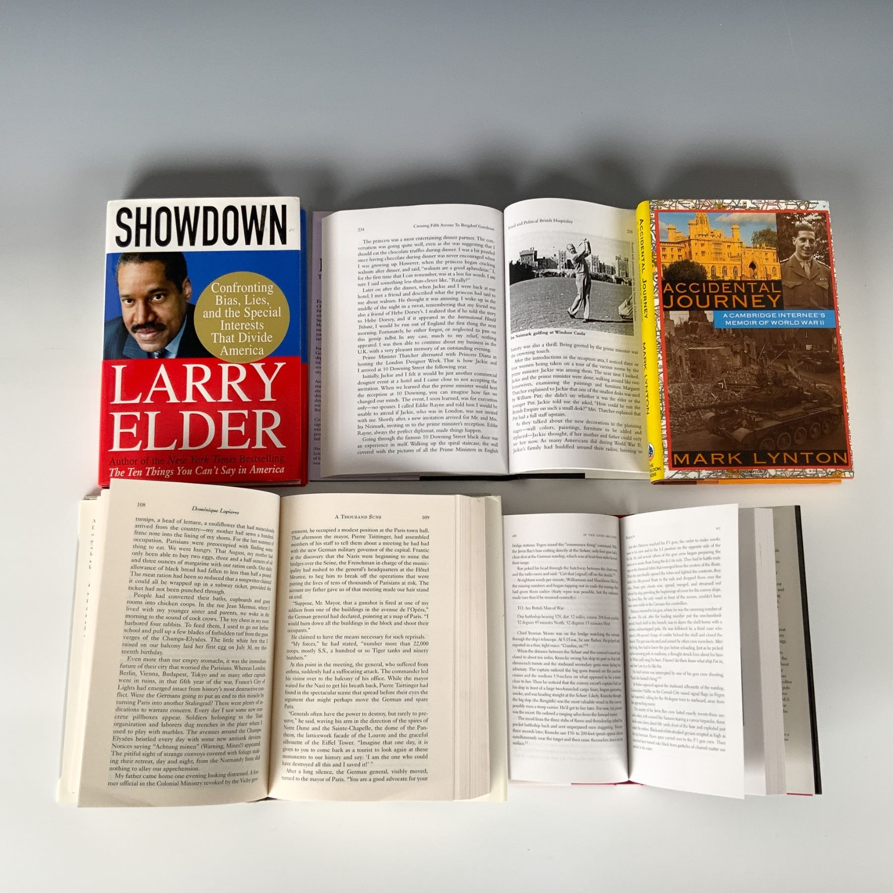 This lot features a collection of five hardcover books spanning history, memoirs, politics, and business. Included are If the Gods Are Good by Stephen R. Donaldson, A Thousand Suns by Dominique Lapierre, Accidental Journey: A Cambridge Internee's Memoir of World War II by Mark Lynton, Crossing Fifth Avenue to Bergdorf Goodman: An Insider's Account on the Rise of Luxury Retailing by Ira Neimark, and Showdown by Larry Elder. Largest book measures 9.5"H.