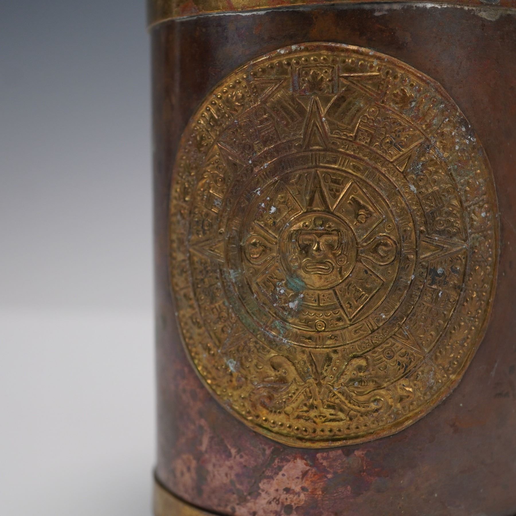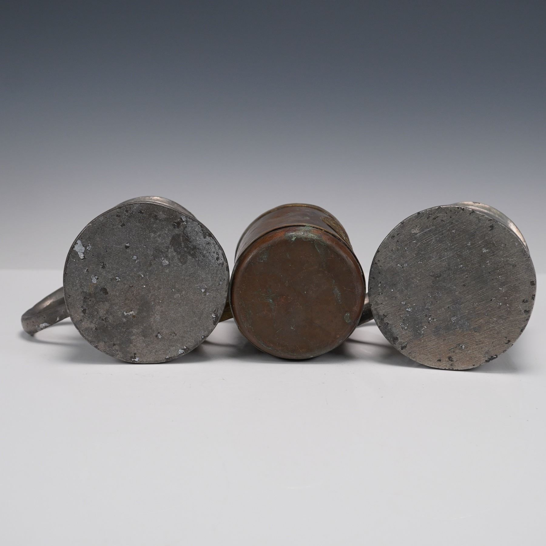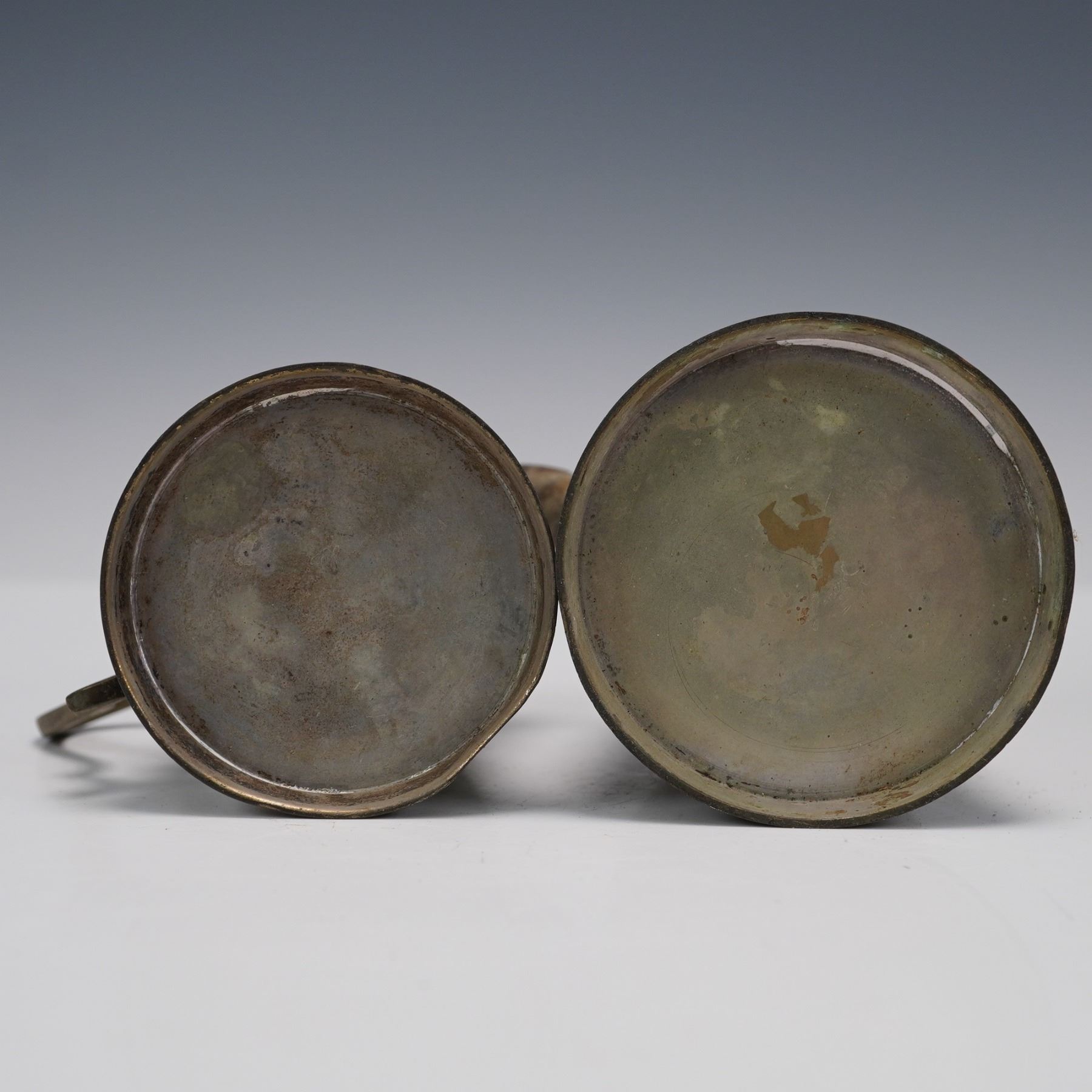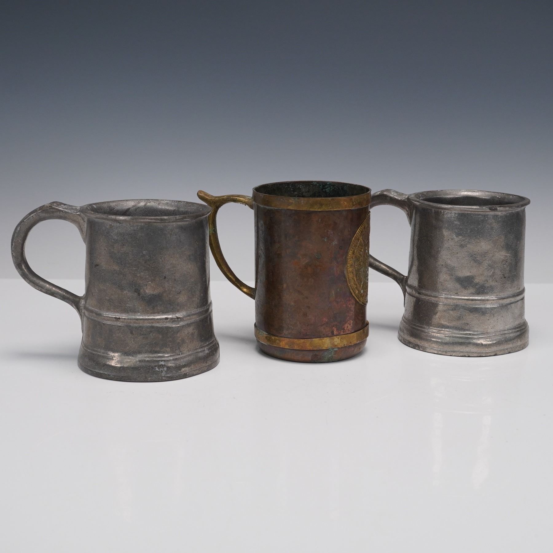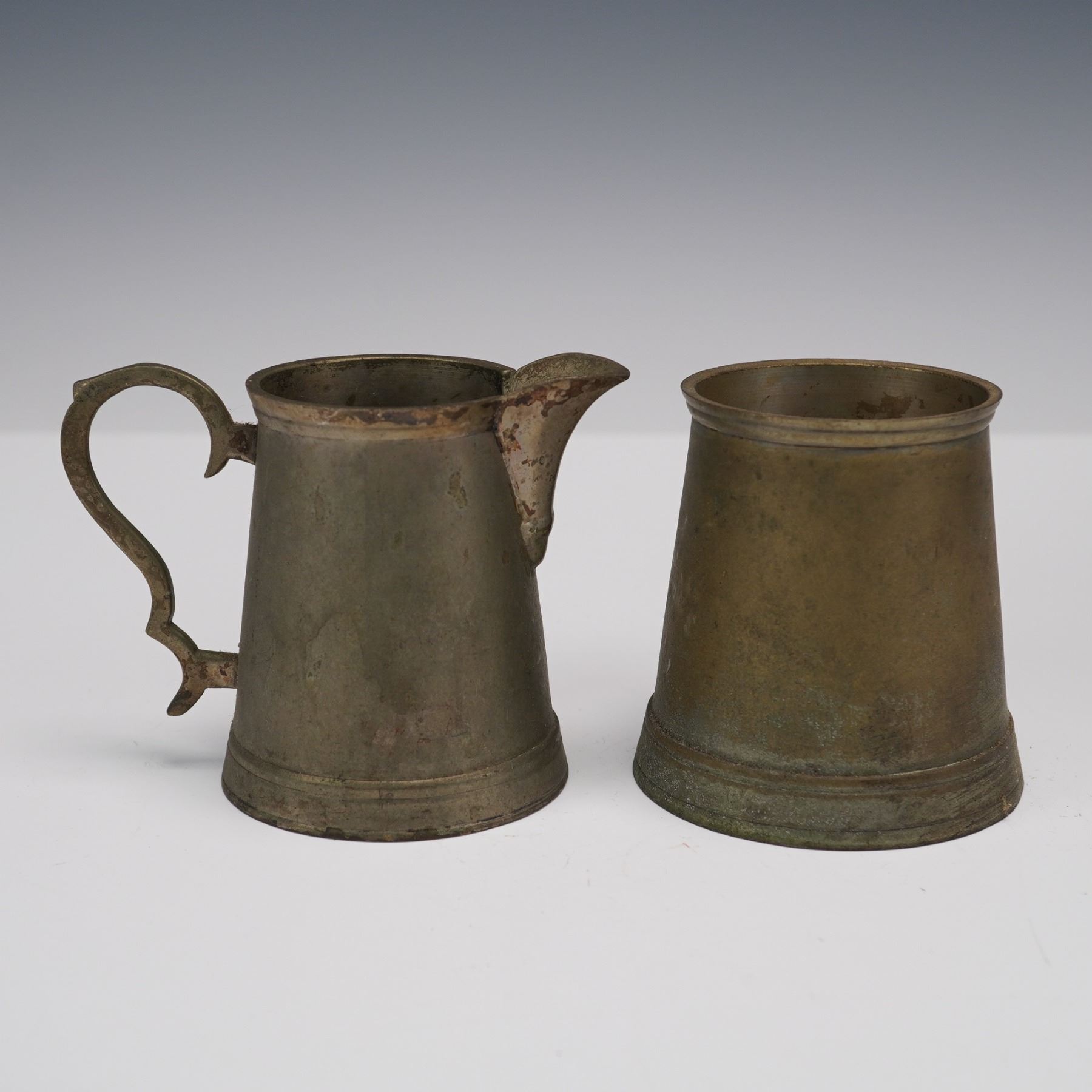 A group of five assorted metal drinking and pouring vessels, including two antique taper-form pewter mugs with applied handles, one mid-20th century brass or bronze mug with a decorative medallion, one small brass or bronze creamer with arched handle and molded spout, and one small matching cup with flared rim. A few pieces are marked EPNS (Electro Plated Nickel Silver).