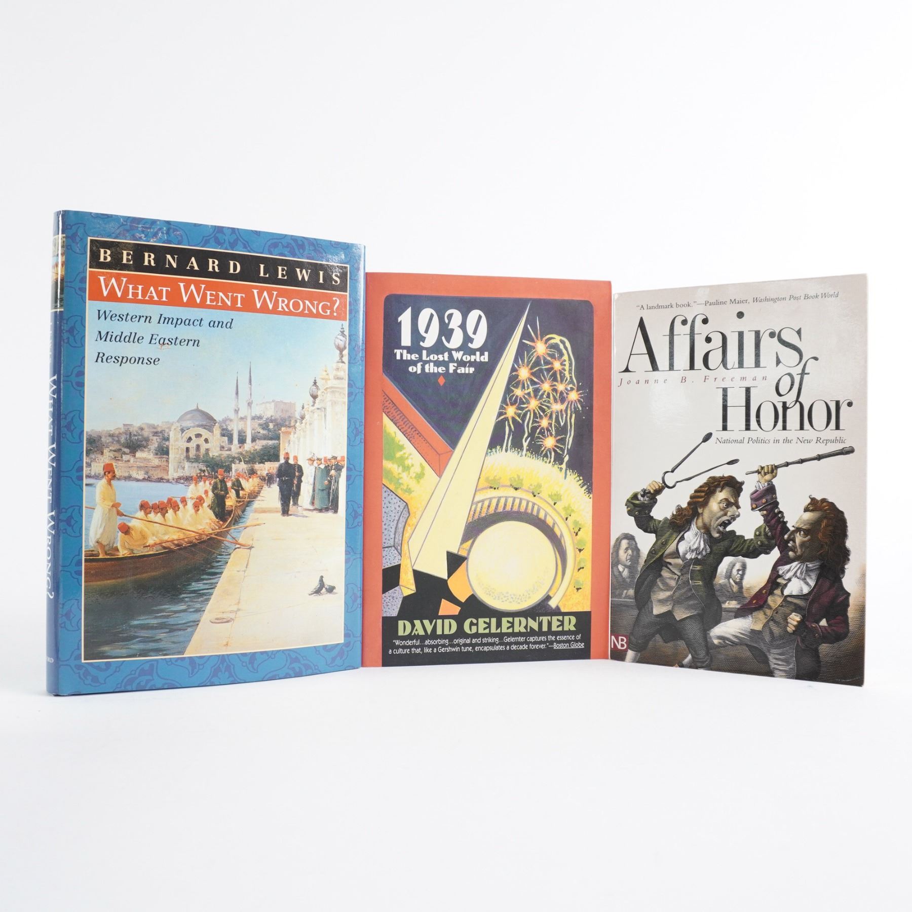 This collection of five books explores pivotal historical moments, cultural conflicts, and political transformations. 1776 by David McCullough provides a gripping account of the American Revolution. Postville: A Clash of Cultures in Heartland America by Stephen G. Bloom examines the cultural tensions between an Orthodox Jewish community and rural Iowans. 1939: The Lost World of the Fair by David Gelernter captures the optimism and challenges of pre-WWII America. Affairs of Honor analyzes early American political culture and dueling traditions. What Went Wrong? by Bernard Lewis investigates the decline of the Middle East in relation to Western progress. A compelling collection for history enthusiasts, scholars, and readers interested in global and American conflicts. Largest book measures 9.5"H.
