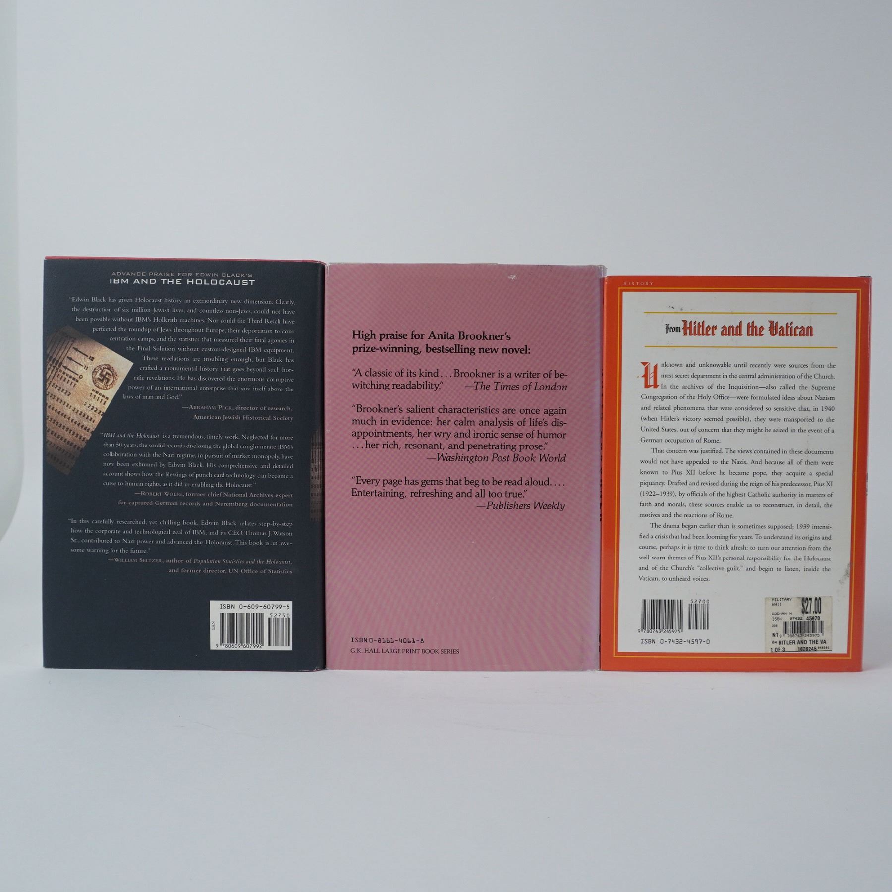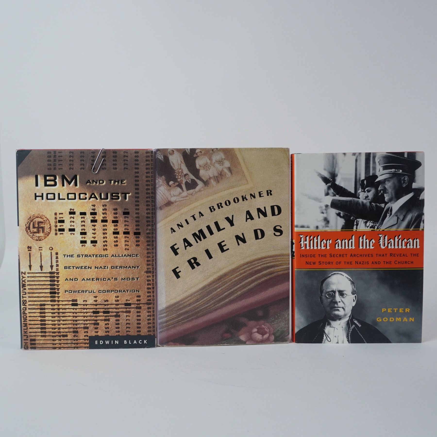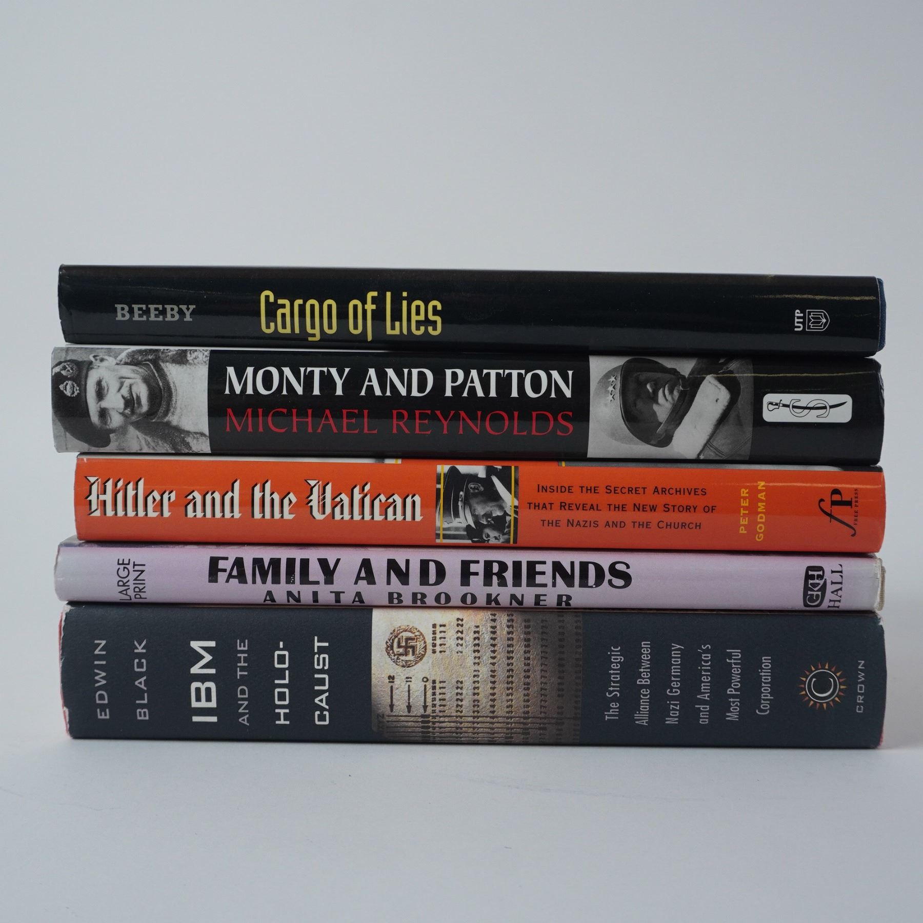 This collection of five hardcover books offers a deep dive into history, politics, and personal narratives, making it an excellent addition for collectors and enthusiasts. Cargo of Lies by Dean Beeby investigates historical deception and espionage, uncovering hidden truths from World War II. Monty and Patton by Michael Reynolds provides a compelling analysis of two of the most influential generals of the war, exploring their leadership styles and impact. Hitler and the Vatican examines the controversial relationship between Nazi Germany and the Catholic Church, shedding light on political and religious dynamics of the era. Family and Friends by Anita Brookner is a poignant novel that delves into the intricacies of family relationships, personal history, and identity. IBM and the Holocaust by Edwin Black presents a critical exploration of IBM's role in Nazi Germany, raising important ethical questions about corporate involvement in history. Together, these books provide a fascinating blend of historical analysis, military strategy, political intrigue, and literary depth. Largest book measures 9.5"H.