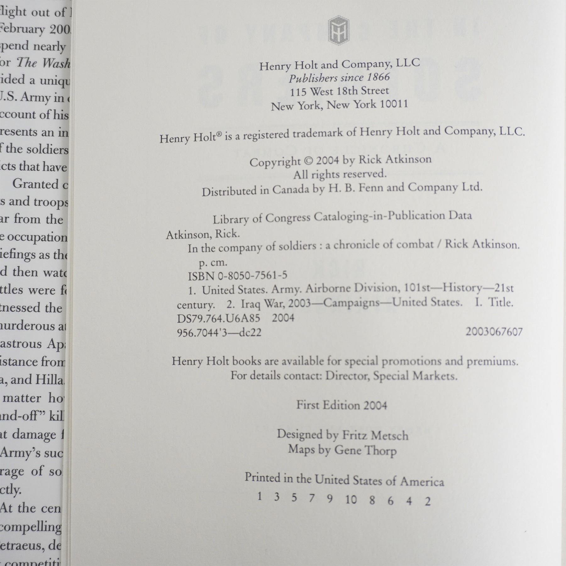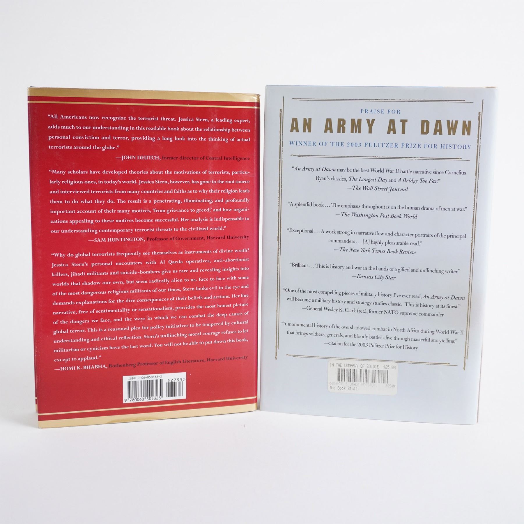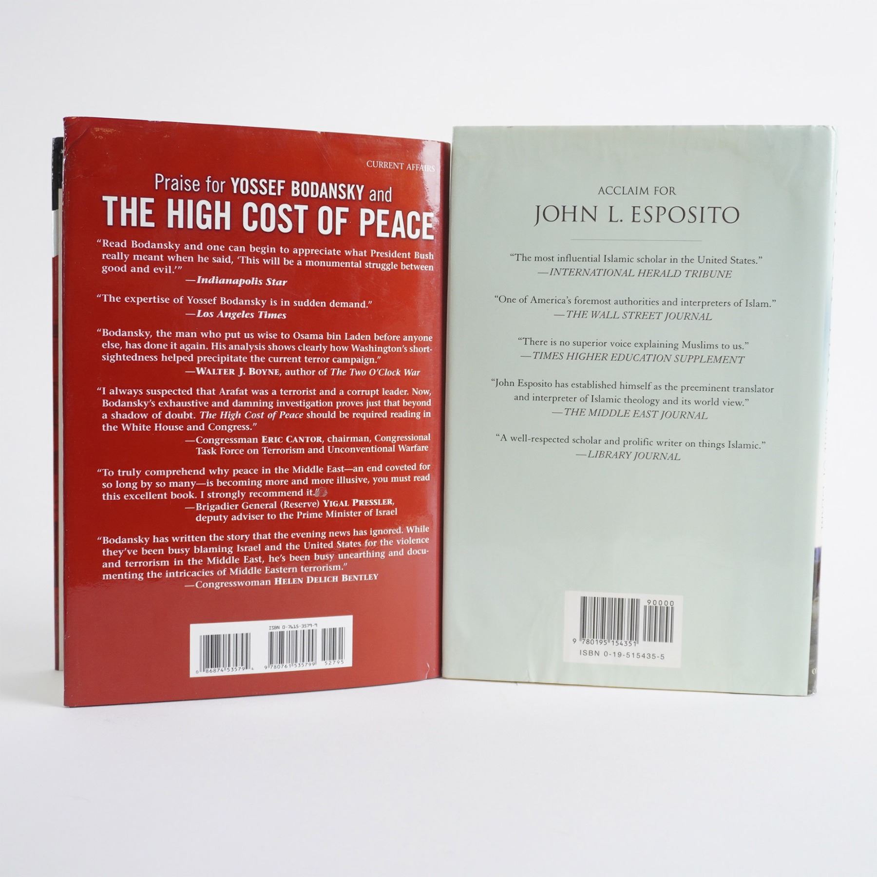 This lot includes five books that delve into war, terrorism, and Middle Eastern conflicts, offering a mix of journalistic accounts, scholarly analysis, and geopolitical perspectives. In the Company of Soldiers by Rick Atkinson provides a first-hand narrative of the Iraq War from an award-winning journalist. Terror in the Name of God: Why Religious Militants Kill by Jessica Stern examines the motivations behind religious terrorism. Unholy War: Terror in the Name of Islam by John L. Esposito offers a scholarly analysis of terrorism and its connection to Islam. The High Cost of Peace by Yossef Bodansky explores Middle Eastern politics and the Israeli-Palestinian conflict, while Atlas of the Middle East by National Geographic presents a visual and historical guide to the region. This collection is ideal for researchers, history enthusiasts, and those interested in contemporary global conflicts. Largest book measures 11"H.