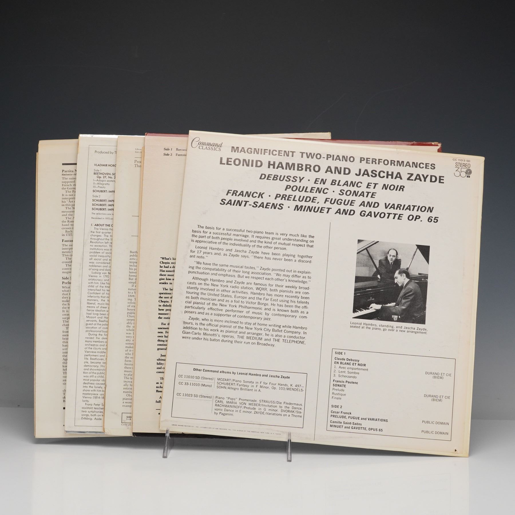 This 5-piece lot features recordings such as Landowska Plays Bach, Leonid Hambro and Jascha Zayde: Magnificent Two-Piano Performances, Horowitz: Beethoven Moonlight Sonata, Serkin: Beethoven Fourth Piano Concerto, and Arthur Rubinstein Plays Chopin. Each record is housed in its original jacket with inner sleeve, representing renowned pianists and recordings from major classical labels. A distinguished collection showcasing exceptional performances from some of the 20th century's most celebrated masters of the piano.