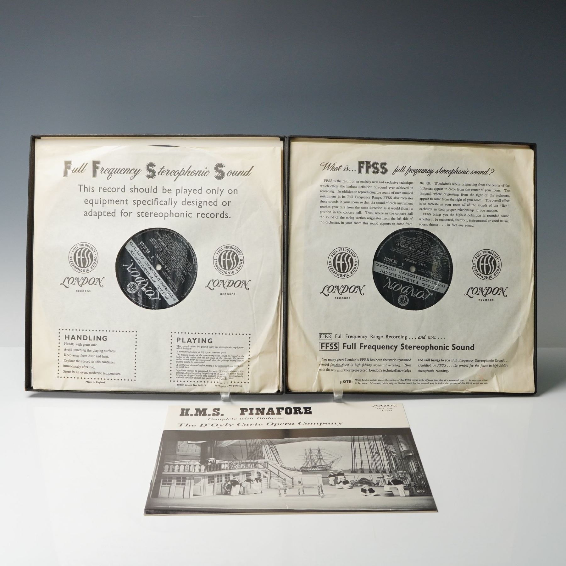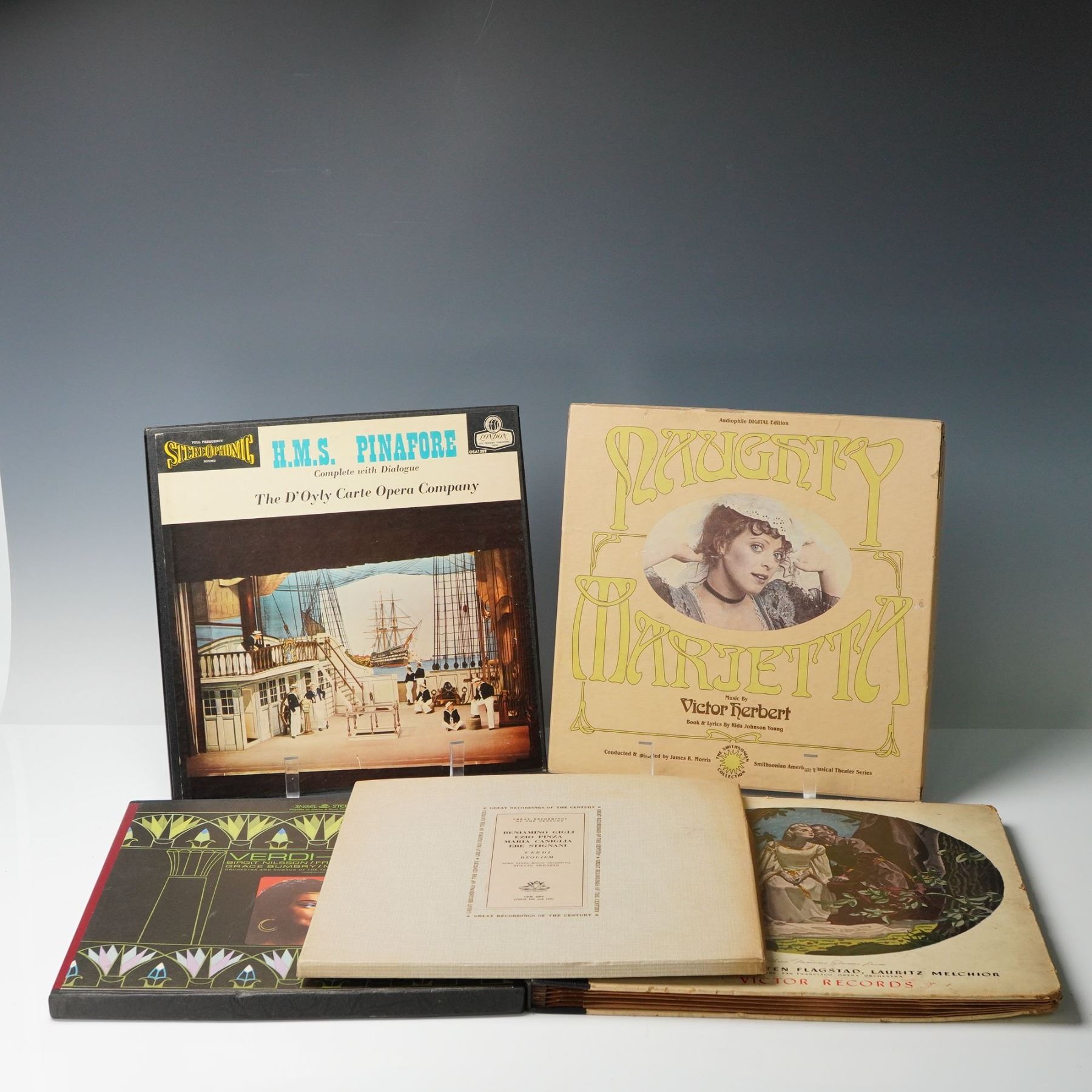 A collection of five vintage classical vinyl records featuring notable operatic and theatrical works. Included are "H.M.S. Pinafore" performed by The D'Oyly Carte Opera Company on the London Records label, complete with dialogue; "Naughty Marietta" by Victor Herbert, presented with booklet and artwork; "Aida" by Giuseppe Verdi, an Angel Records release accompanied by insert and multiple LPs; a recording of Wagner arias featuring Kirsten Flagstad and Lauritz Melchior on Victor Records; and a compilation from the "Great Recordings of the Century" series by Angel Records showcasing performances by Maria Caniglia, Ebe Stignani, Beniamino Gigli, and Ezio Pinza. Each album is housed in its original sleeve or box, several including detailed program notes and illustrated inserts. Model numbers where visible: Angel AV 3610, London Records FFSS.