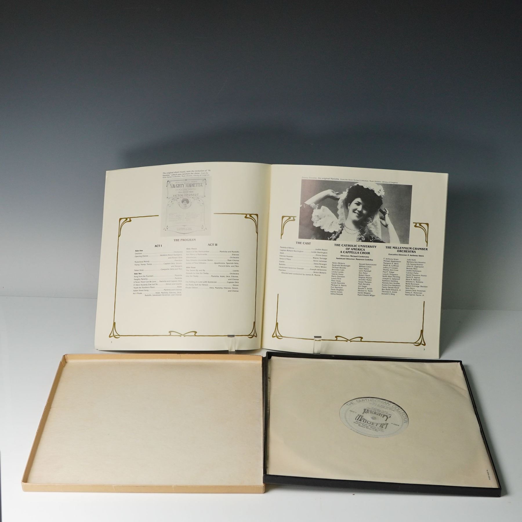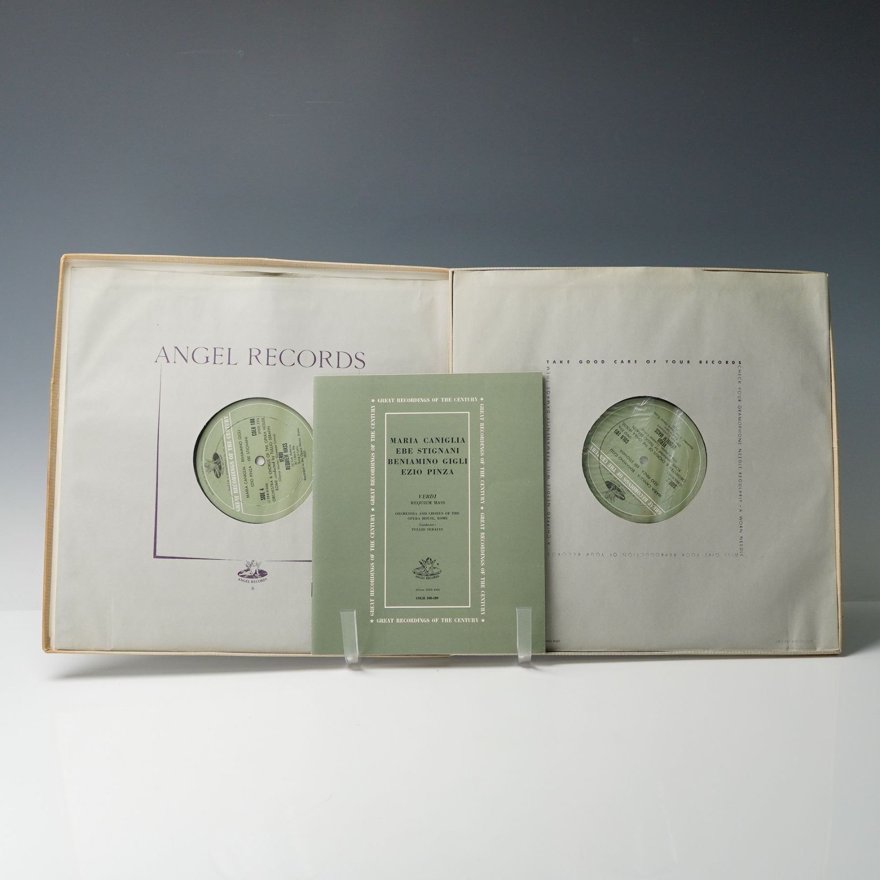 A collection of five vintage classical vinyl records featuring notable operatic and theatrical works. Included are "H.M.S. Pinafore" performed by The D'Oyly Carte Opera Company on the London Records label, complete with dialogue; "Naughty Marietta" by Victor Herbert, presented with booklet and artwork; "Aida" by Giuseppe Verdi, an Angel Records release accompanied by insert and multiple LPs; a recording of Wagner arias featuring Kirsten Flagstad and Lauritz Melchior on Victor Records; and a compilation from the "Great Recordings of the Century" series by Angel Records showcasing performances by Maria Caniglia, Ebe Stignani, Beniamino Gigli, and Ezio Pinza. Each album is housed in its original sleeve or box, several including detailed program notes and illustrated inserts. Model numbers where visible: Angel AV 3610, London Records FFSS.