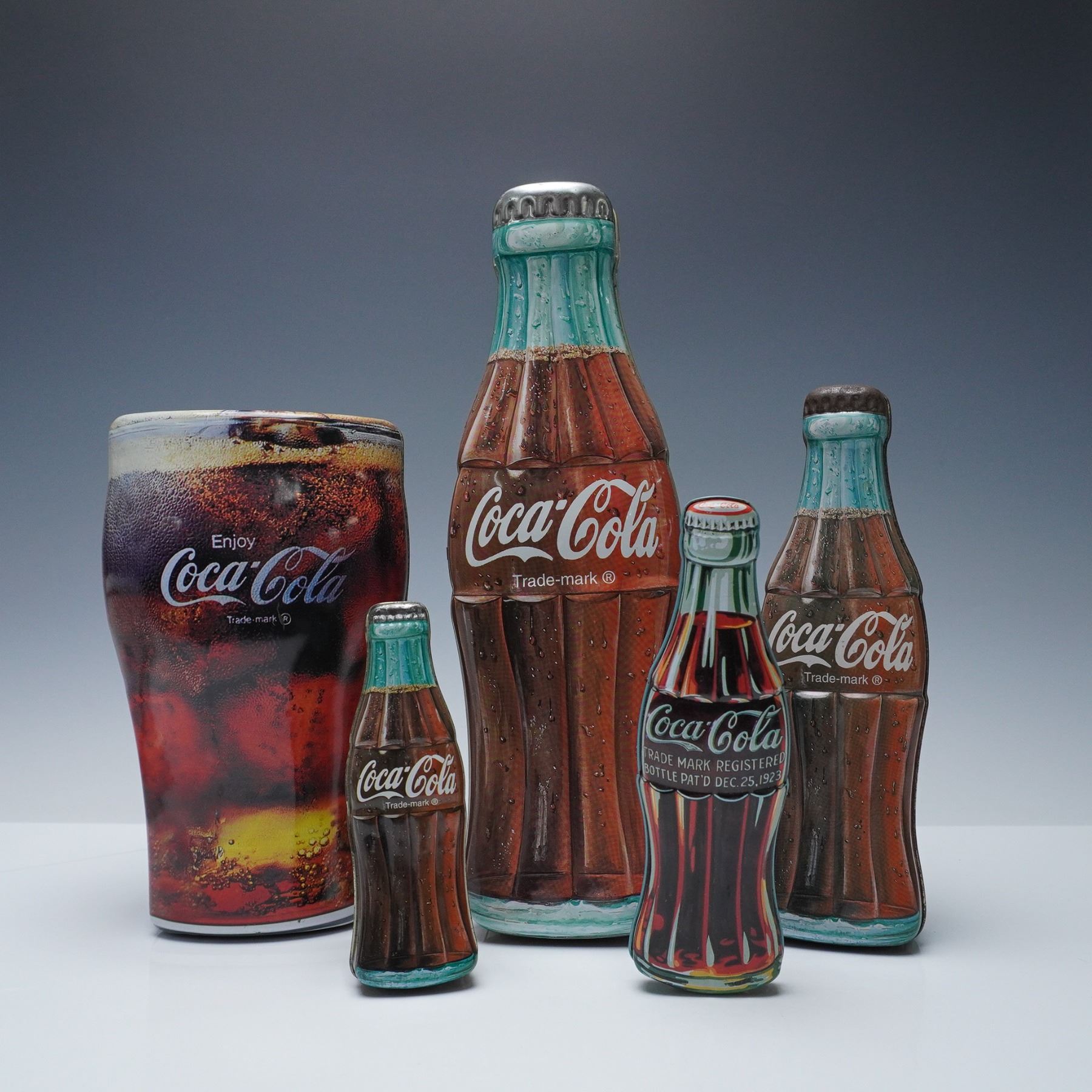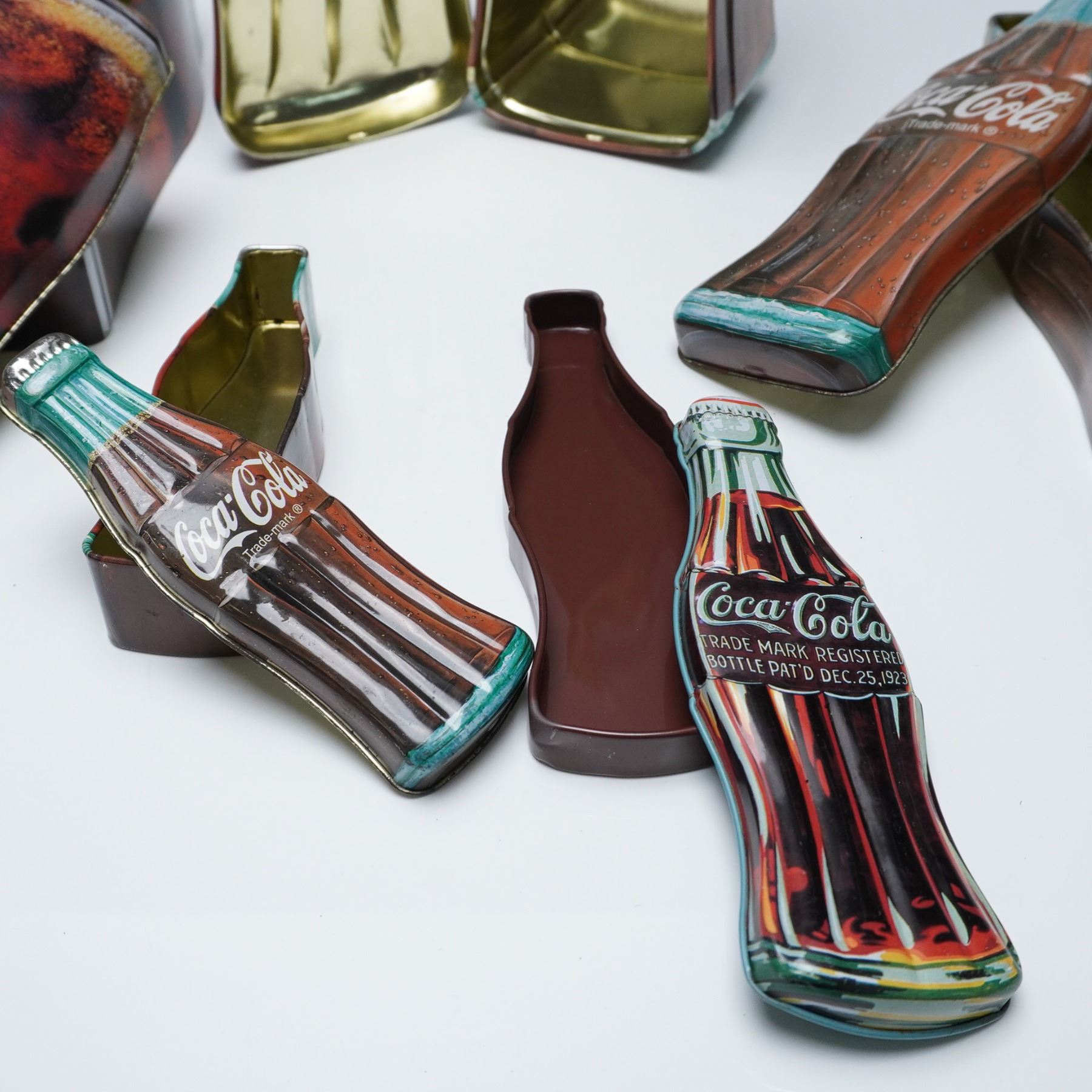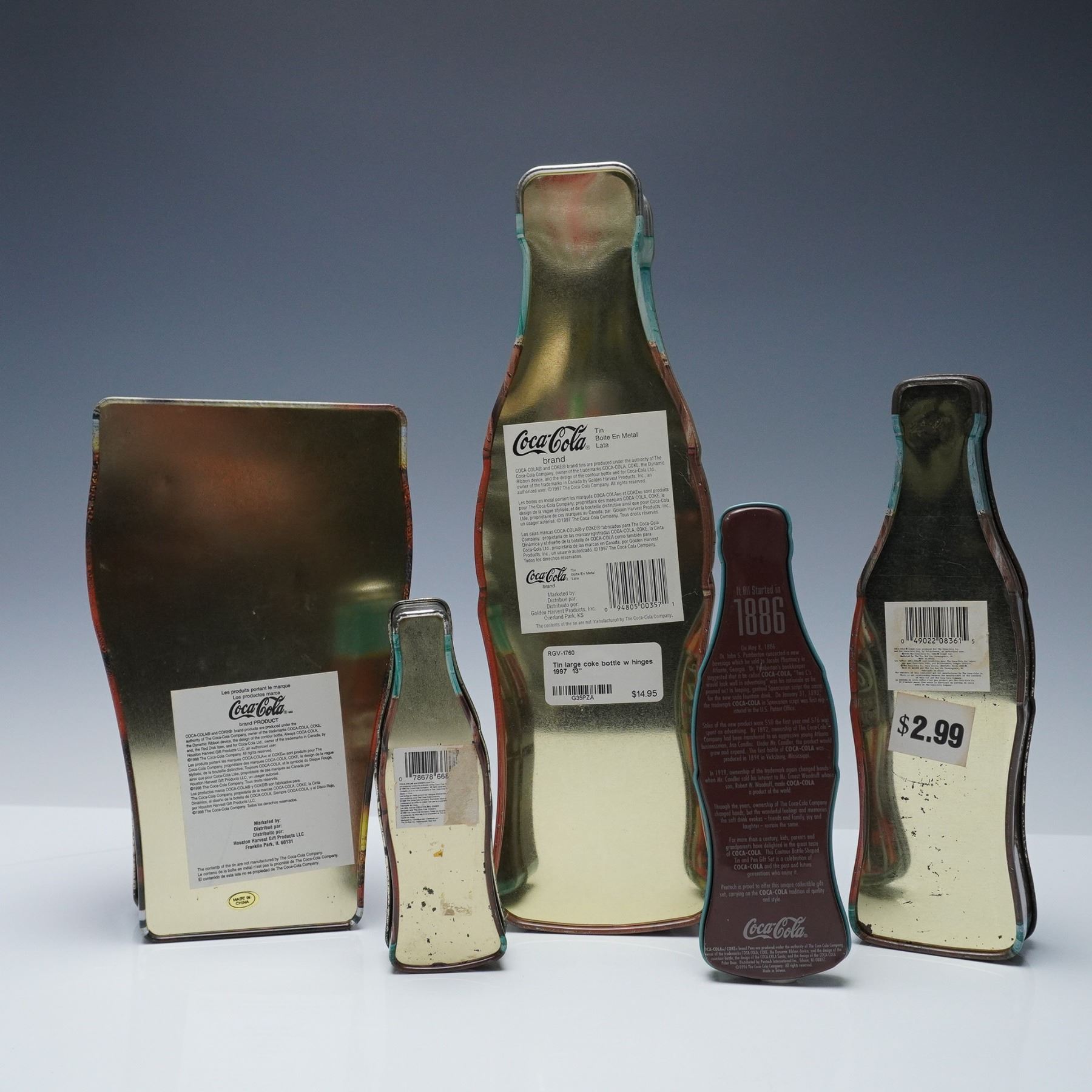 Set of five Coca-Cola themed tin containers, each shaped and printed to resemble vintage Coke bottles or a classic Coca-Cola glass. Includes a range of sizes and designs, featuring detailed artwork with embossed textures and official branding. One tin notes a bottle patent date of Dec. 25, 1923, and others include retro-style branding, with original pricing stickers visible on some. Largest piece measures 4"L x 3.5"W x 13"H.
