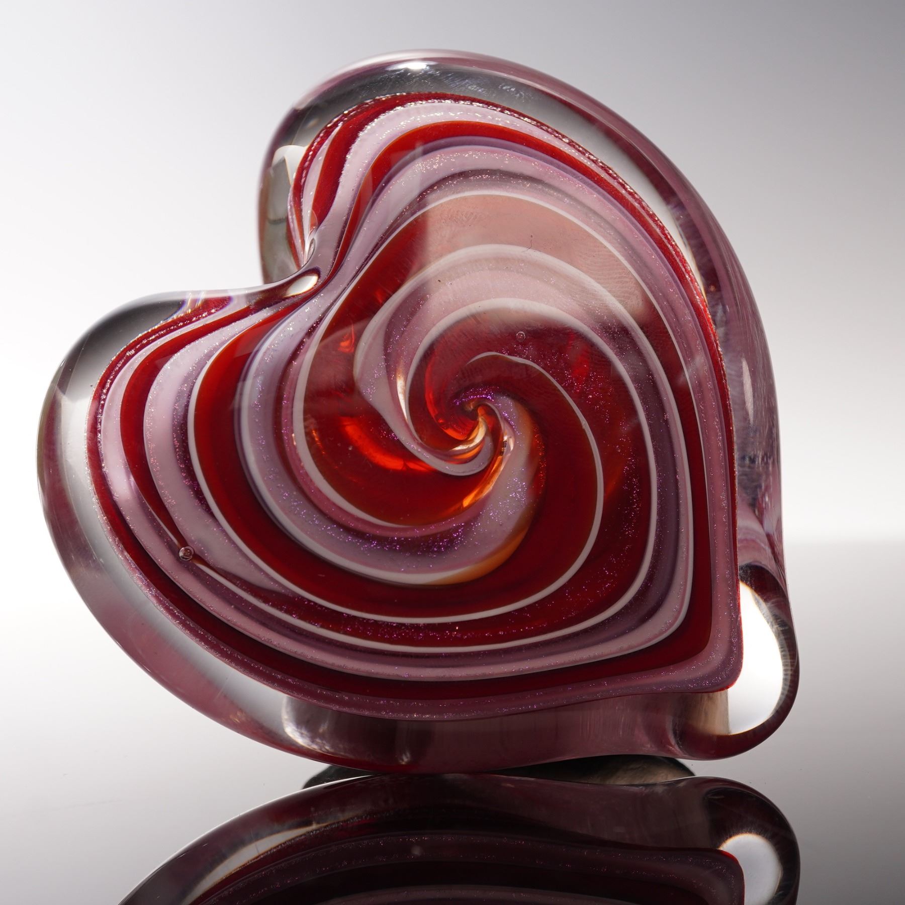 A group of five art glass heart paperweights in various colors and styles, including examples in cobalt blue with twisted ribbon core, green with clear casing, and red and white spiral design. Also includes a faceted clear glass heart and a signed Baccarat purple heart paperweight with etched signature to the base. A colorful and elegant collection showcasing diverse glass artistry, perfect for display or gifting.