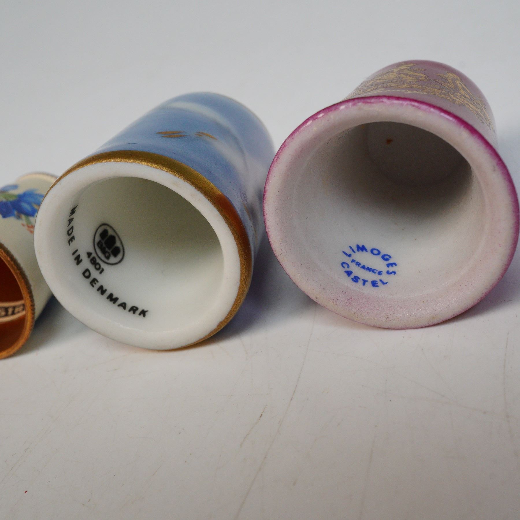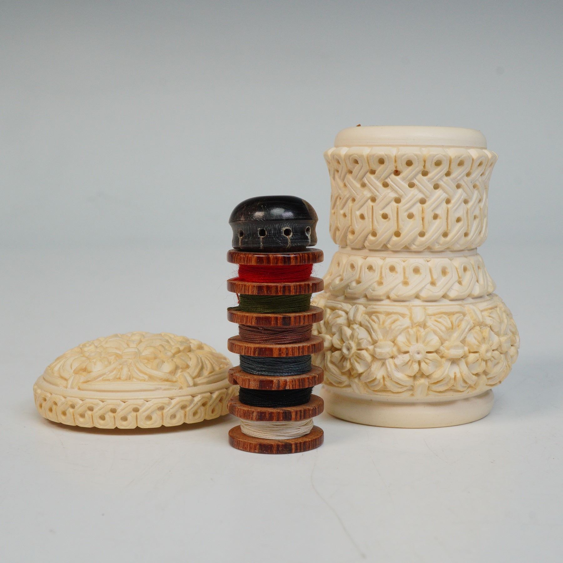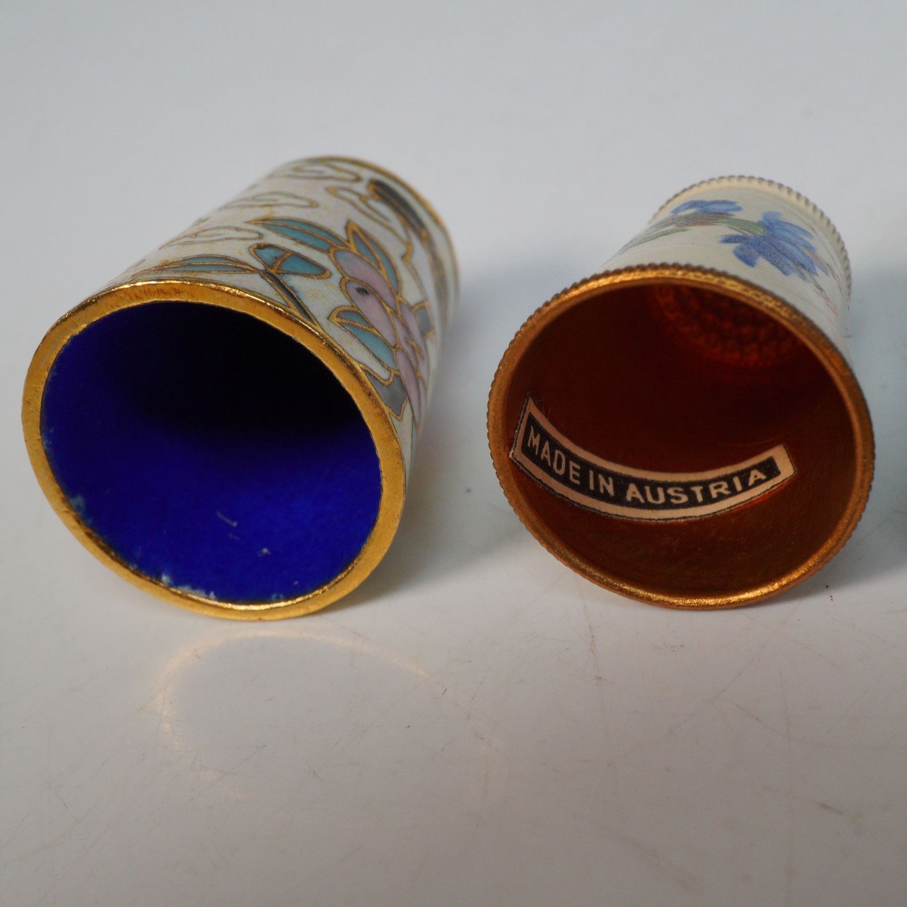 A charming collection featuring four fine thimbles and an intricately carved thread box. The thread box, signed S.A. for Sinan Atilla, displays masterful openwork carving with interlaced floral and geometric motifs, the lid and base decorated in a complementary design. Inside, the box holds a compact stack of wooden reels wound with colorful thread, showcasing its original purpose as a sewing accessory while also serving as a beautiful display piece. The accompanying thimbles each reflect the artistry of their respective origins: a hand-painted Limoges Castel thimble from France in rich pink enamel with gilt detail; a Danish porcelain example marked Made in Denmark with a serene sky-blue gradient and gold rim; an Austrian enamel thimble with intricate cloisonne floral design on a white ground; and another fine enameled floral thimble decorated in blue and gold tones. Together, these pieces form an elegant study in decorative craftsmanship across European porcelain and enamel traditions.