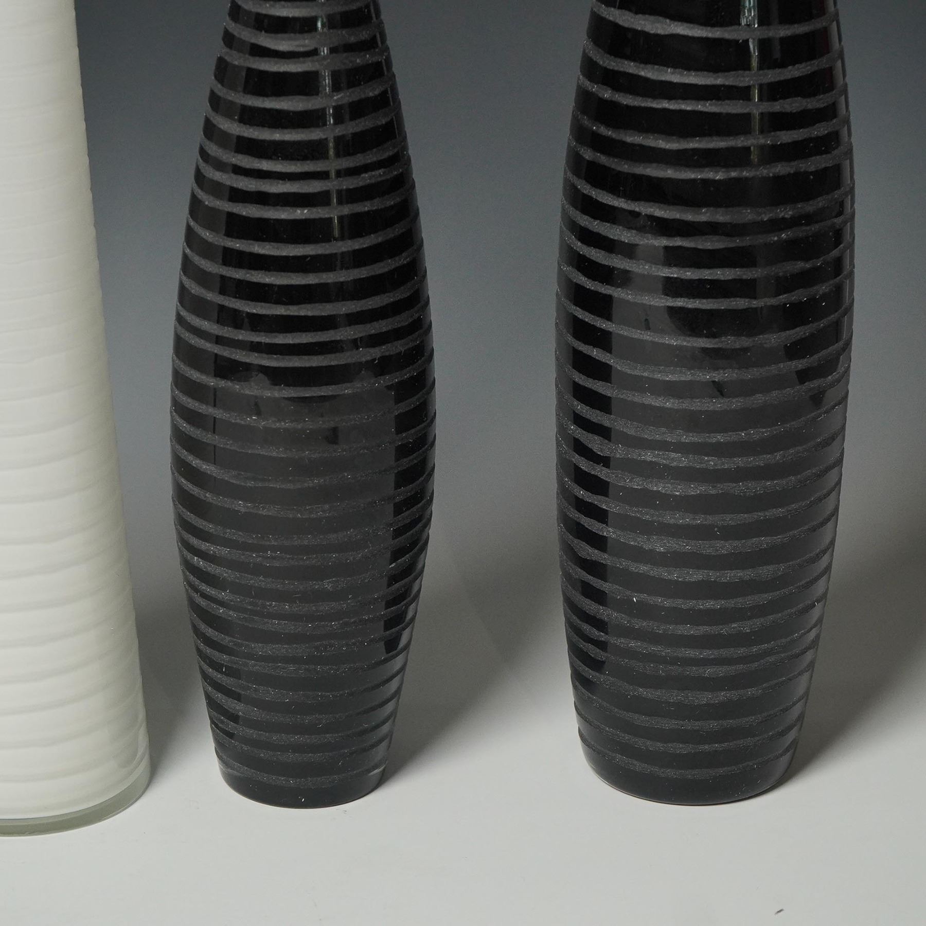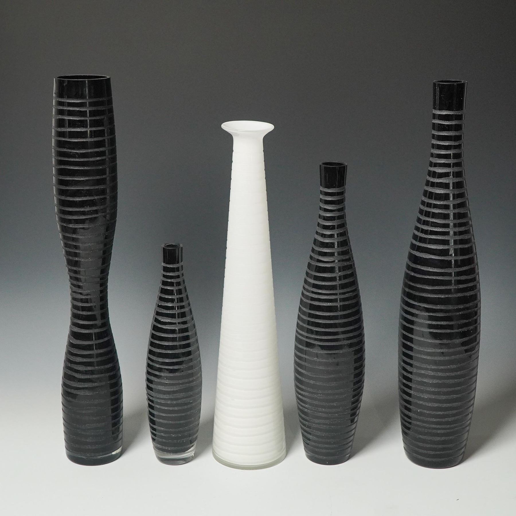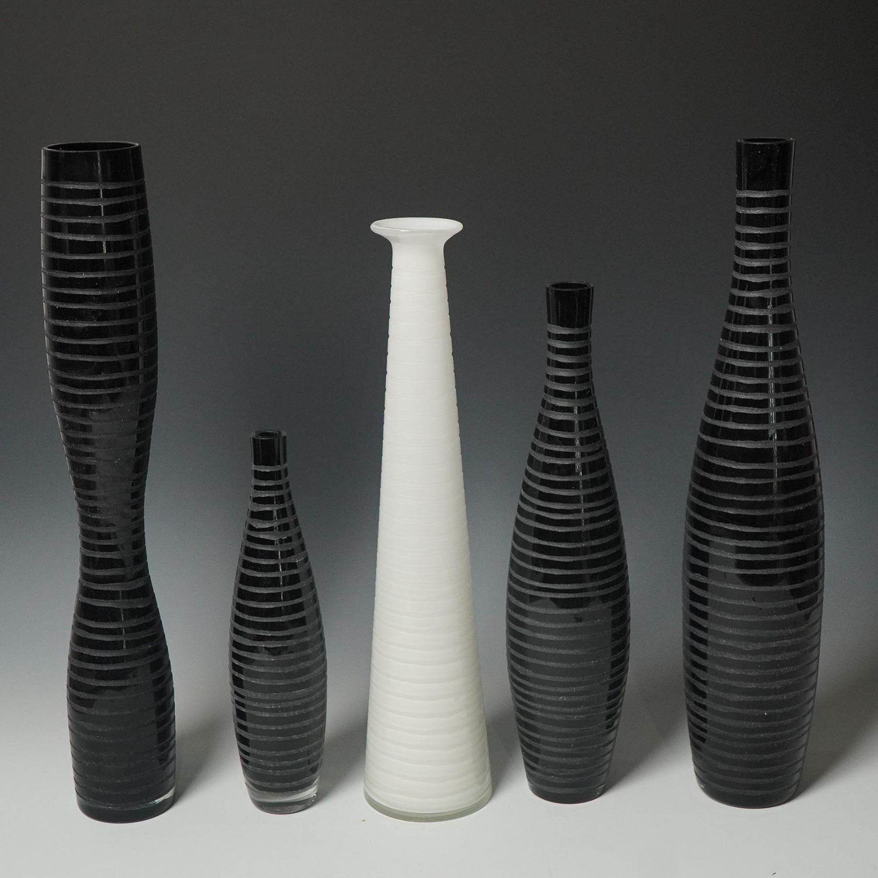 Group of five modern decorative glass vases, including four black vases with horizontal etched stripe patterns and one matte white vase with similar linear detail. Each piece features an elongated, tapered form and smooth finish, ranging in size from 11.75"H to 19.75"H. A striking and cohesive set ideal for minimalist or modern interiors.