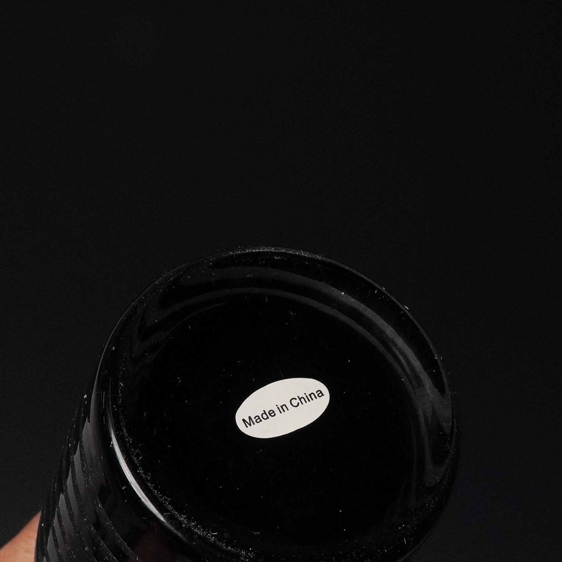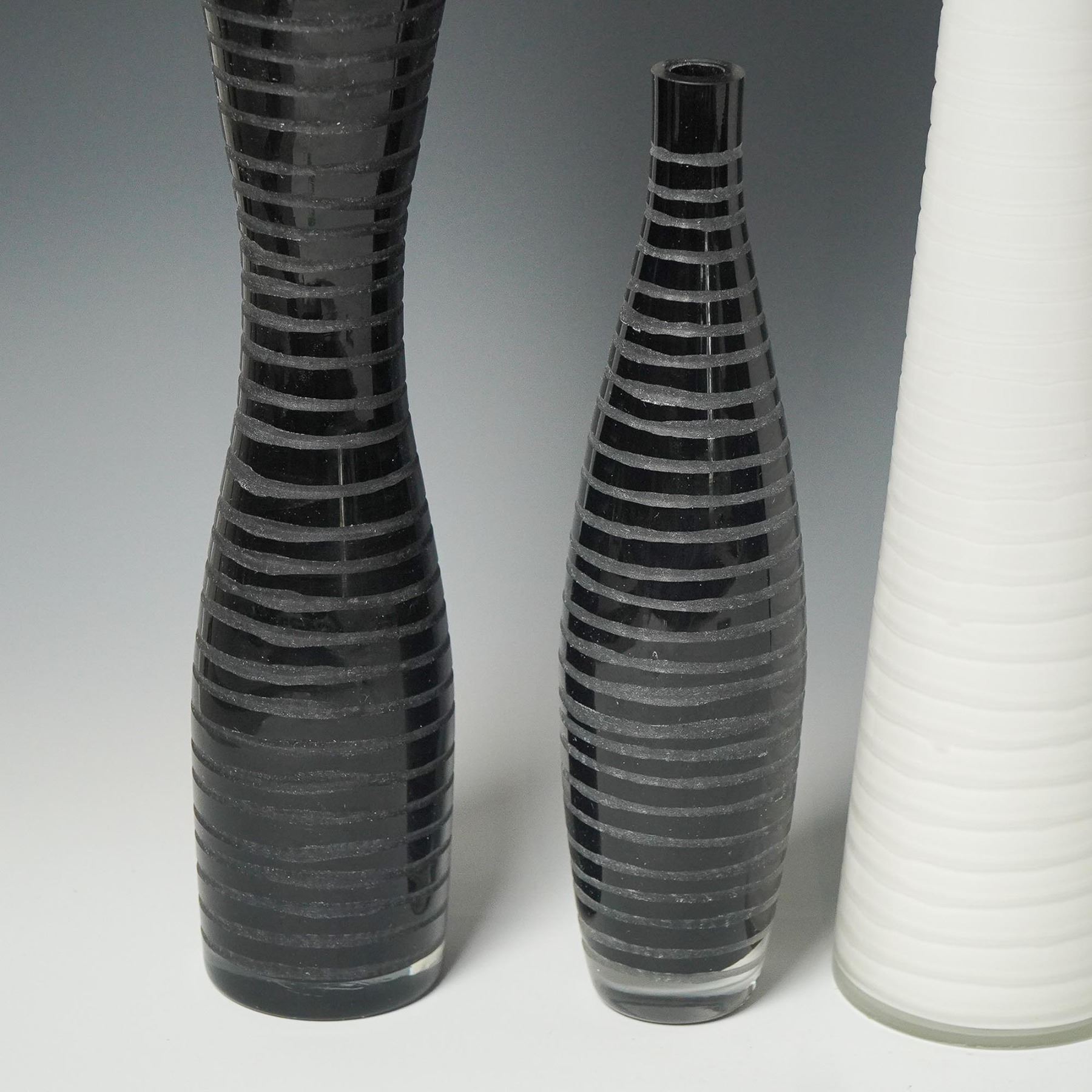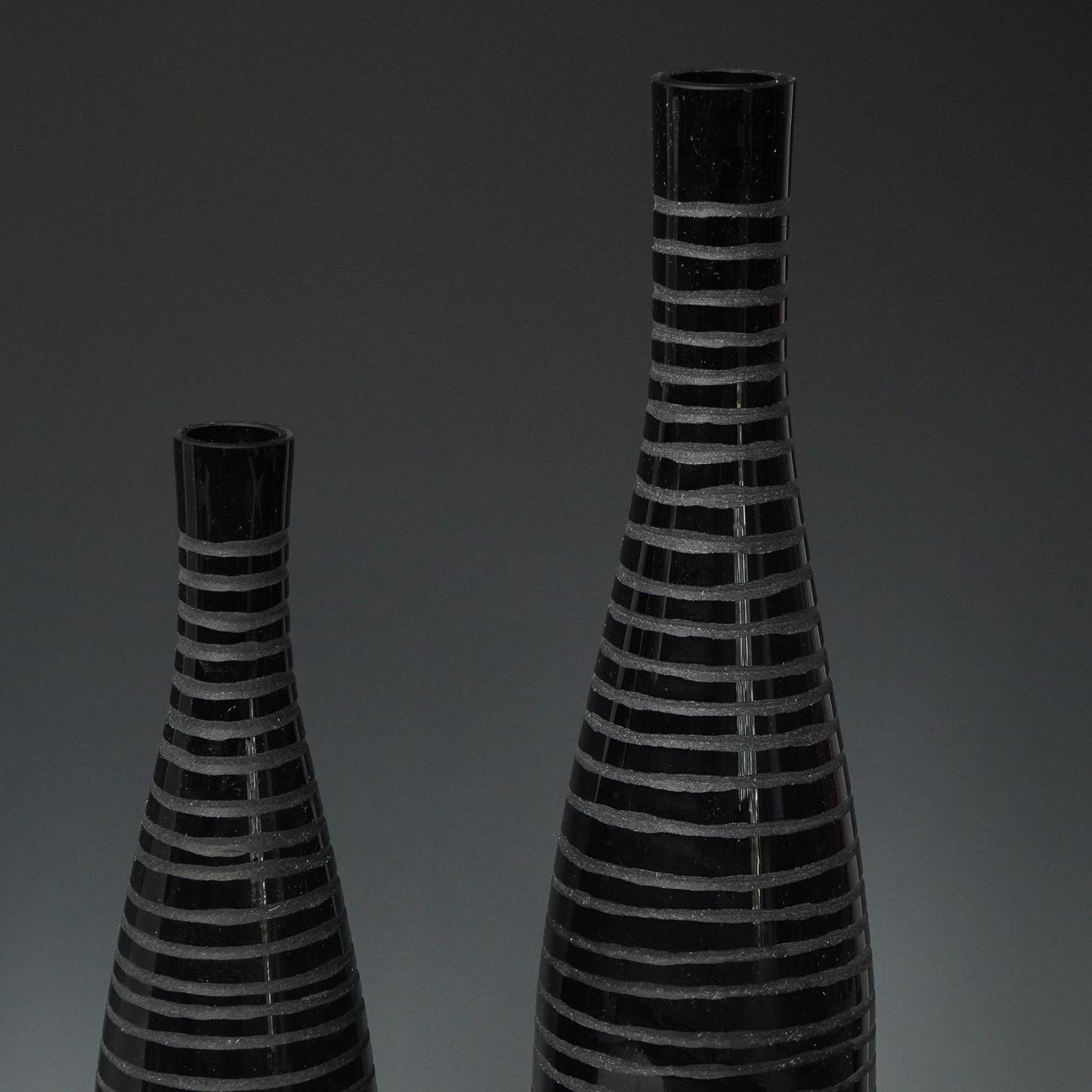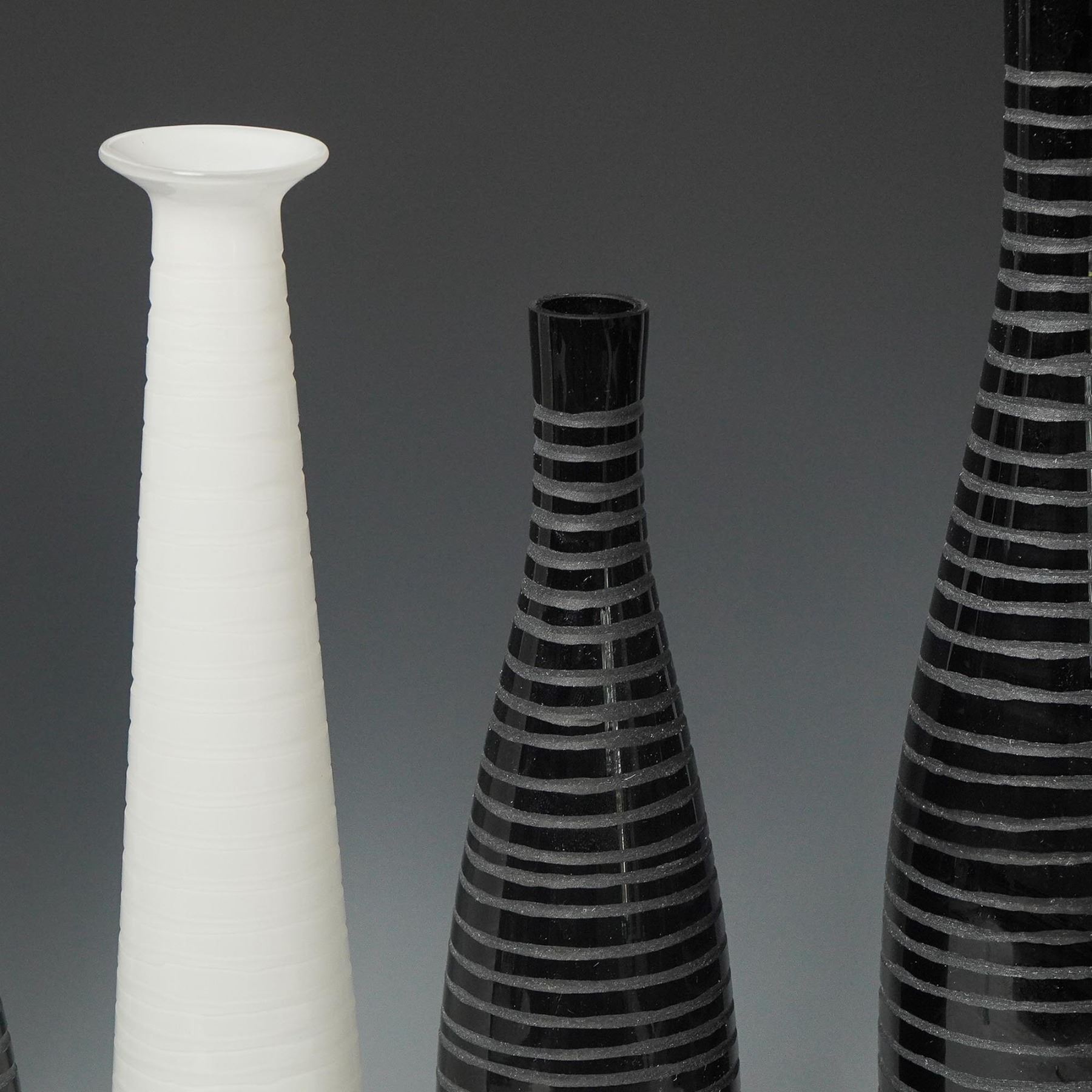 Group of five modern decorative glass vases, including four black vases with horizontal etched stripe patterns and one matte white vase with similar linear detail. Each piece features an elongated, tapered form and smooth finish, ranging in size from 11.75"H to 19.75"H. A striking and cohesive set ideal for minimalist or modern interiors.