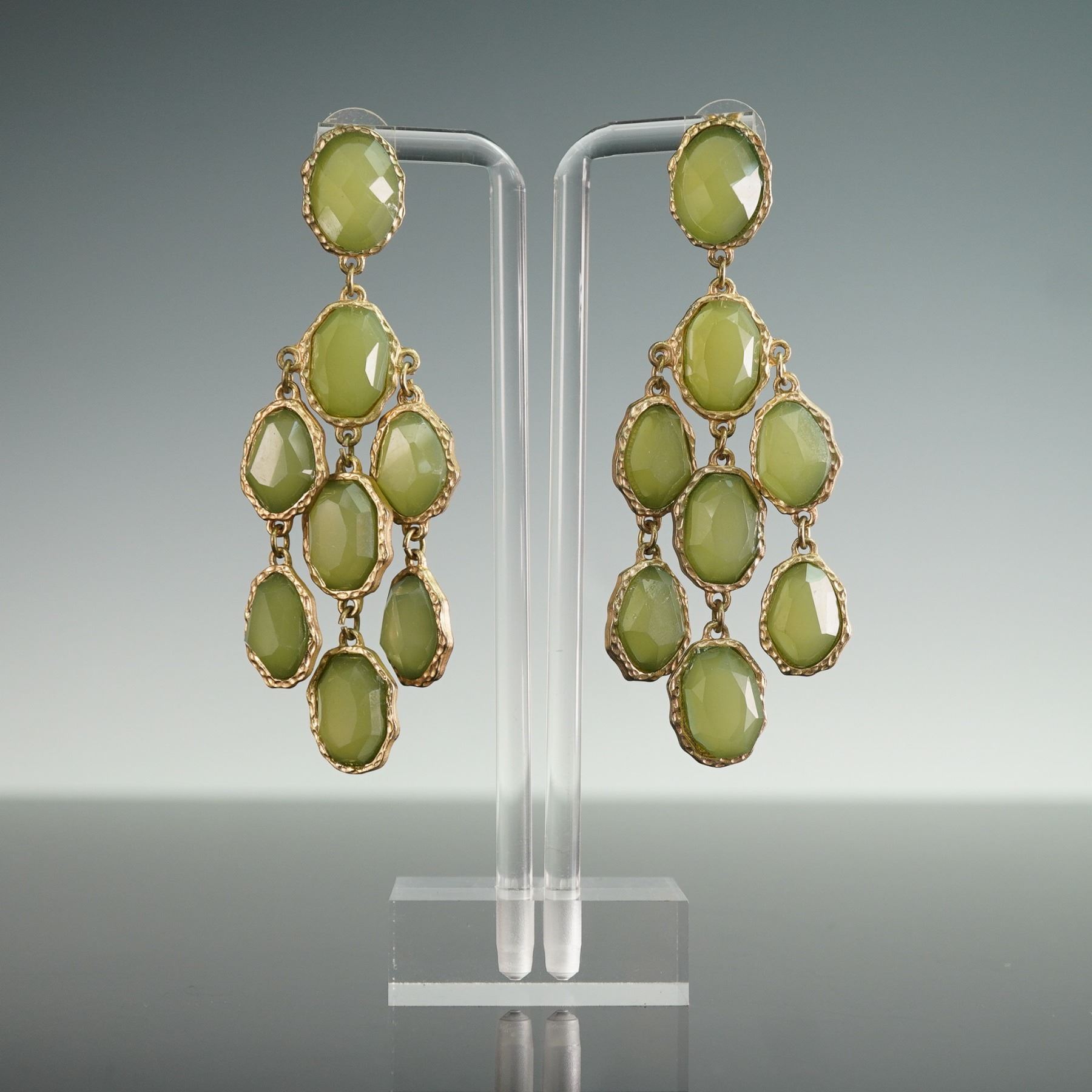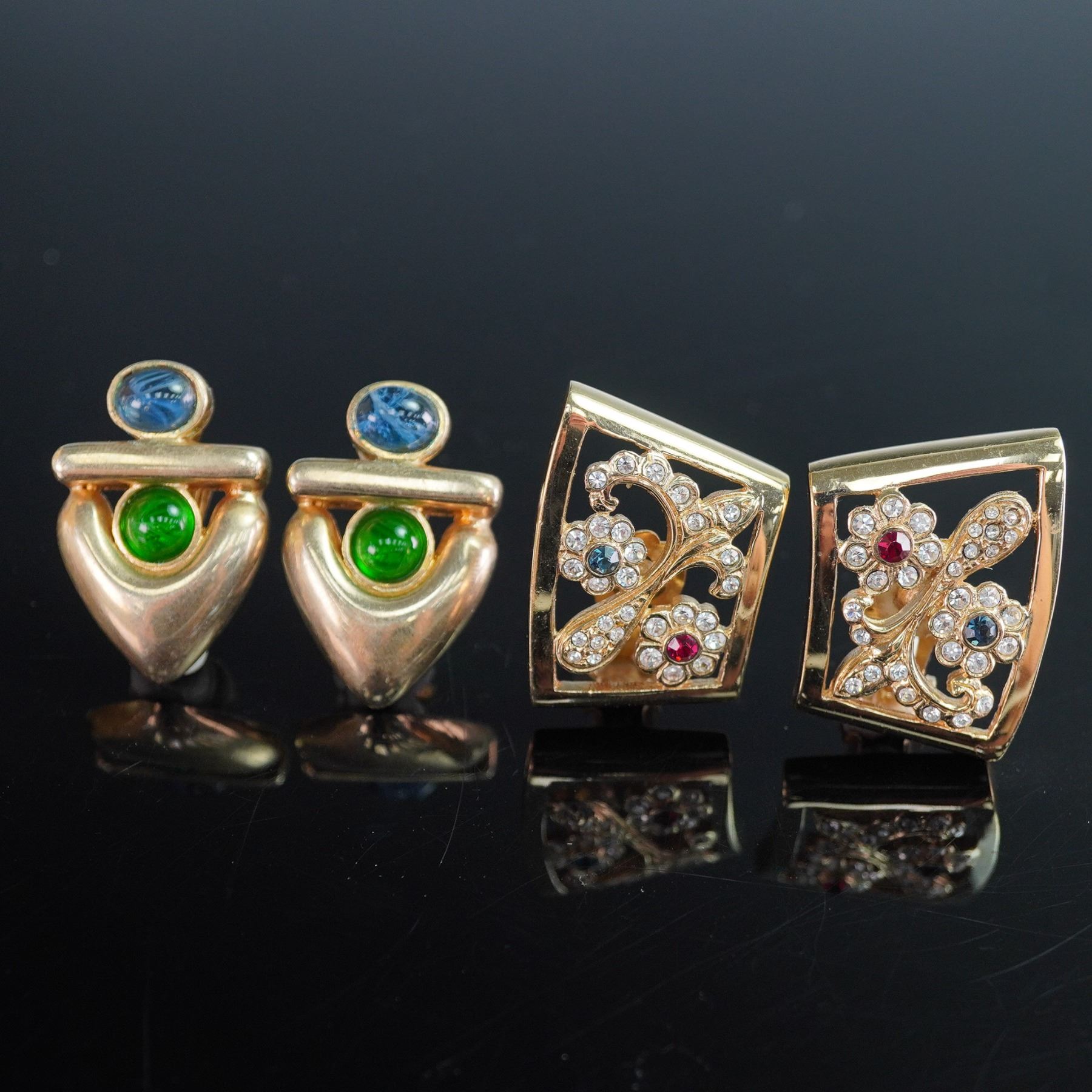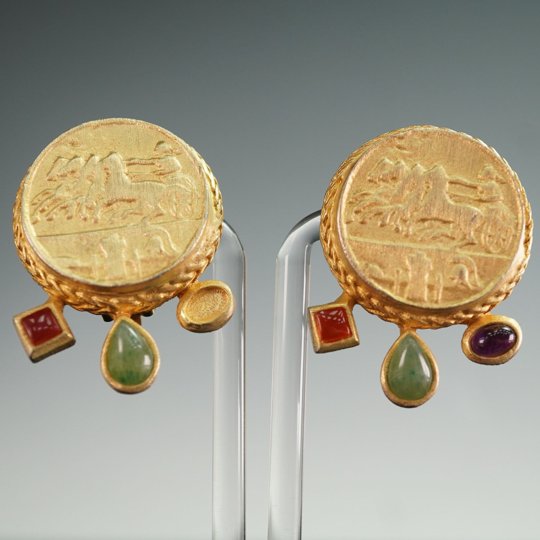 An assorted 5pc grouping of costume earrings, featuring a variety of styles and finishes. This collection includes two post-back pairs and three clip-on pairs, showcasing designs from coin-inspired medallions with vibrant gemstone accents to multi-tiered chandelier styles. The group includes pieces with detailed craftsmanship, clip-on earrings, known for their textured gold-tone finish and intricate detailing. Sizes range from approximately 1.25"H to 3.5"H, offering a versatile mix suitable for various occasions.