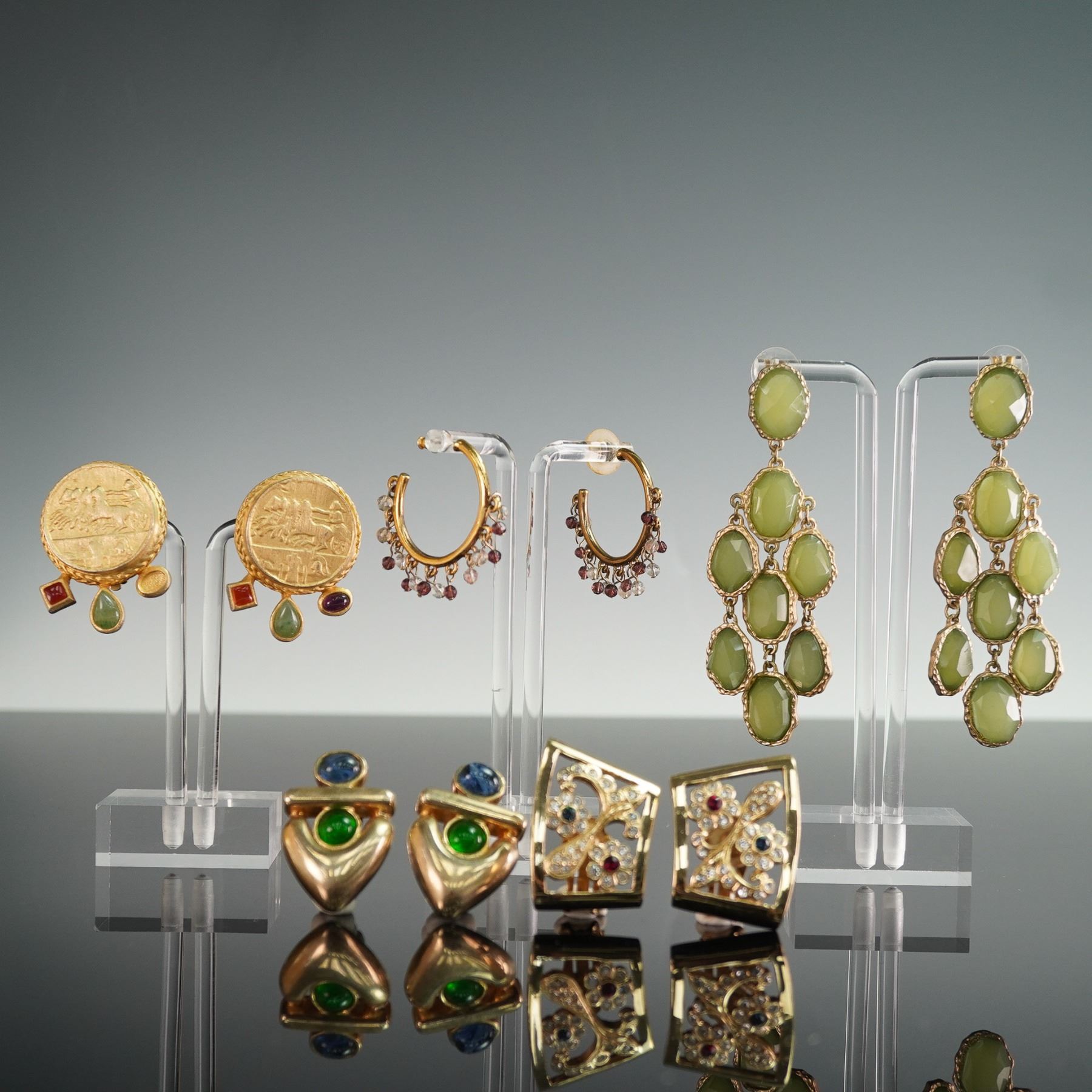 An assorted 5pc grouping of costume earrings, featuring a variety of styles and finishes. This collection includes two post-back pairs and three clip-on pairs, showcasing designs from coin-inspired medallions with vibrant gemstone accents to multi-tiered chandelier styles. The group includes pieces with detailed craftsmanship, clip-on earrings, known for their textured gold-tone finish and intricate detailing. Sizes range from approximately 1.25"H to 3.5"H, offering a versatile mix suitable for various occasions.