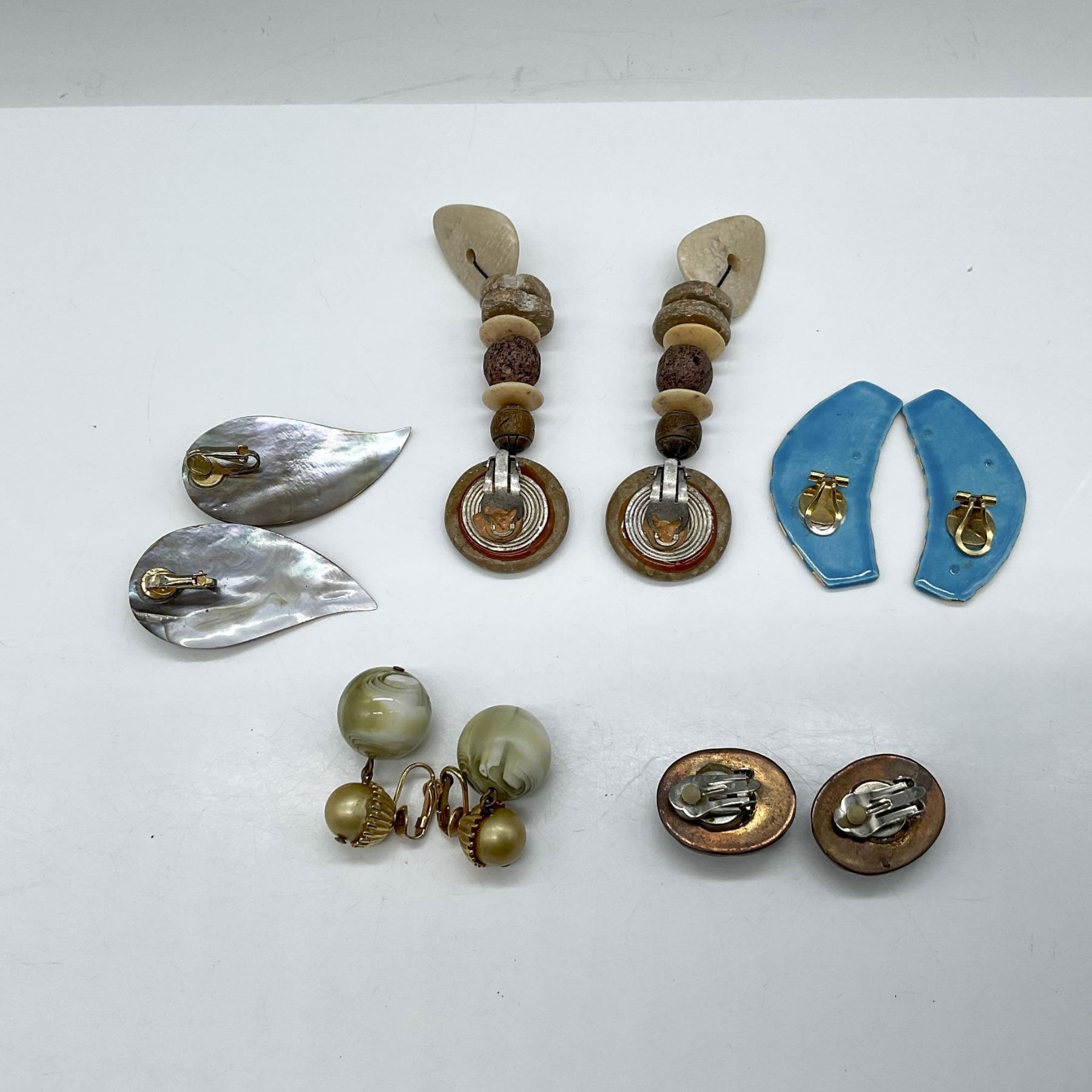 Natural material designs of clip back earrings in stone, shell including enamel and faux stones. Largest piece: 4.25"L x 1.25"W. Issued: 20th century