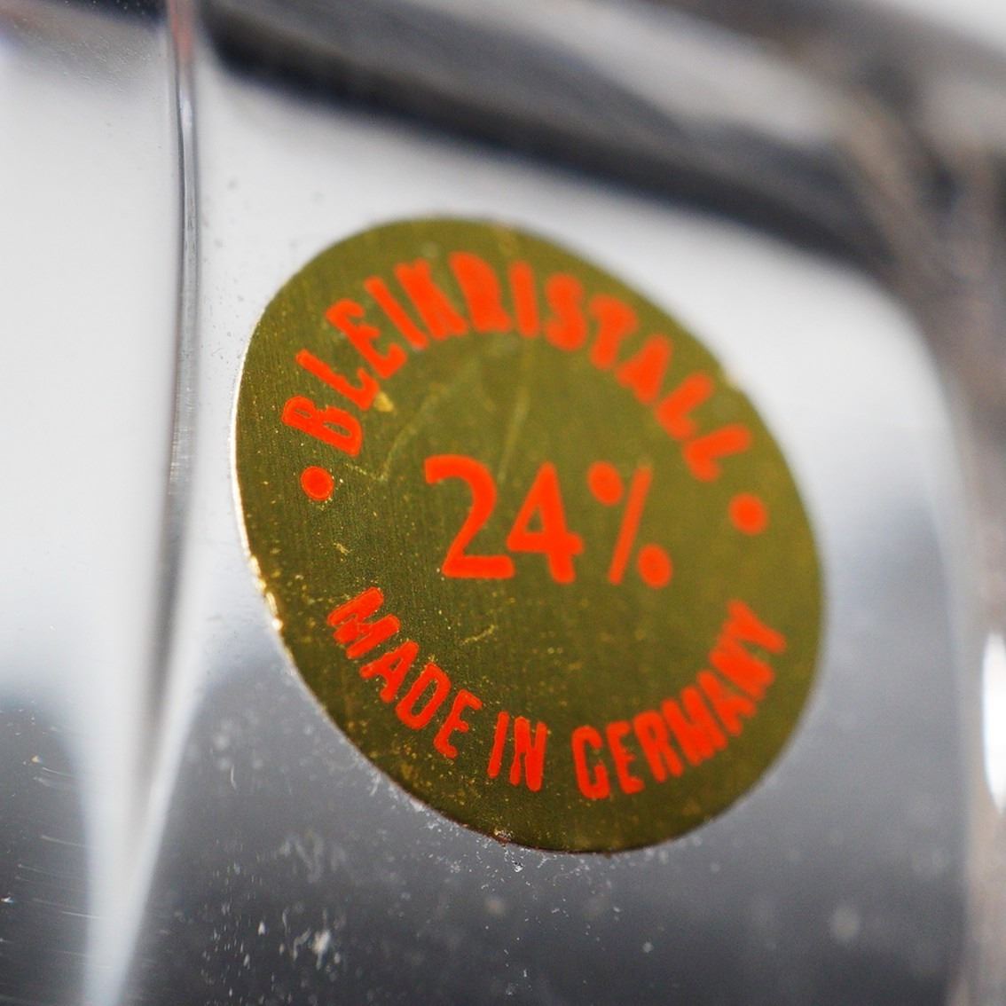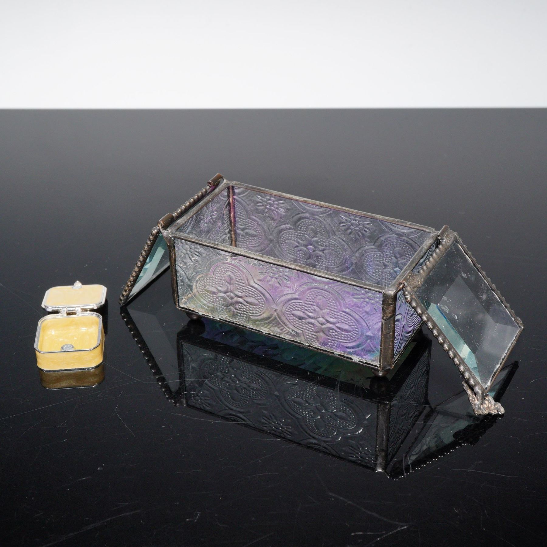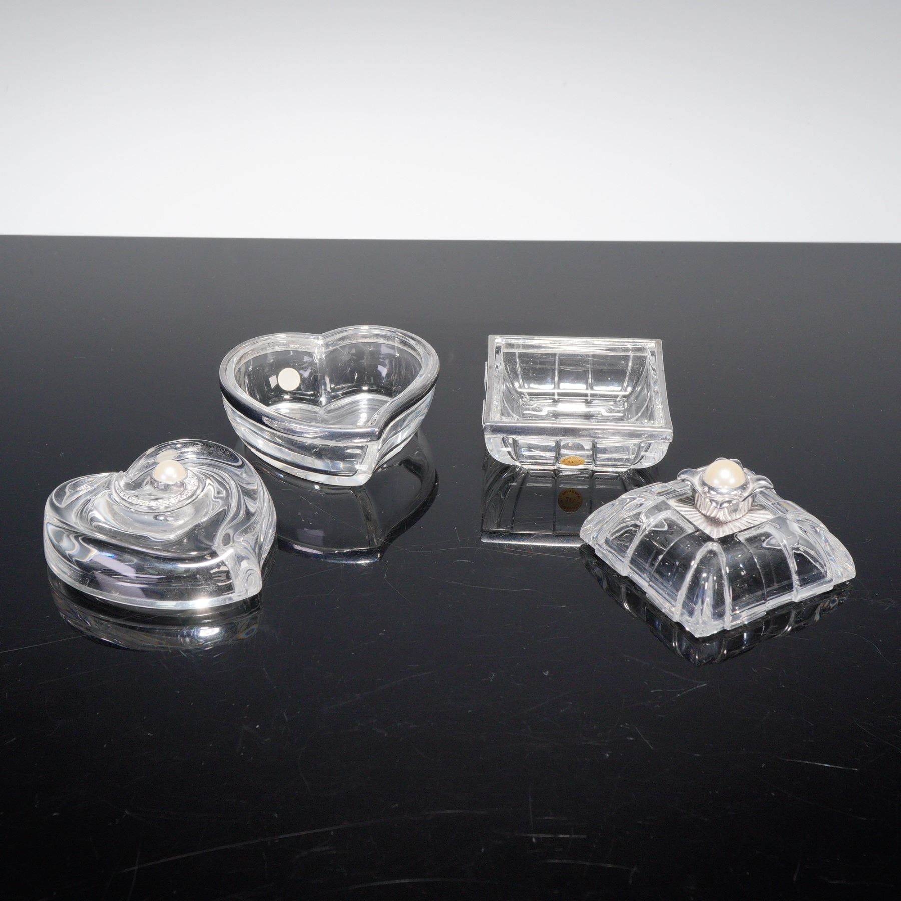 This 5-piece crystal dresser set features three elegant lidded crystal boxes, each with a unique design, a small enameled ring box, and a mirrored tray. Perfect for organizing small items or as decorative pieces.