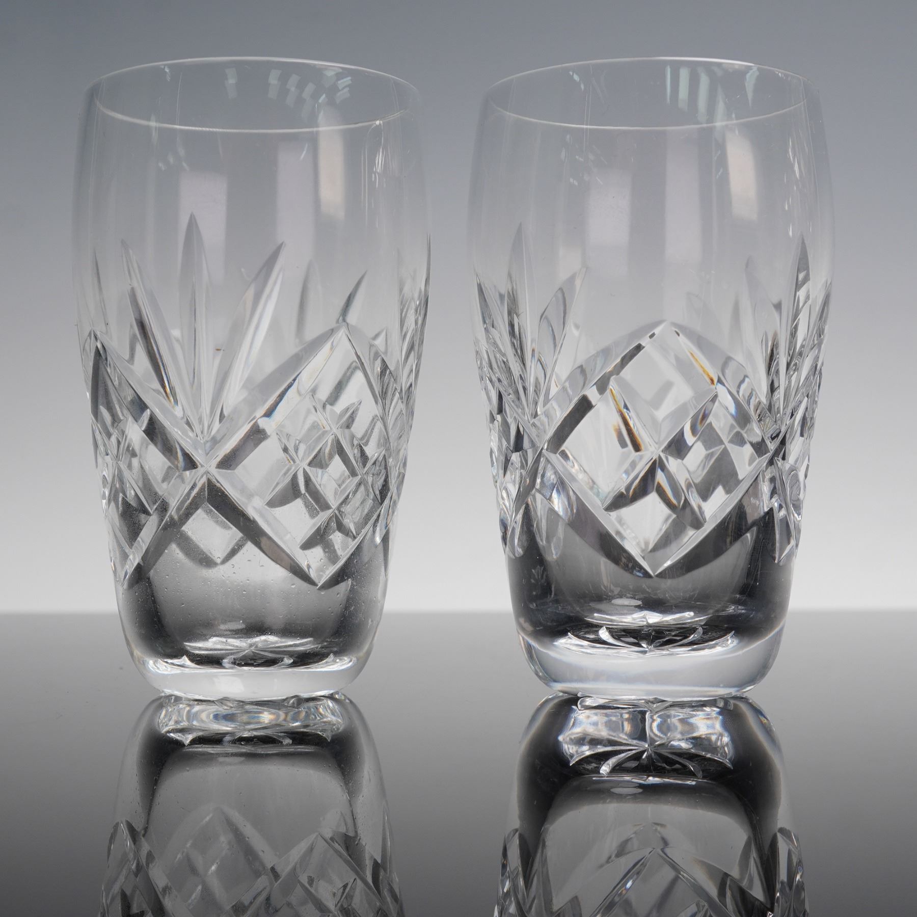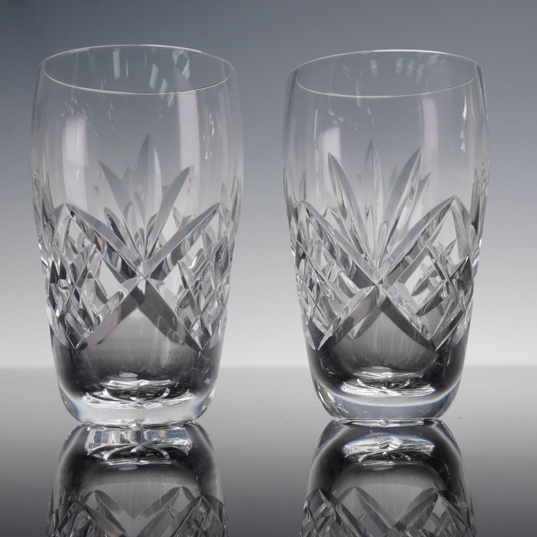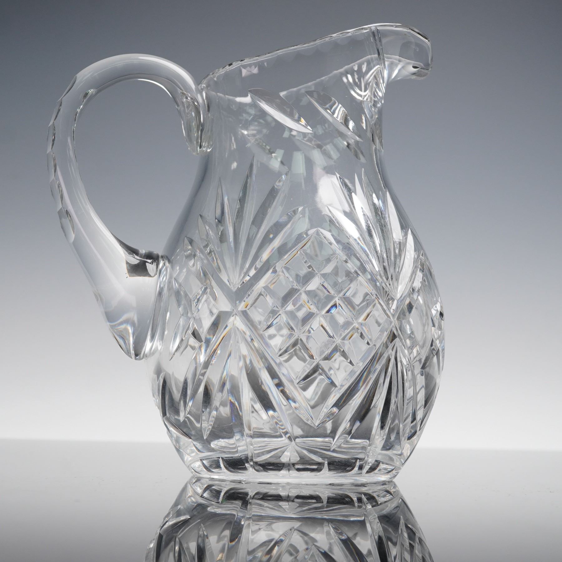 A five-piece cut crystal set comprising a generously sized pitcher and four matching tumblers. Each piece is richly decorated with a diamond and fan pattern, designed to catch and refract the light with brilliance. A timeless and elegant addition to the table.