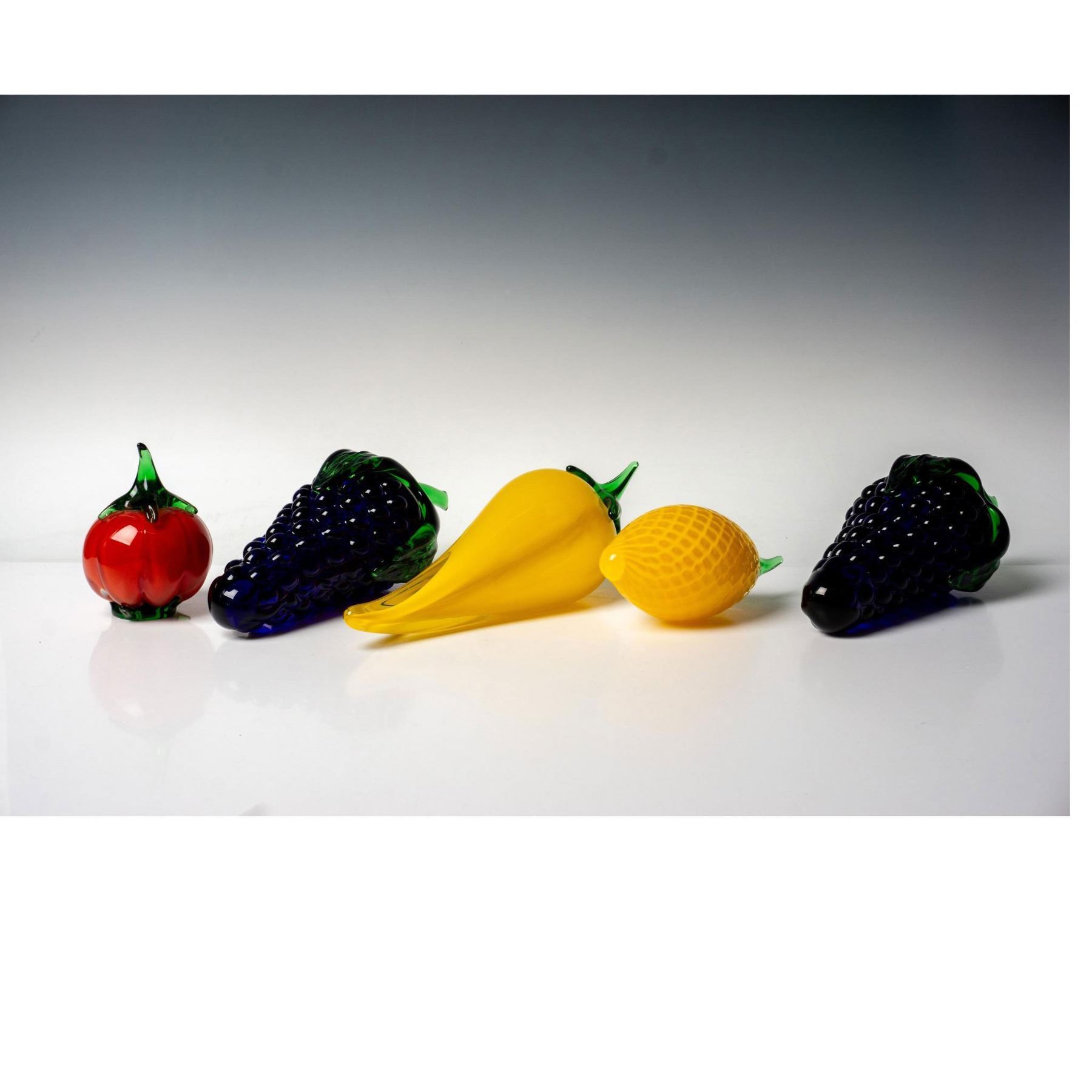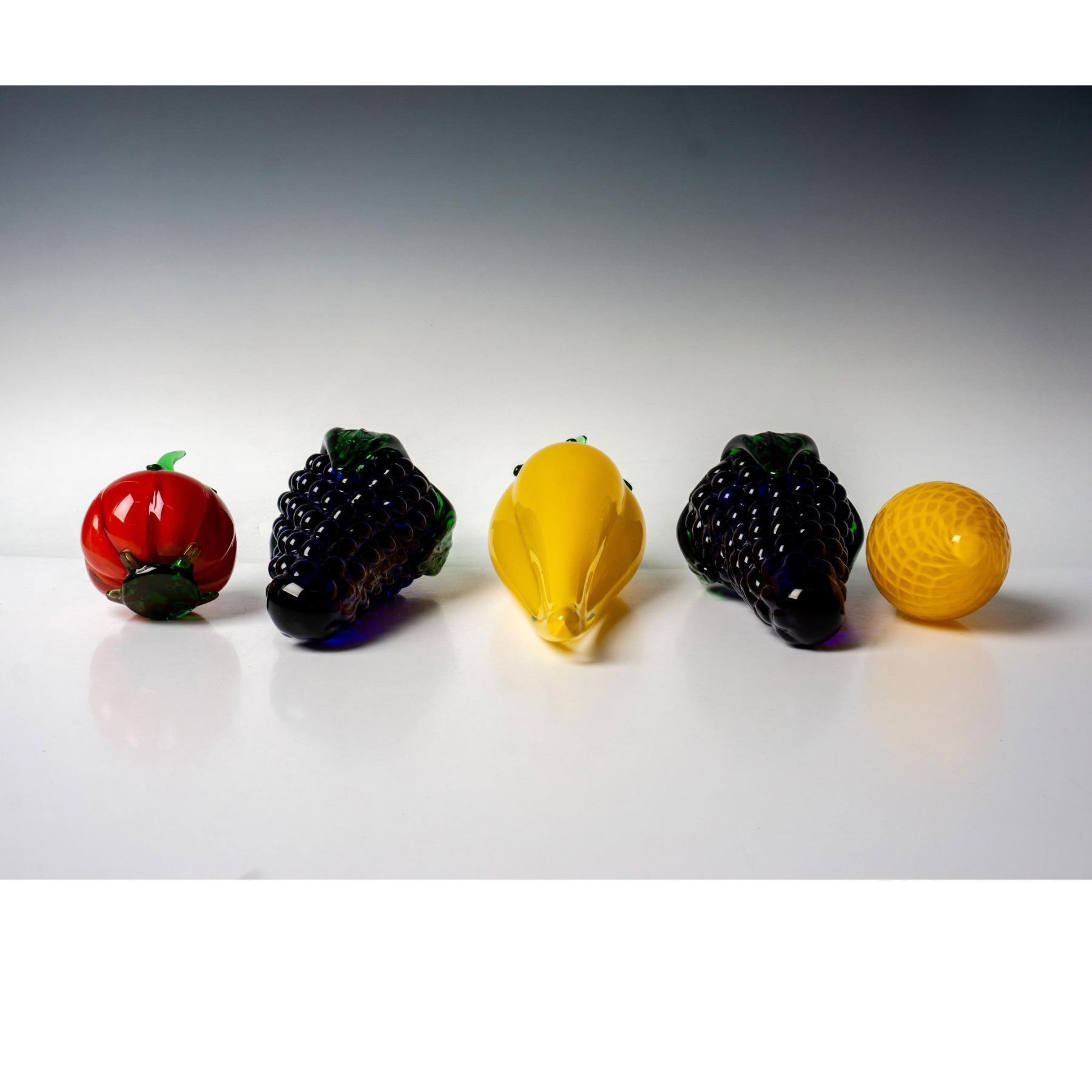 Five assorted glass fruit pieces including 2 large grape clusters, a tomato, lemon and pepper. Grape clusters largest pieces and are 11.5"L x 5"W x 4"H. Manufacturer: The Czech Point Bohemian Glass
