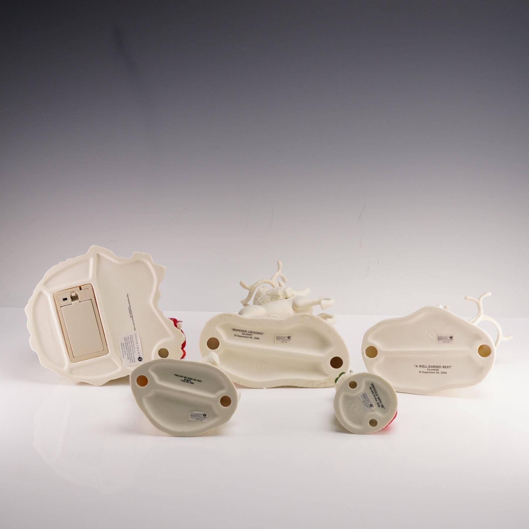 This group of five Department 56 Snowbabies figurines includes I've Got My Eye on You, Reindeer Crossing, A Well Earned Rest, Snuggle With Me, and The Stocking Was Hung by the Igloo With Care. I've Got My Eye on You shows a Snowbaby watching an owl inside a small clear globe. Reindeer Crossing features a Snowbaby joyfully riding a leaping reindeer surrounded by soft trees. A Well Earned Rest depicts a Snowbaby curled up against a resting reindeer. Snuggle With Me shows a Snowbaby nestled beside a small polar bear, both wrapped in a moment of quiet affection. The Stocking Was Hung by the Igloo With Care displays a Snowbaby hanging a red stocking outside a rounded igloo, adding a playful winter touch. Department 56 backstamp.