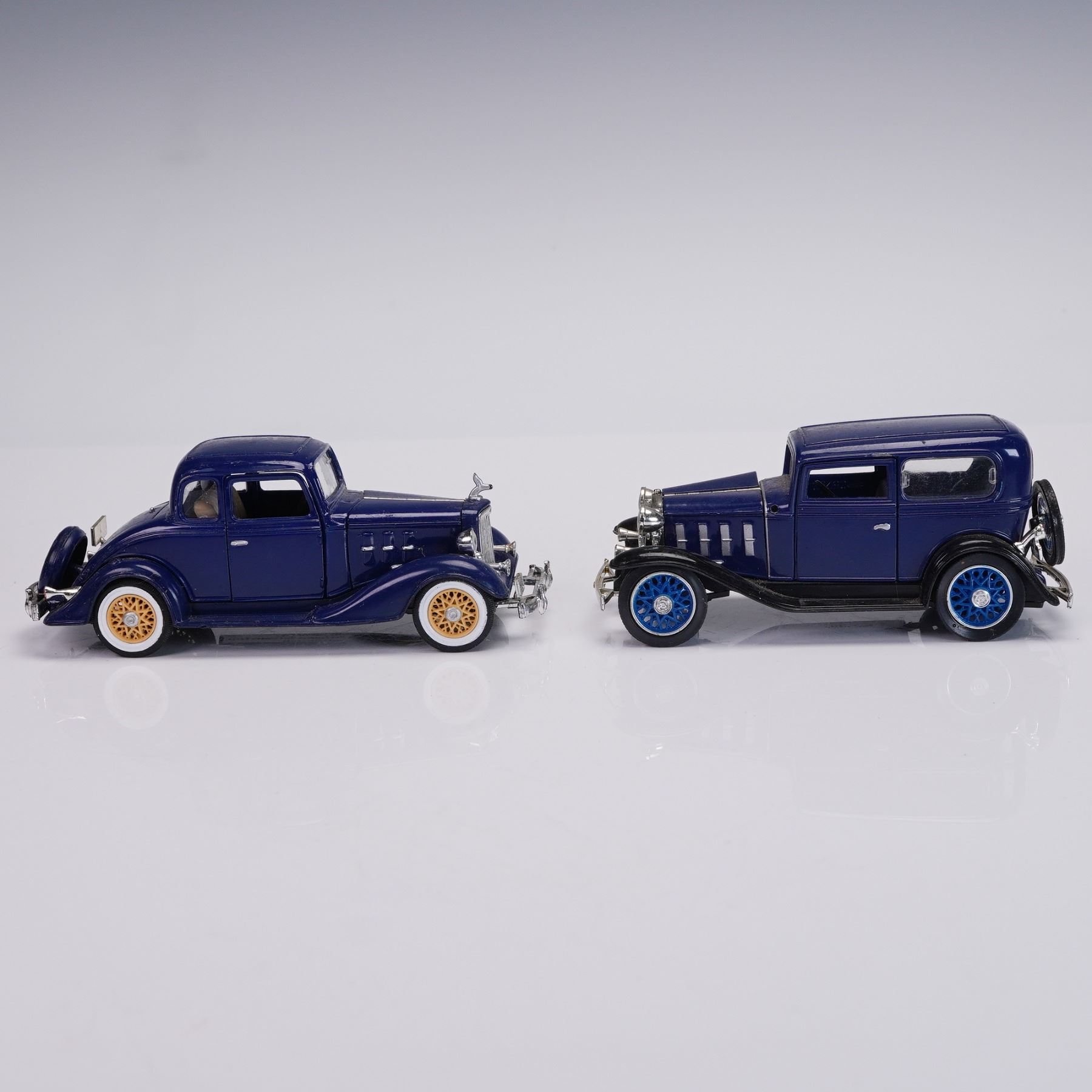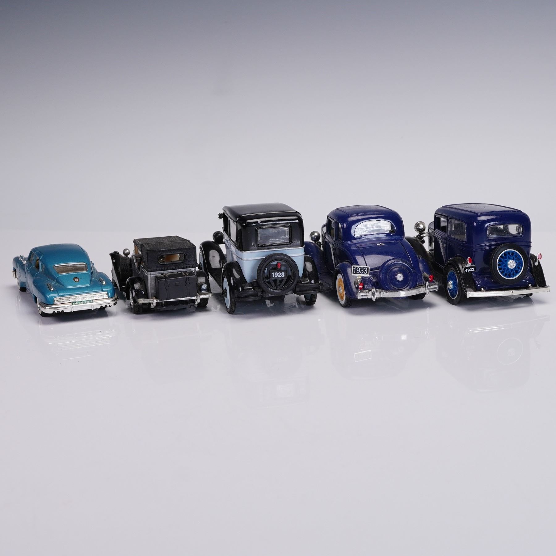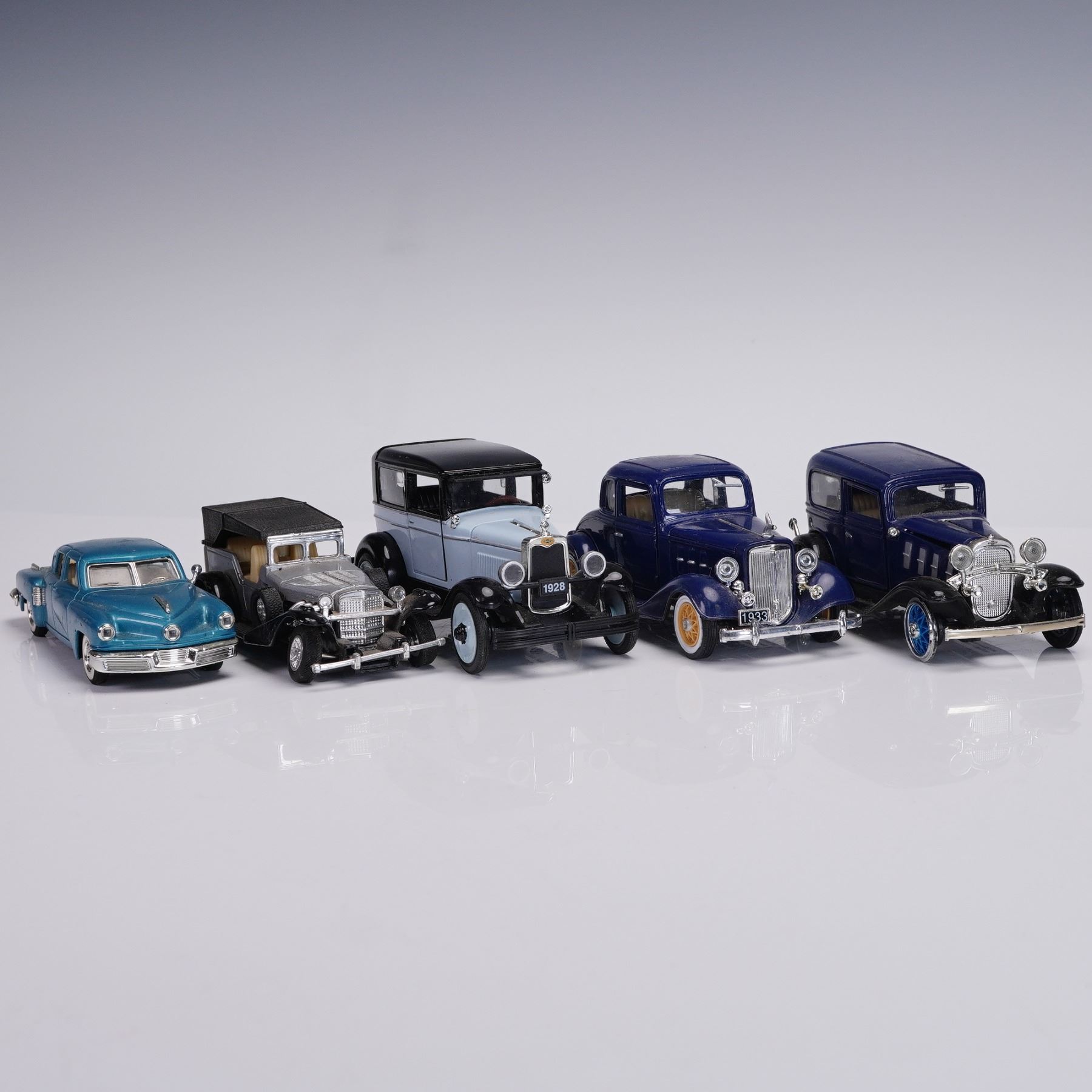 A nostalgic and eye-catching collection featuring five vintage-style diecast model vehicles, including four early 20th-century-style cars and a Texaco Sky Chief gas pump with a clear cylinder, retro Texaco globe topper, and original Sky Chief decals. The centerpiece is a charmingly detailed Ford Model T-style touring car marked Franklin Mint Precision Models, paired with a tall-scale diecast gas pump to evoke a bygone era of motoring. Also included are three matching red and black early roadsters and one miniature model with cream-colored seats. All display nicely with realistic trim, steering wheels, and detailed chassis, perfect for collectors or decor.
