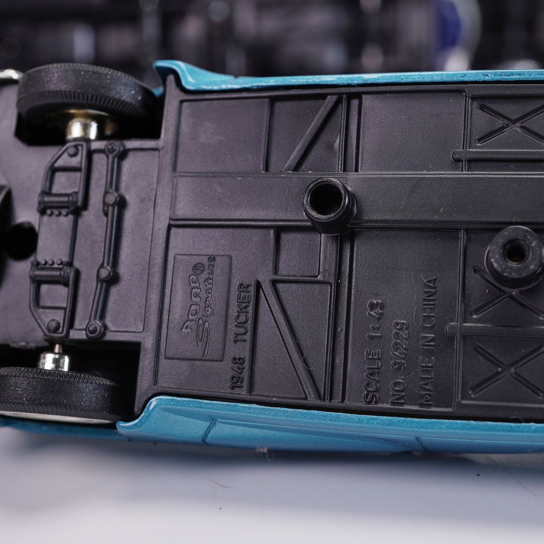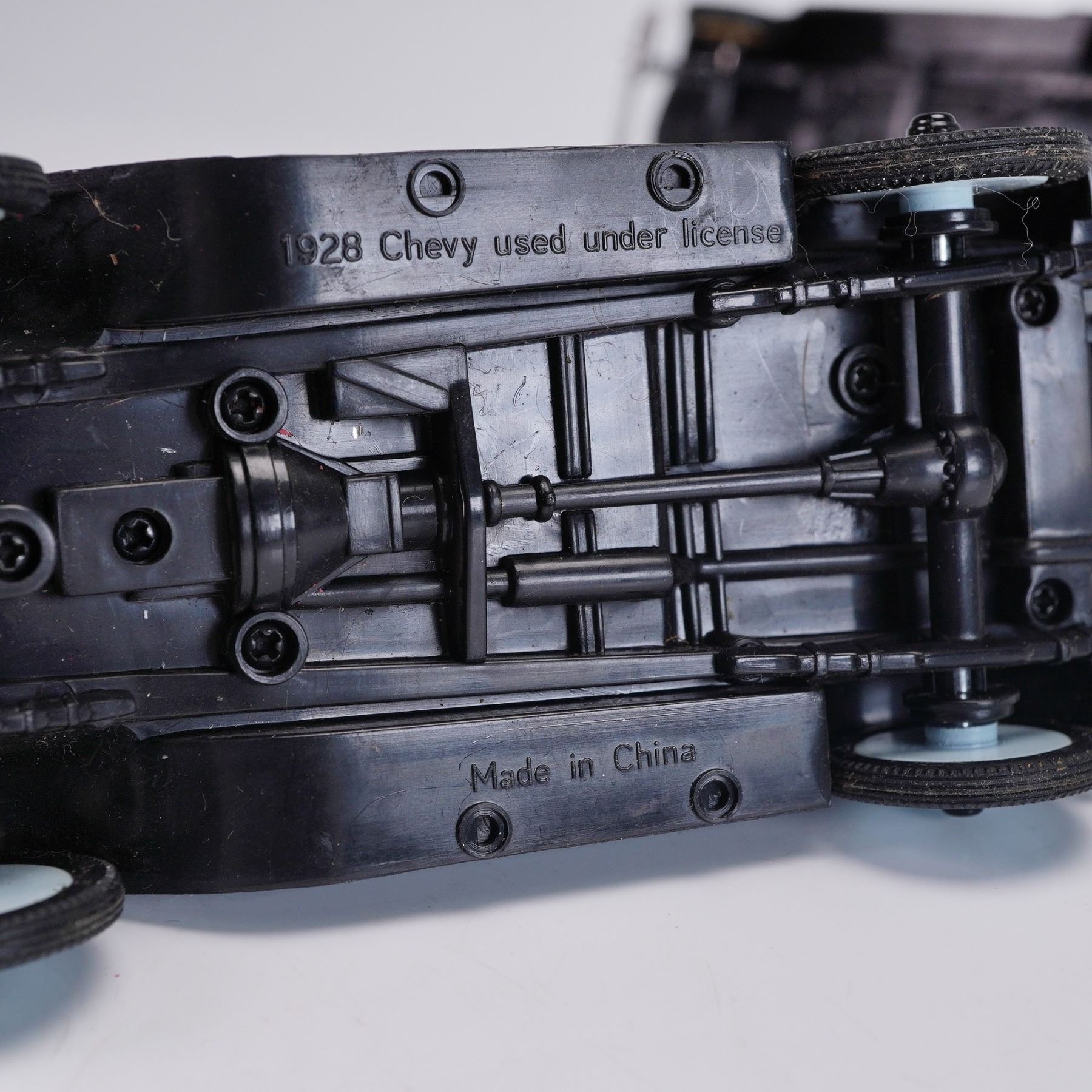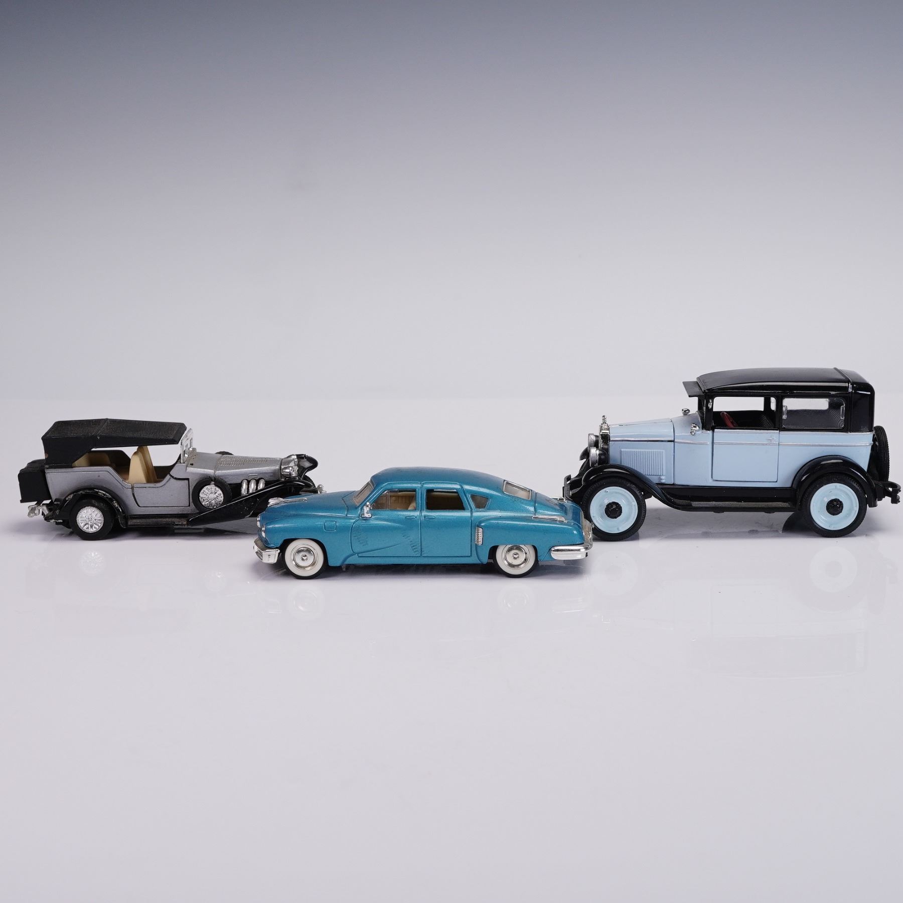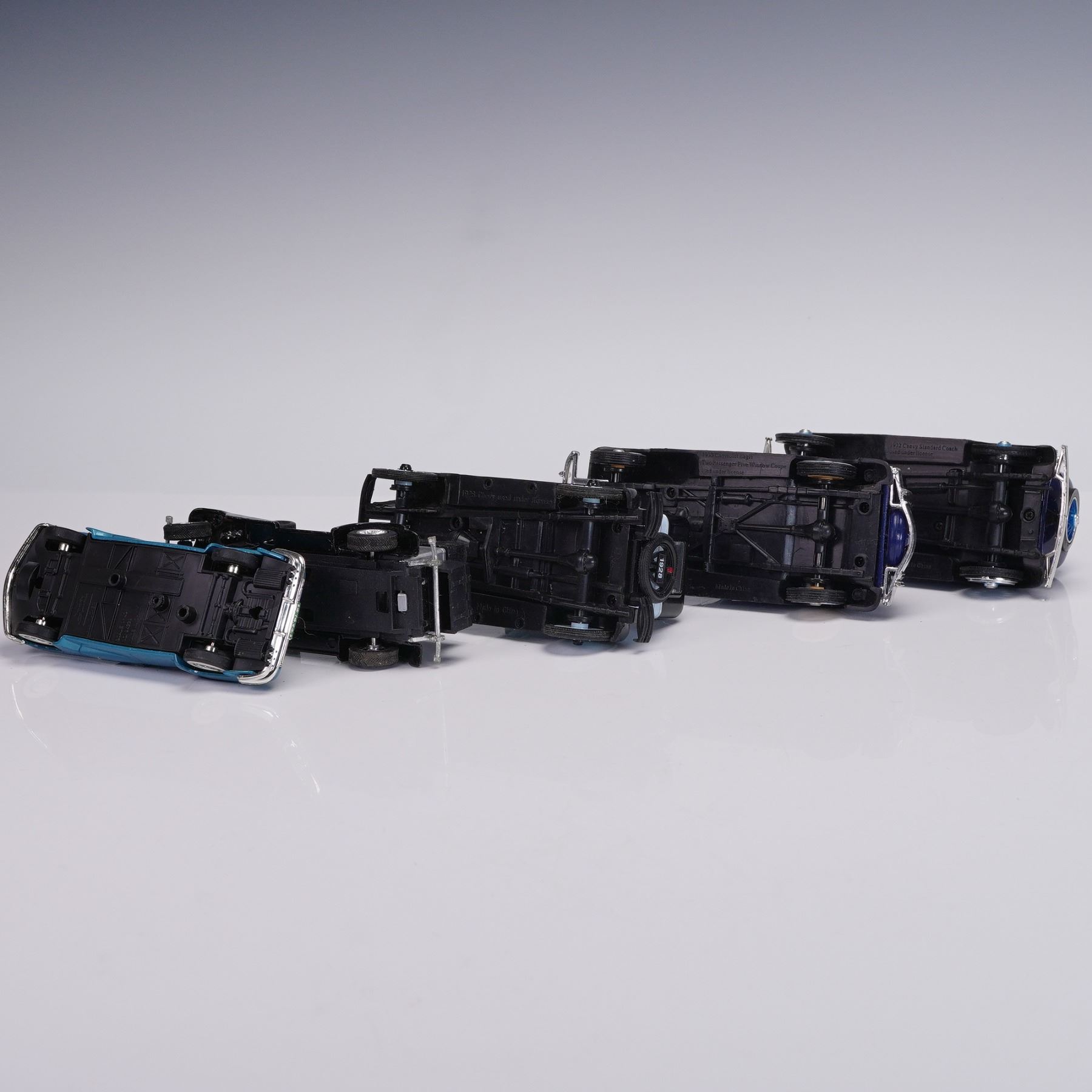 A nostalgic and eye-catching collection featuring five vintage-style diecast model vehicles, including four early 20th-century-style cars and a Texaco Sky Chief gas pump with a clear cylinder, retro Texaco globe topper, and original Sky Chief decals. The centerpiece is a charmingly detailed Ford Model T-style touring car marked Franklin Mint Precision Models, paired with a tall-scale diecast gas pump to evoke a bygone era of motoring. Also included are three matching red and black early roadsters and one miniature model with cream-colored seats. All display nicely with realistic trim, steering wheels, and detailed chassis, perfect for collectors or decor.