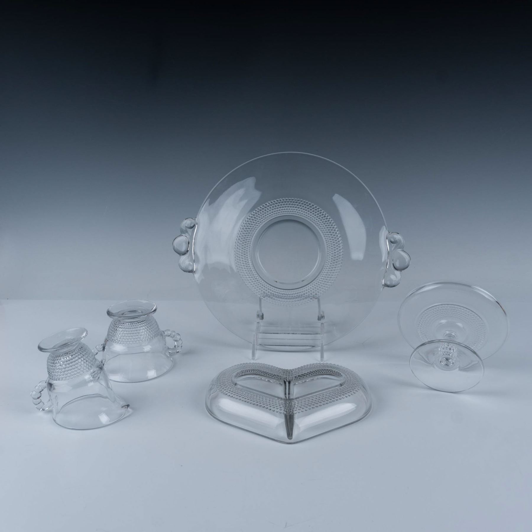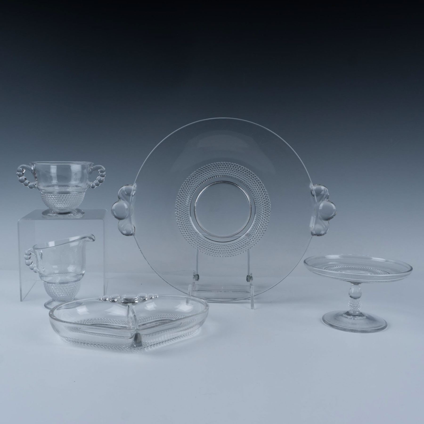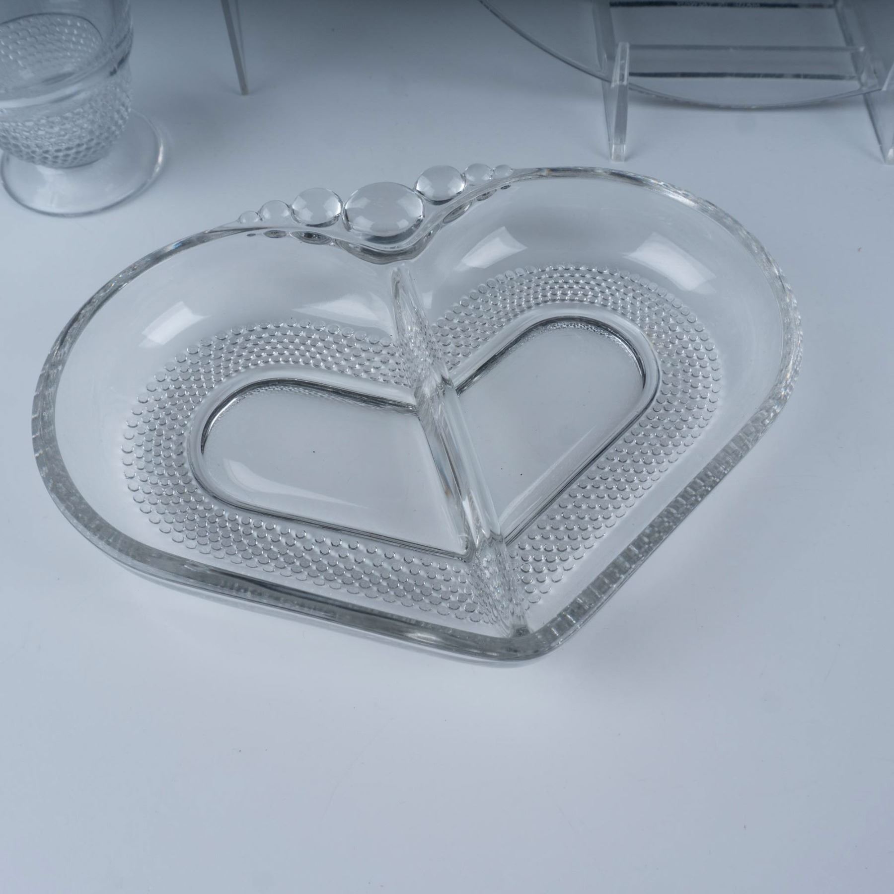 Magnificent set of clear tableware that consists of a large serving tray, a heart shaped divided dish, a cheese compote footed tray, a creamer jug, and an open sugar cup. Largest item measures 13.25"L x 11"W x 1"H.