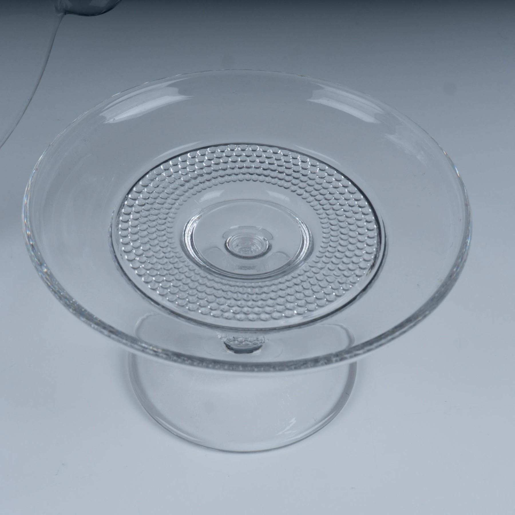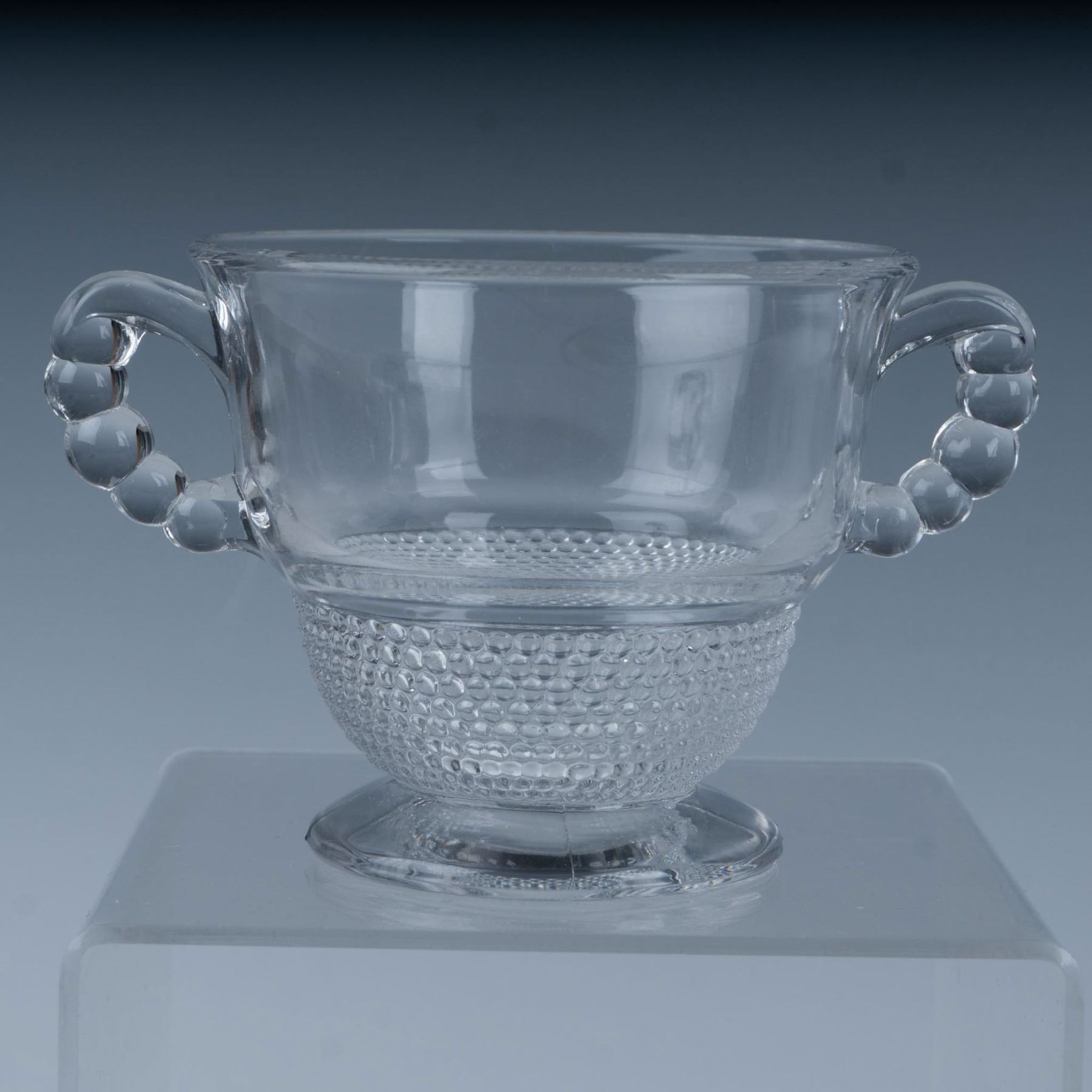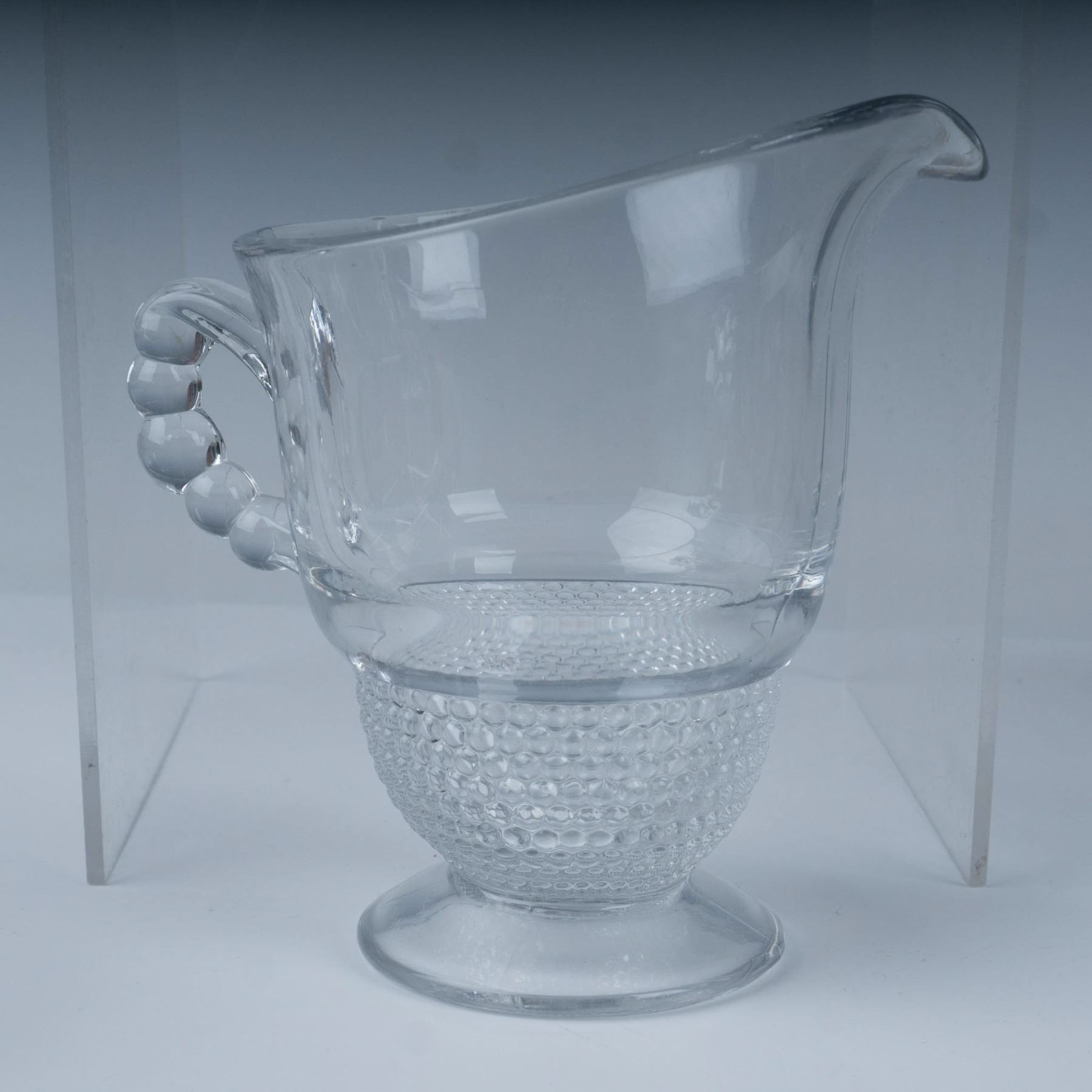 Magnificent set of clear tableware that consists of a large serving tray, a heart shaped divided dish, a cheese compote footed tray, a creamer jug, and an open sugar cup. Largest item measures 13.25"L x 11"W x 1"H.