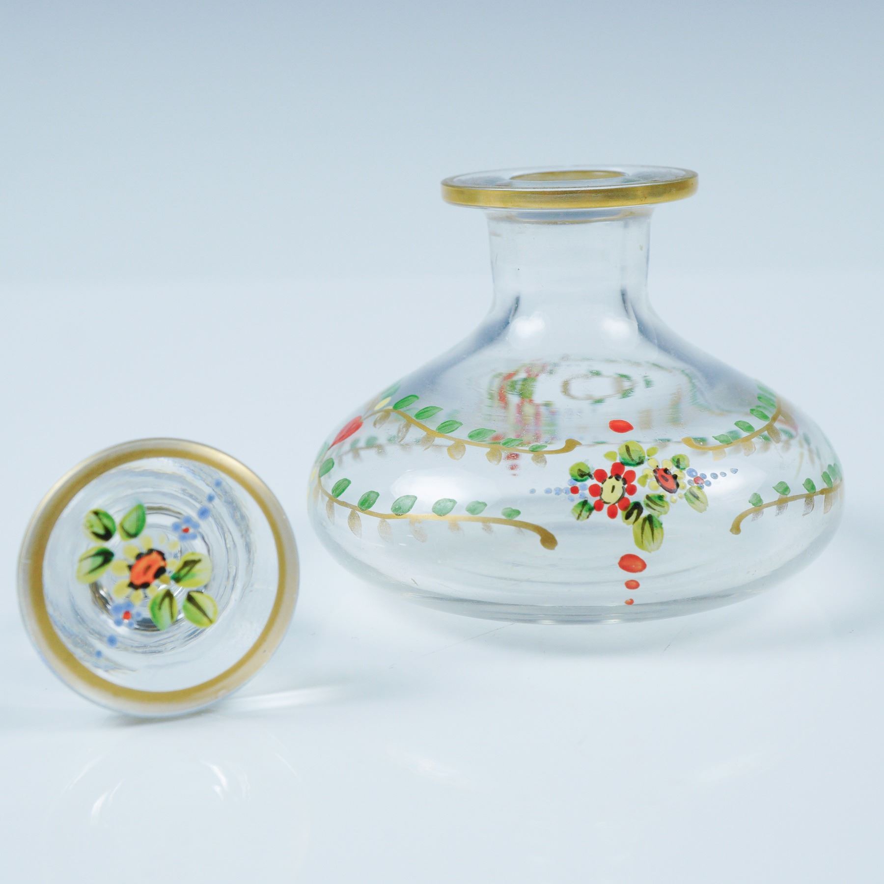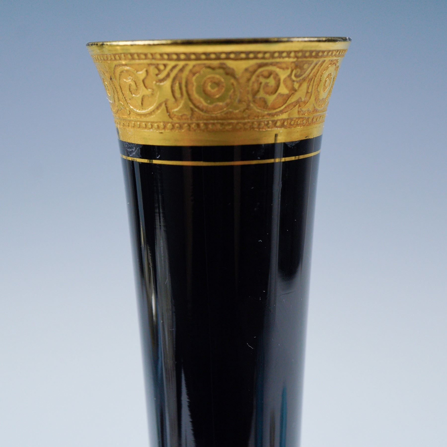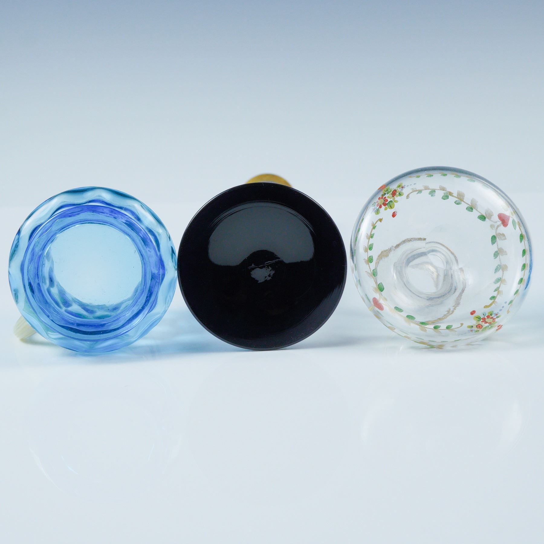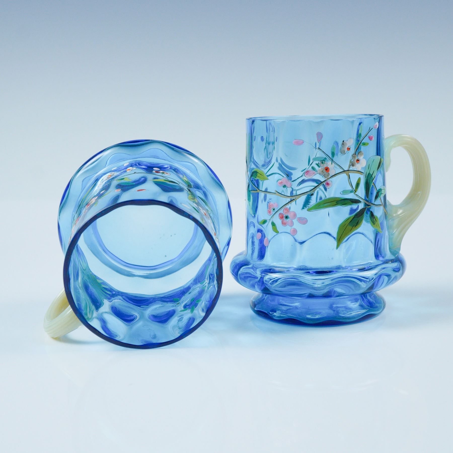 Group of five enameled art glass pieces, featuring vibrant colors and hand-applied decoration. Includes a tall, slender amethyst glass bud vase with gold banding and intricate gilt foliate scrollwork around the flared rim, appearing nearly black but revealing rich purple translucence when held to the light. Also included are two small cobalt blue handled mugs with pale cream handles, each adorned with raised floral enamel decoration and deeply molded optical ribbing. The set is completed by a clear glass scent or cologne bottle with matching stopper, both decorated with colorful enameled floral garlands and gold accents.