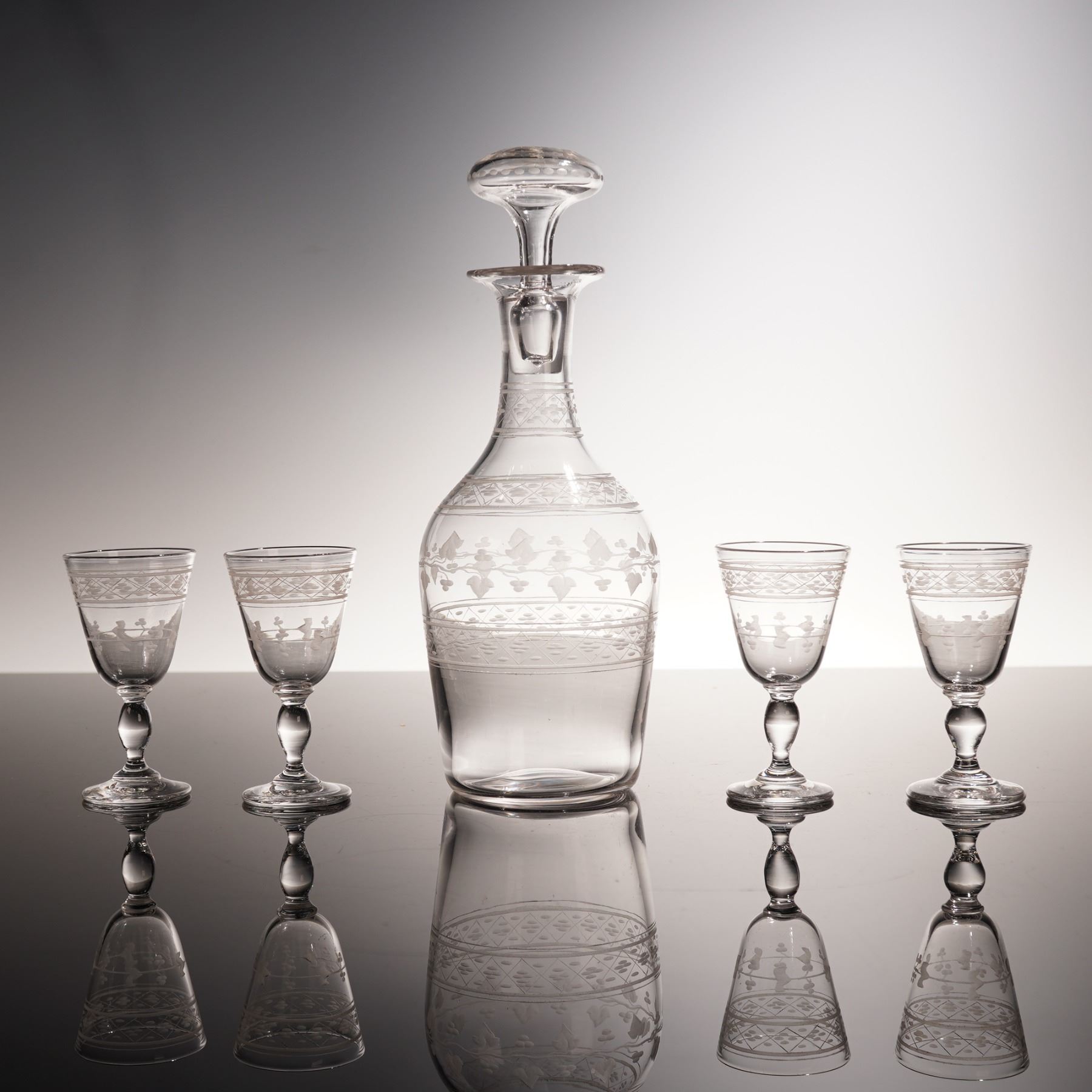 A 5 piece set featuring a crystal decanter with stopper and four cordial glasses, all embellished with matching etched decoration. This coordinated grouping offers both beauty and function for the table or bar.