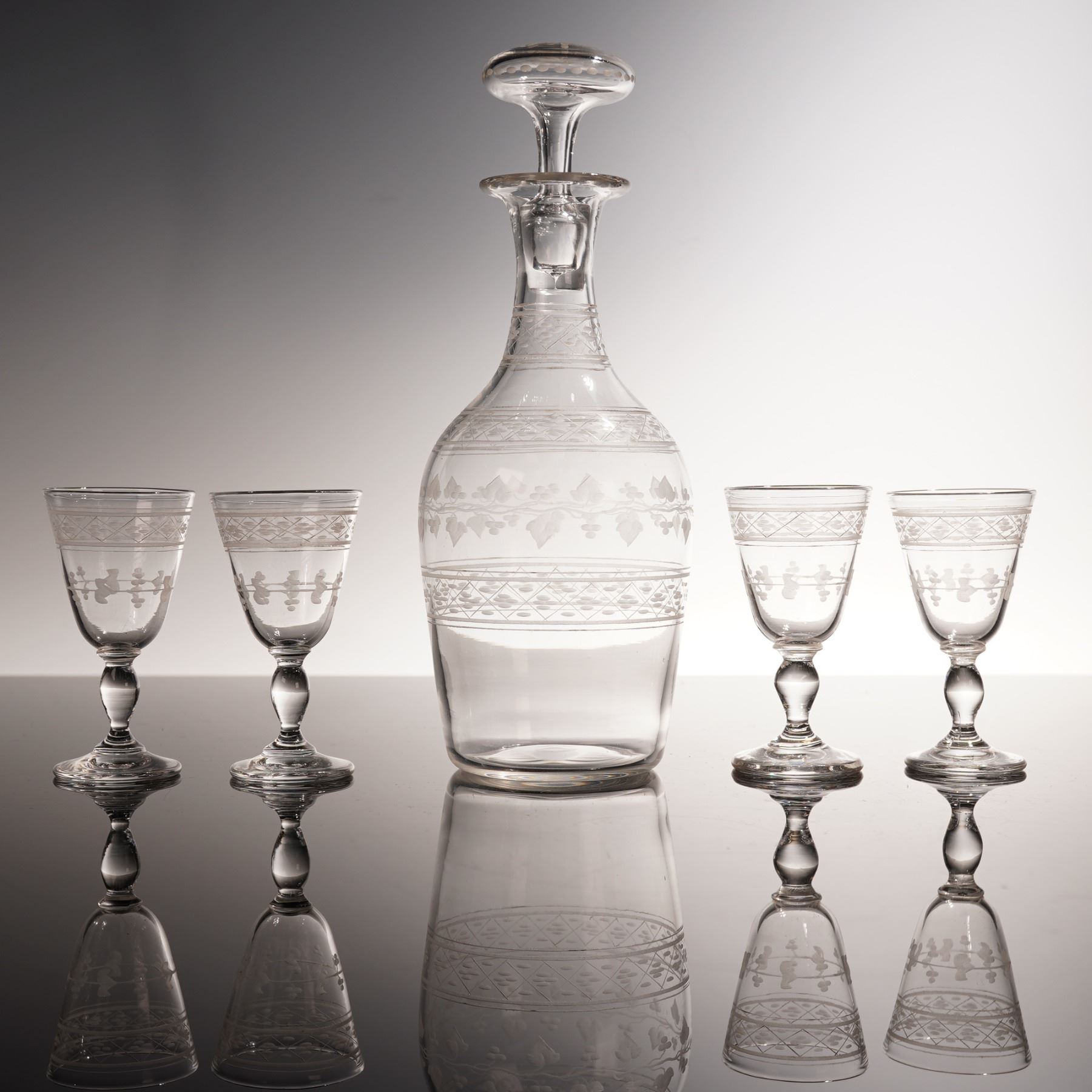 A 5 piece set including a crystal decanter with stopper and four cordial glasses, designed with delicate etched motifs. The timeless design makes this an appealing addition to any collection or setting.
