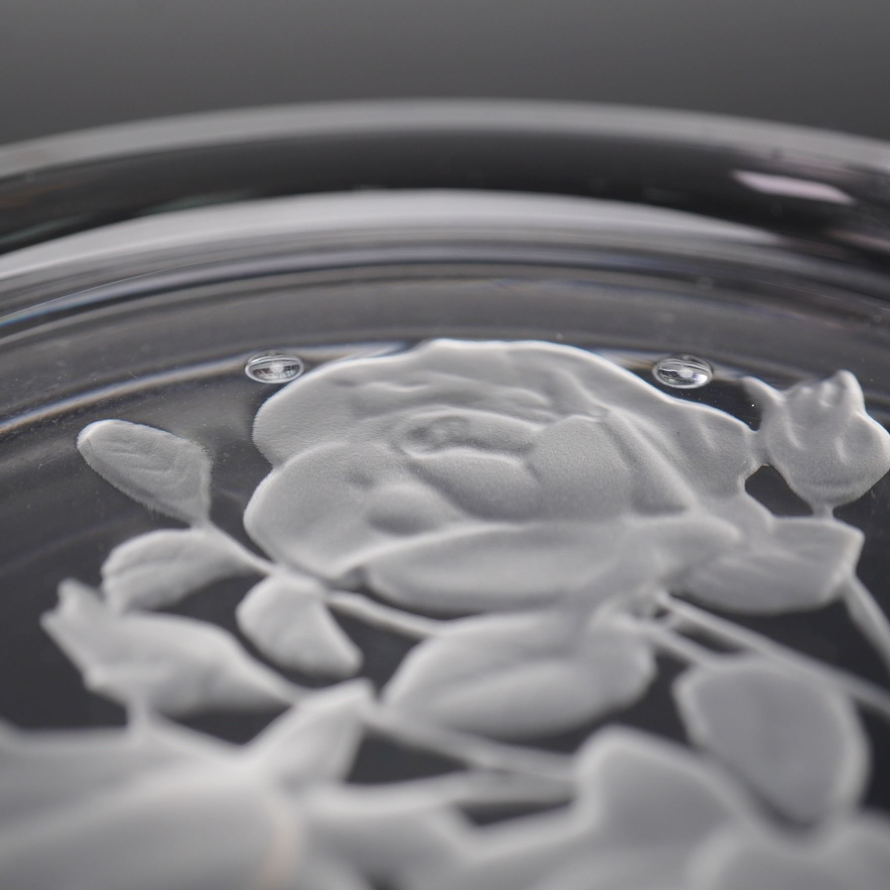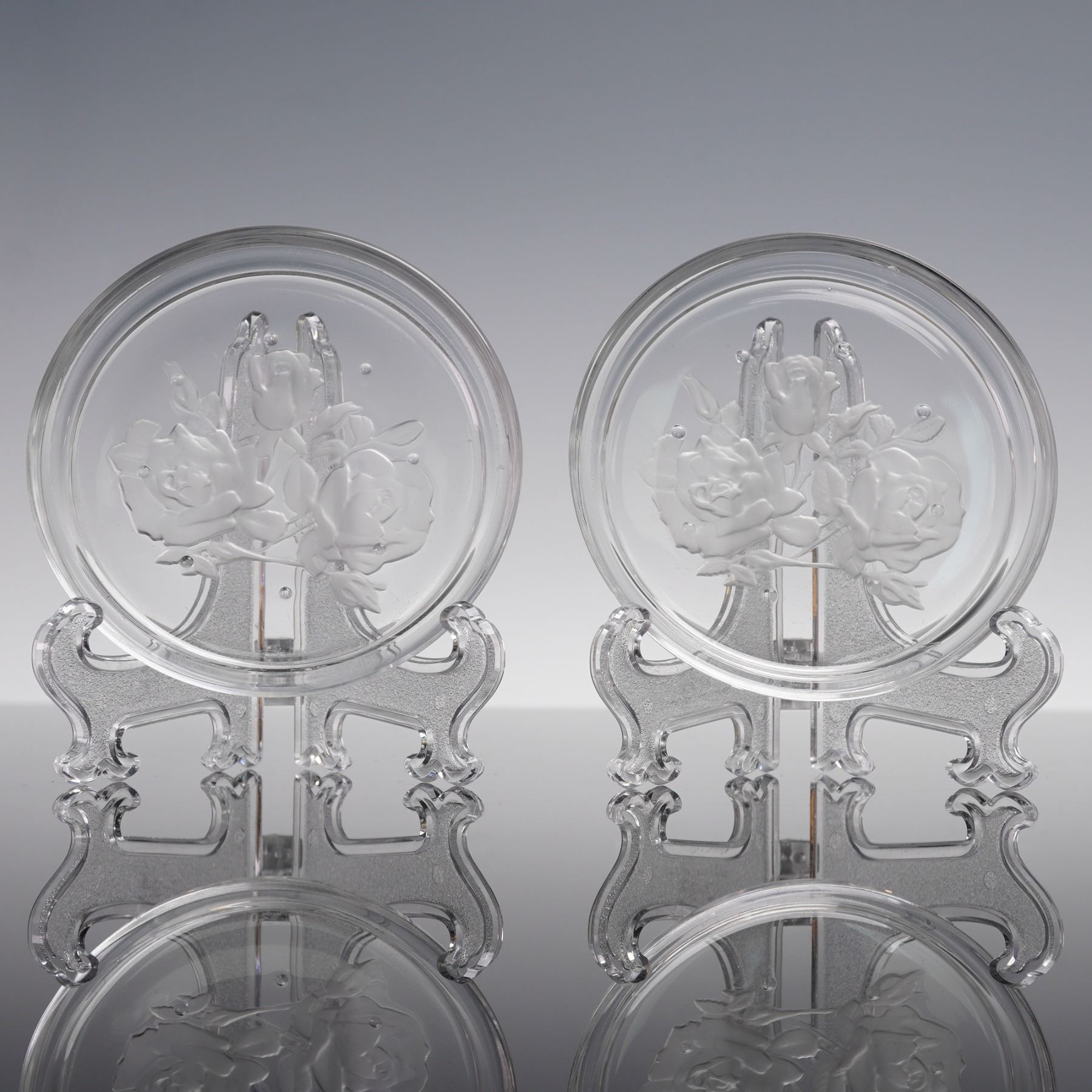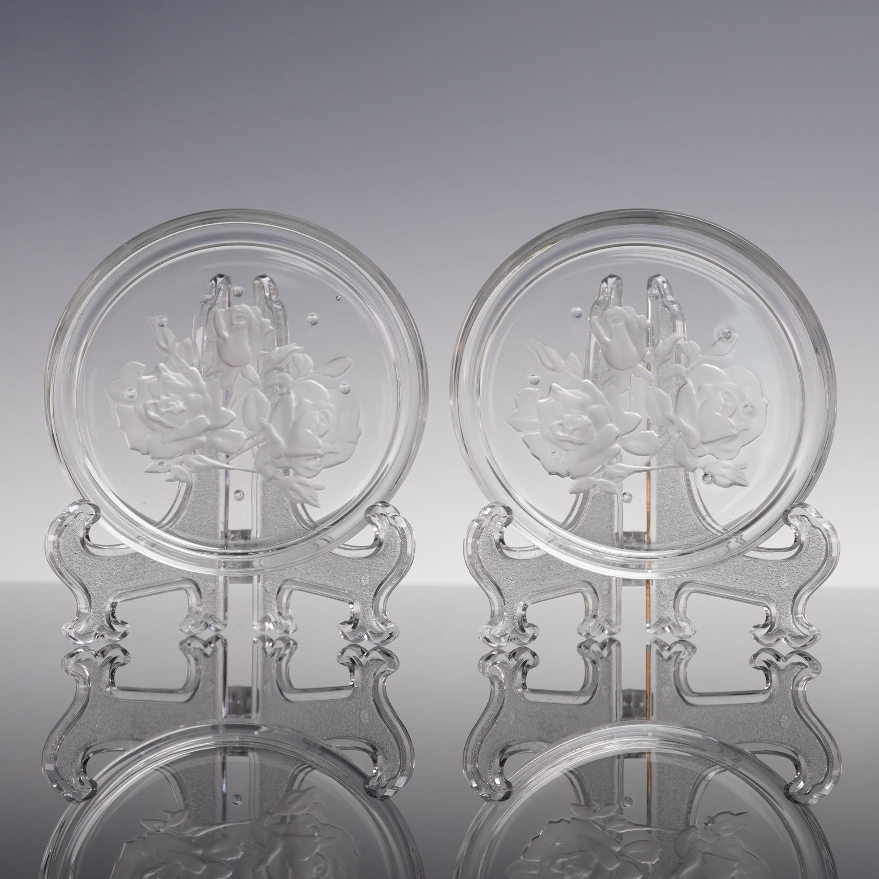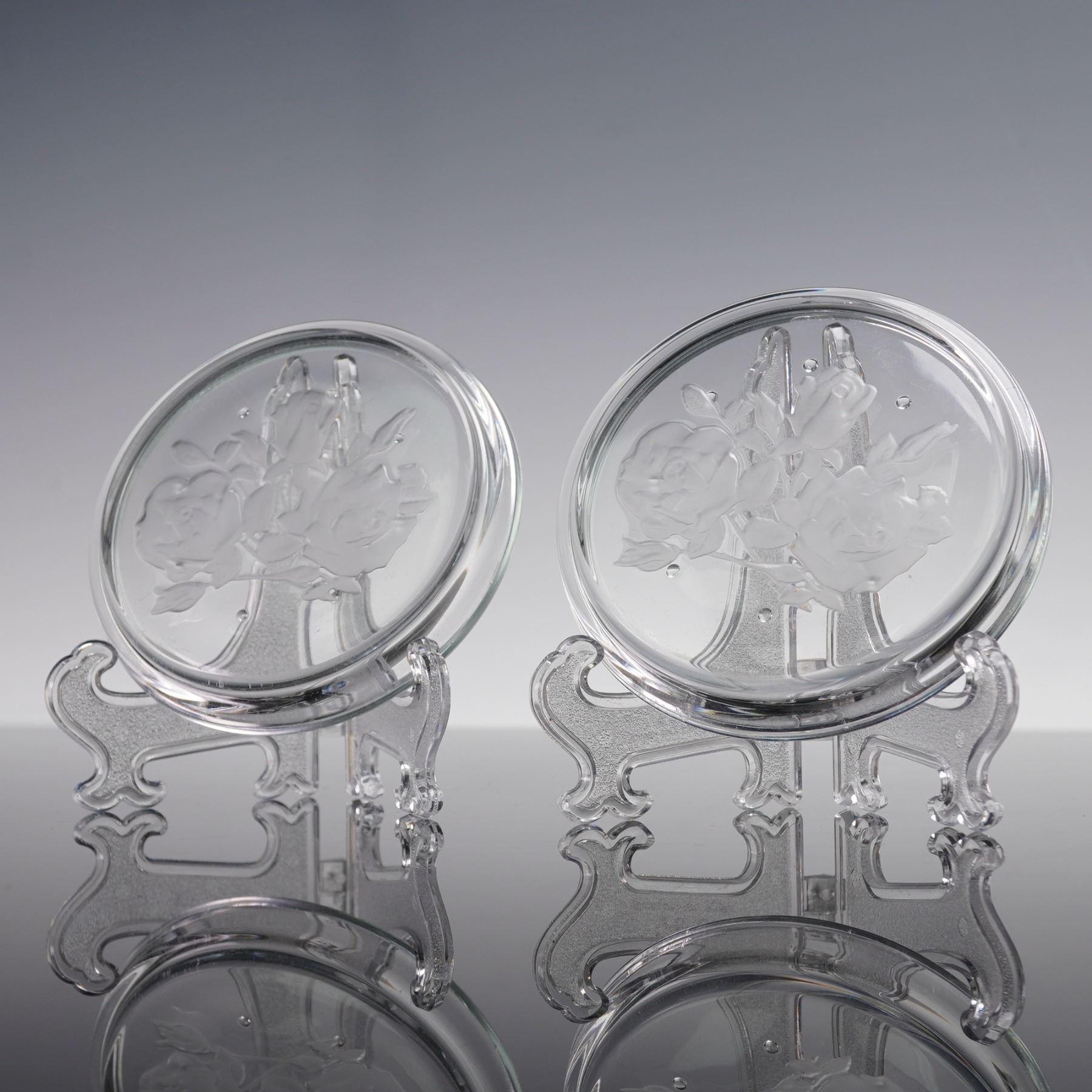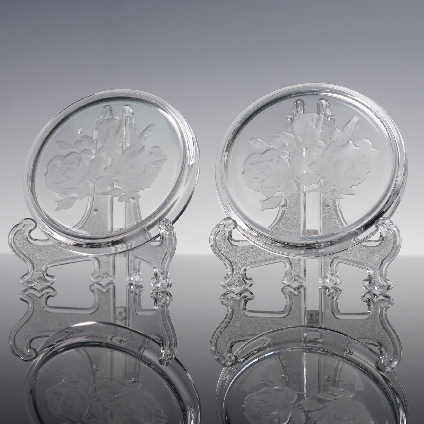 Set of five etched crystal coasters featuring a detailed rose motif in frosted relief, accompanied by a matching crystal holder. The coasters display fine craftsmanship with elegant floral decoration, combining both decorative and functional qualities. A lovely addition to barware or table settings.