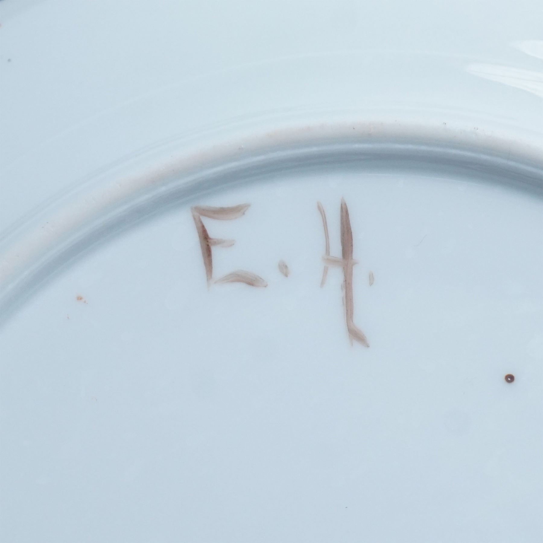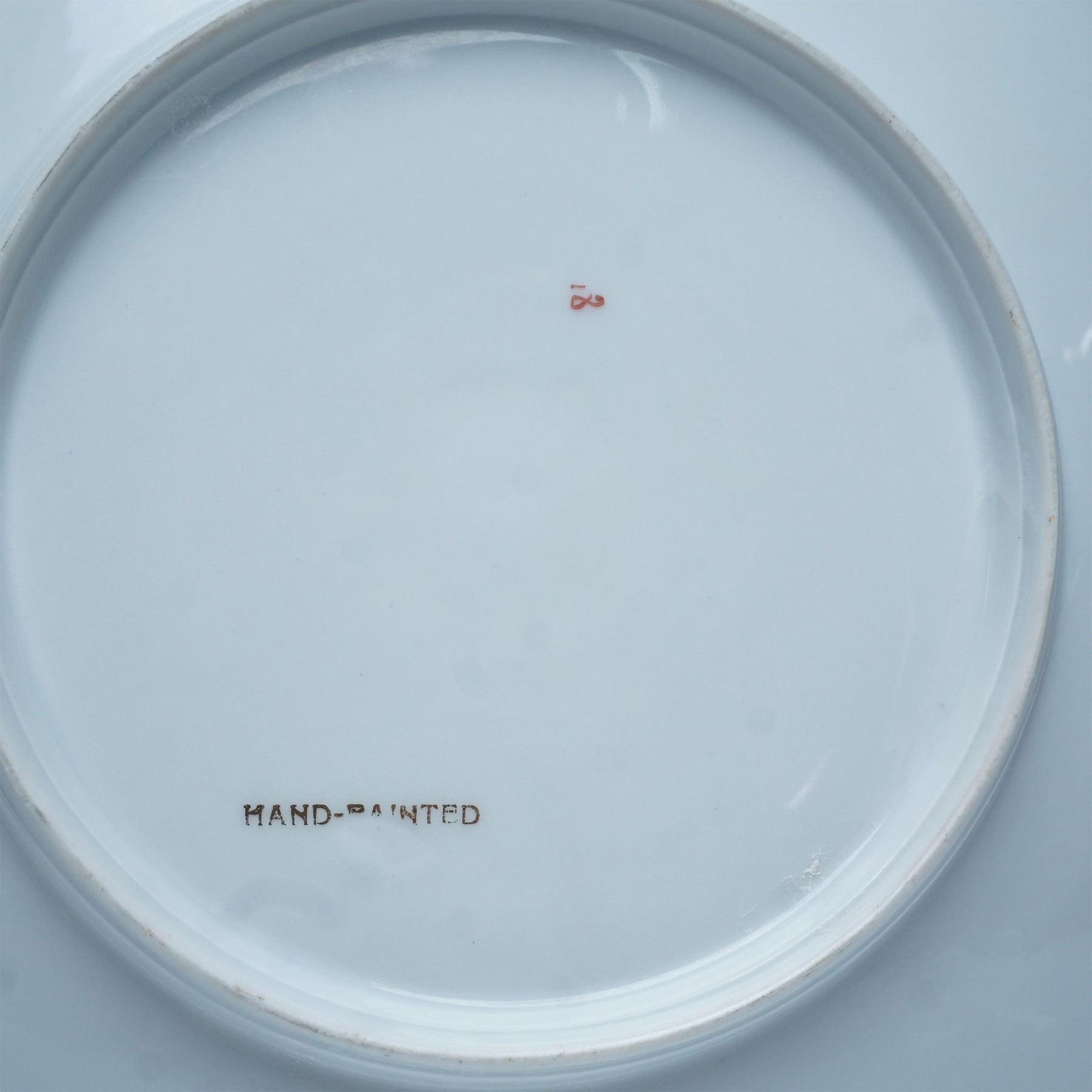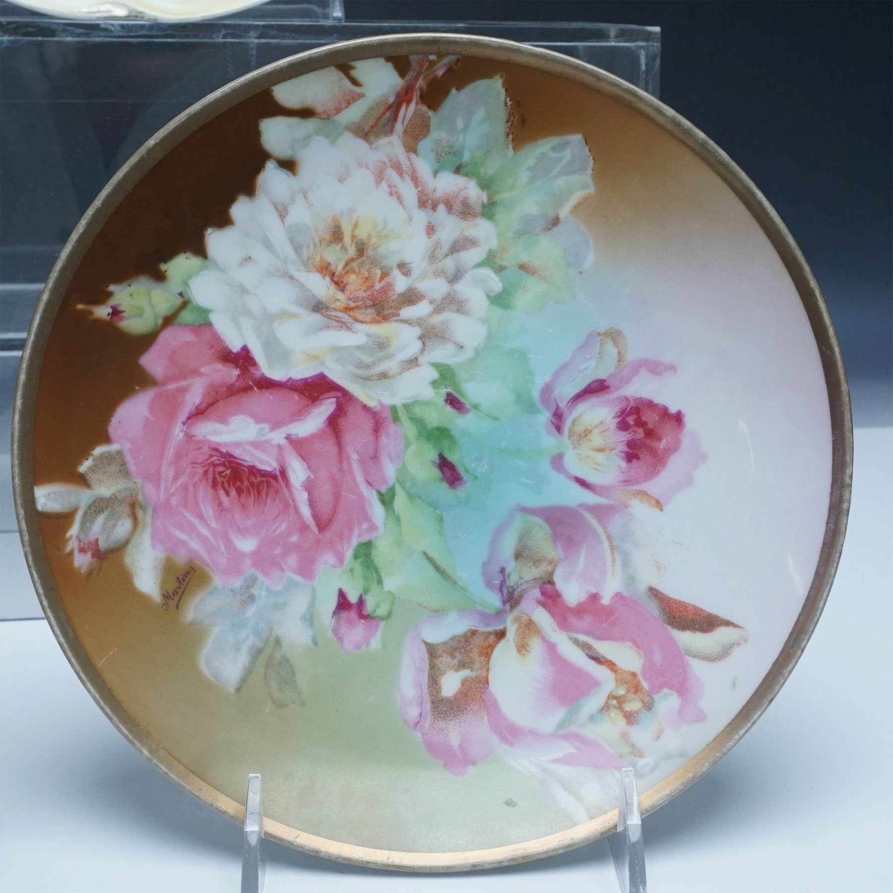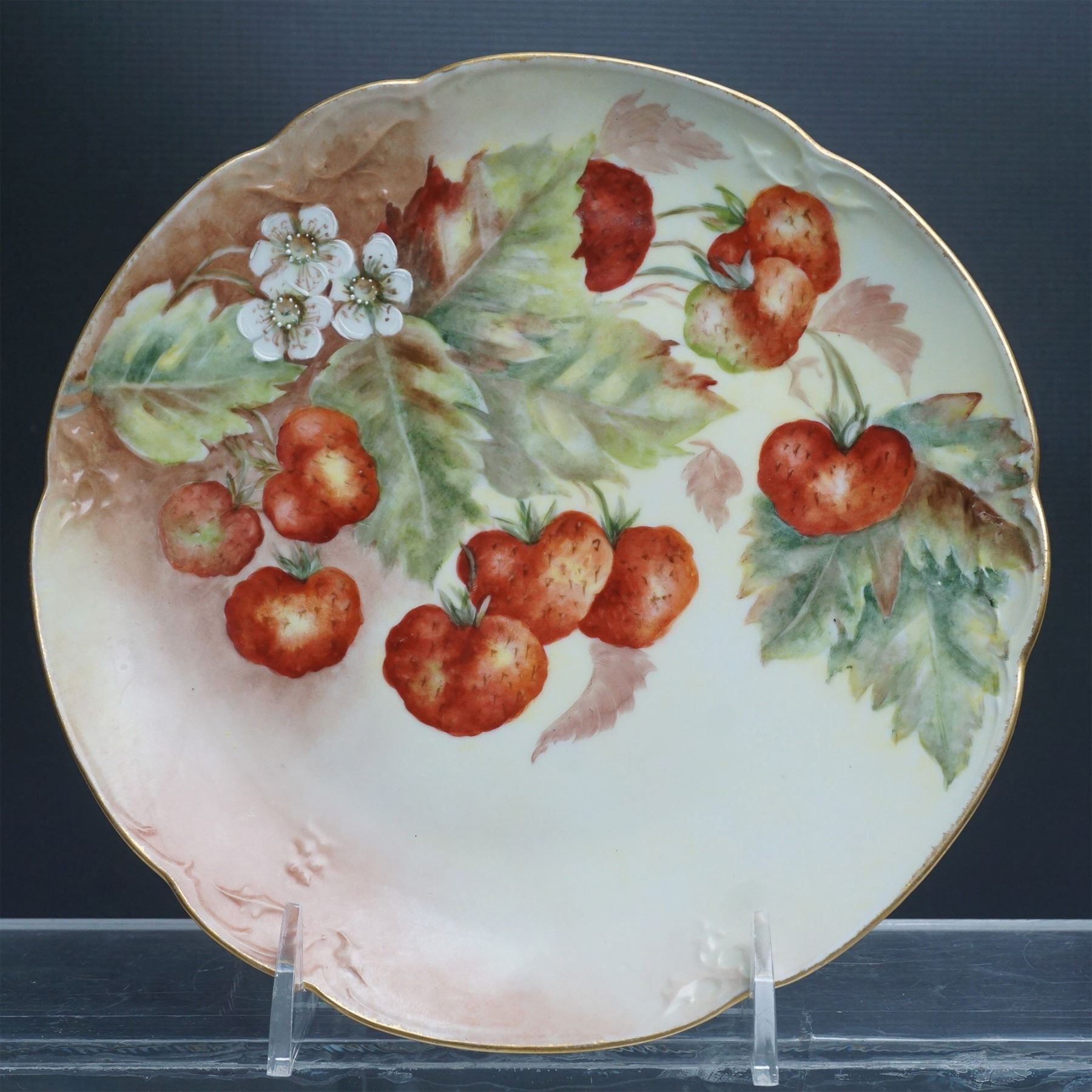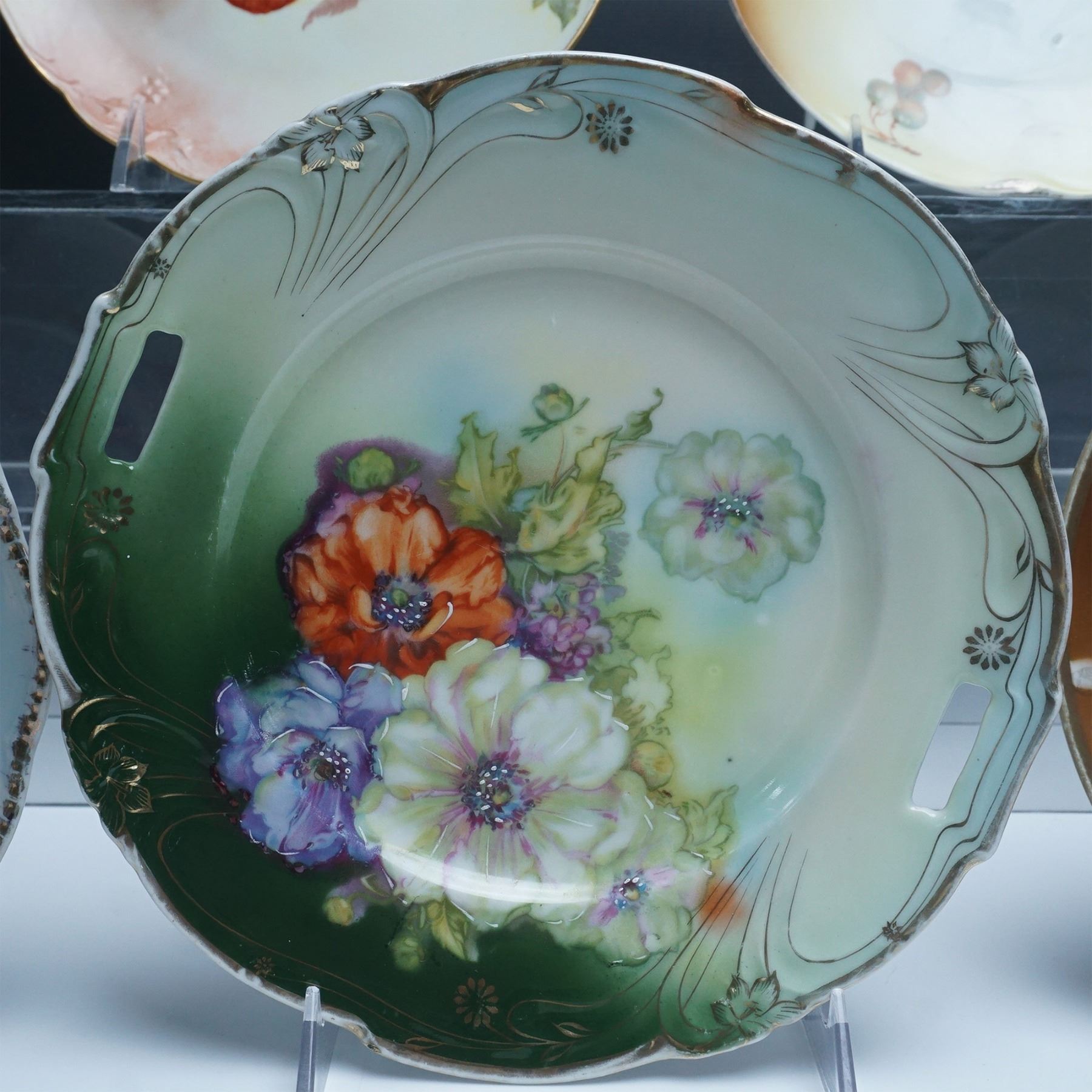 A captivating collection of 5 porcelain plates, each featuring unique floral and fruit motifs, representing fine craftsmanship from renowned makers. The collection includes: a Johann Seltmann Bavaria plate adorned with beautifully rendered anemone flowers; a J&C Bavaria plate from the Louise series, featuring a grape motif, designed by A. Kach; a Norcrest Japan plate marked P-713, showcasing a vibrant depiction of irises; a plate with pink and white flowers, signed by Martina; and a delicately painted plate with strawberries and blossoms. Each plate is an exquisite example of porcelain artistry, perfect for collectors or as an elegant addition to your home decor. The largest plate measures: 9.5"W x 1"H.