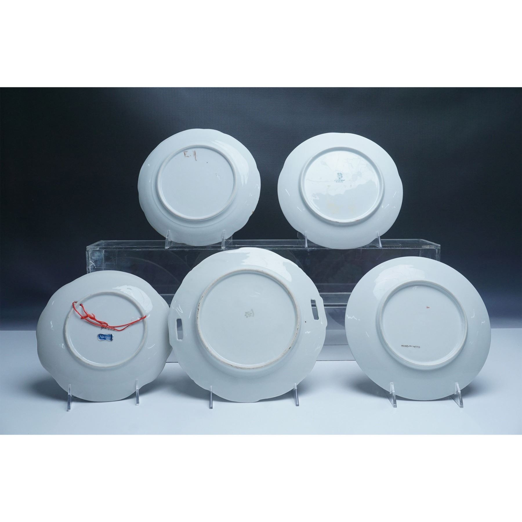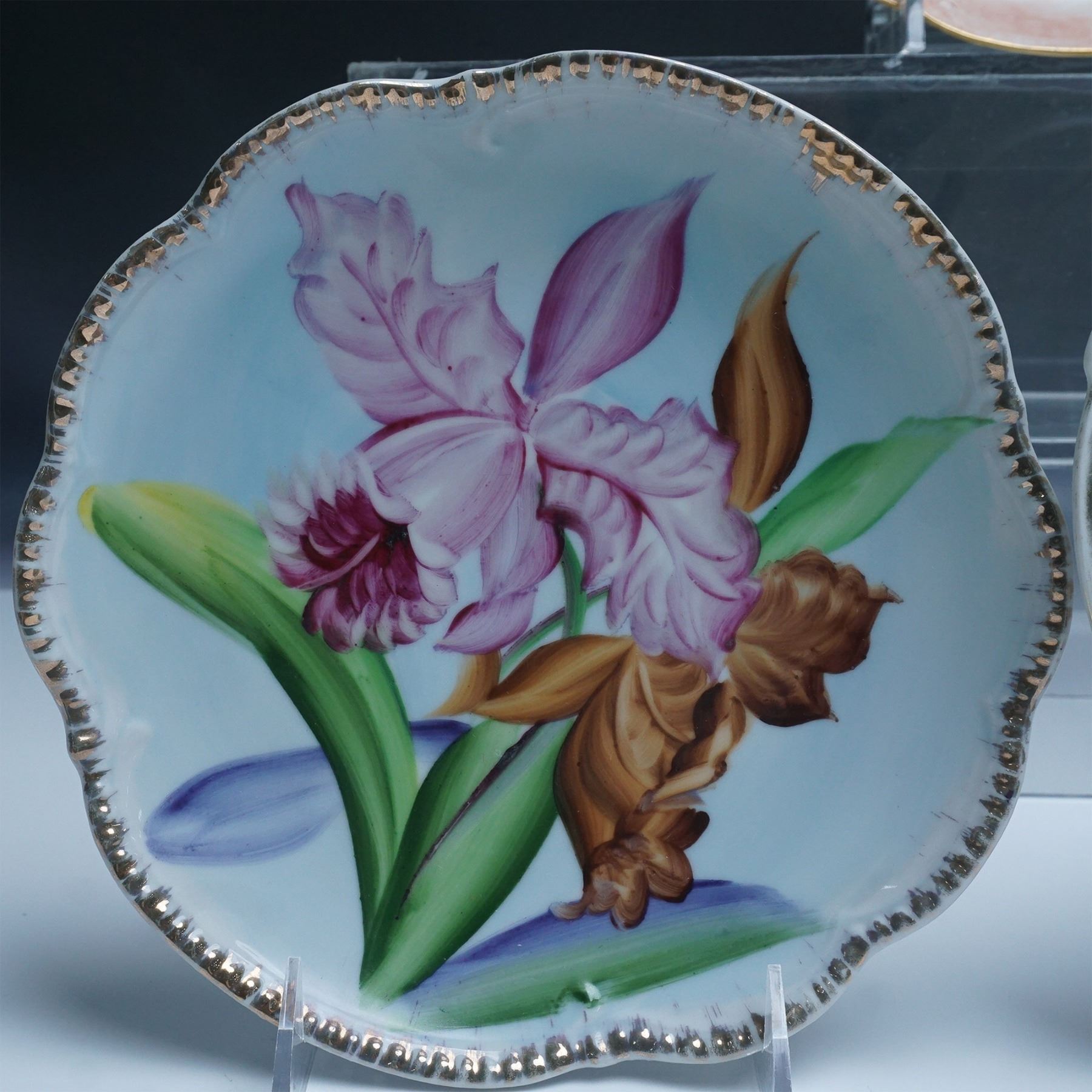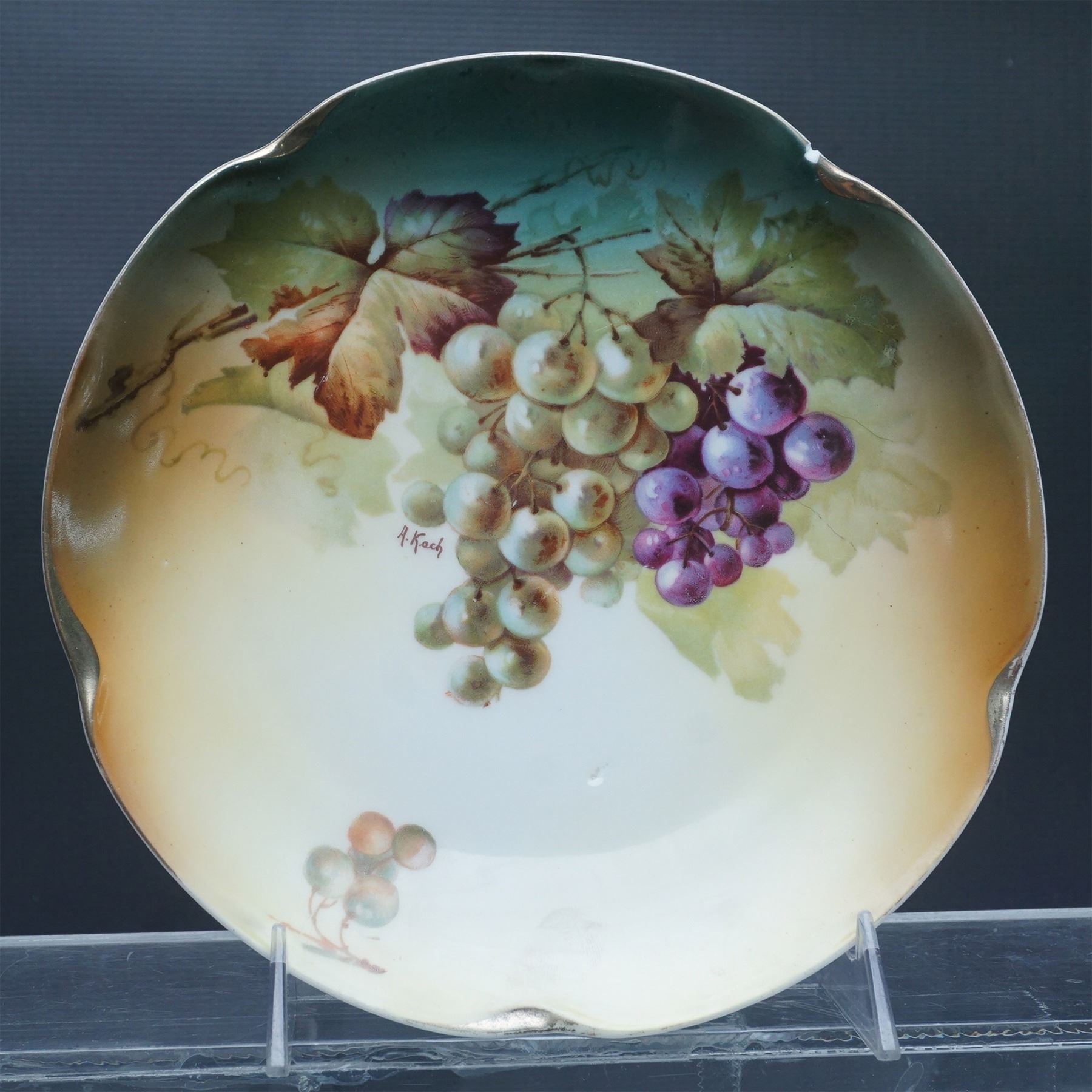 A captivating collection of 5 porcelain plates, each featuring unique floral and fruit motifs, representing fine craftsmanship from renowned makers. The collection includes: a Johann Seltmann Bavaria plate adorned with beautifully rendered anemone flowers; a J&C Bavaria plate from the Louise series, featuring a grape motif, designed by A. Kach; a Norcrest Japan plate marked P-713, showcasing a vibrant depiction of irises; a plate with pink and white flowers, signed by Martina; and a delicately painted plate with strawberries and blossoms. Each plate is an exquisite example of porcelain artistry, perfect for collectors or as an elegant addition to your home decor. The largest plate measures: 9.5"W x 1"H.