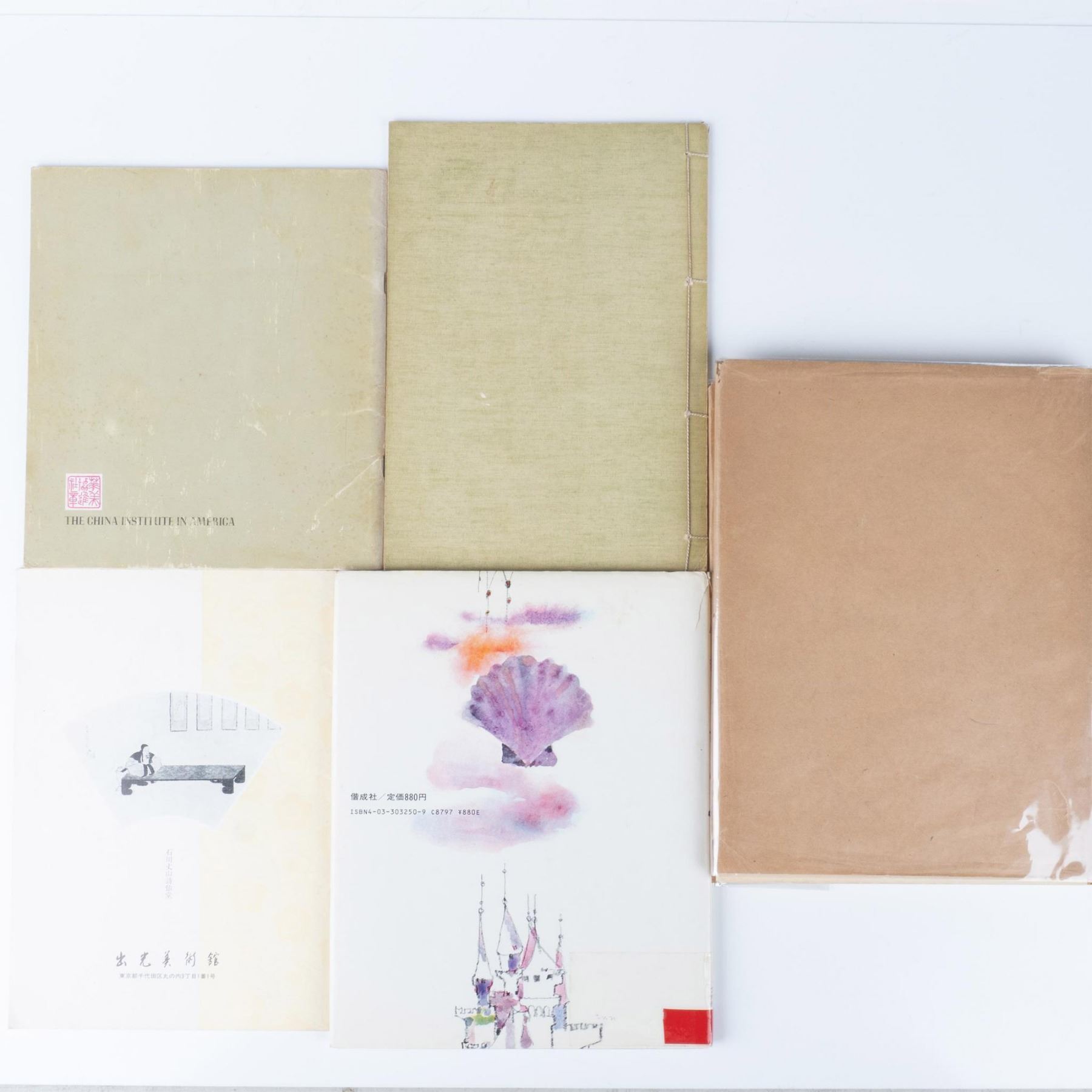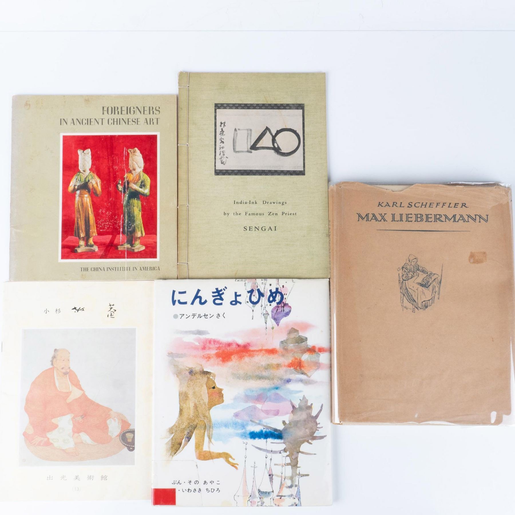 Collection of mostly Asian art books, one is in German titled Max Liebermann von Karl Scheffler. Two titles are in English: India-Ink Drawings by the Famous Zen Priest Sengai and Foreigners in Ancient Chinese Art. Largest book measures 8.5"L x 0.75"W x 11.25"H.
