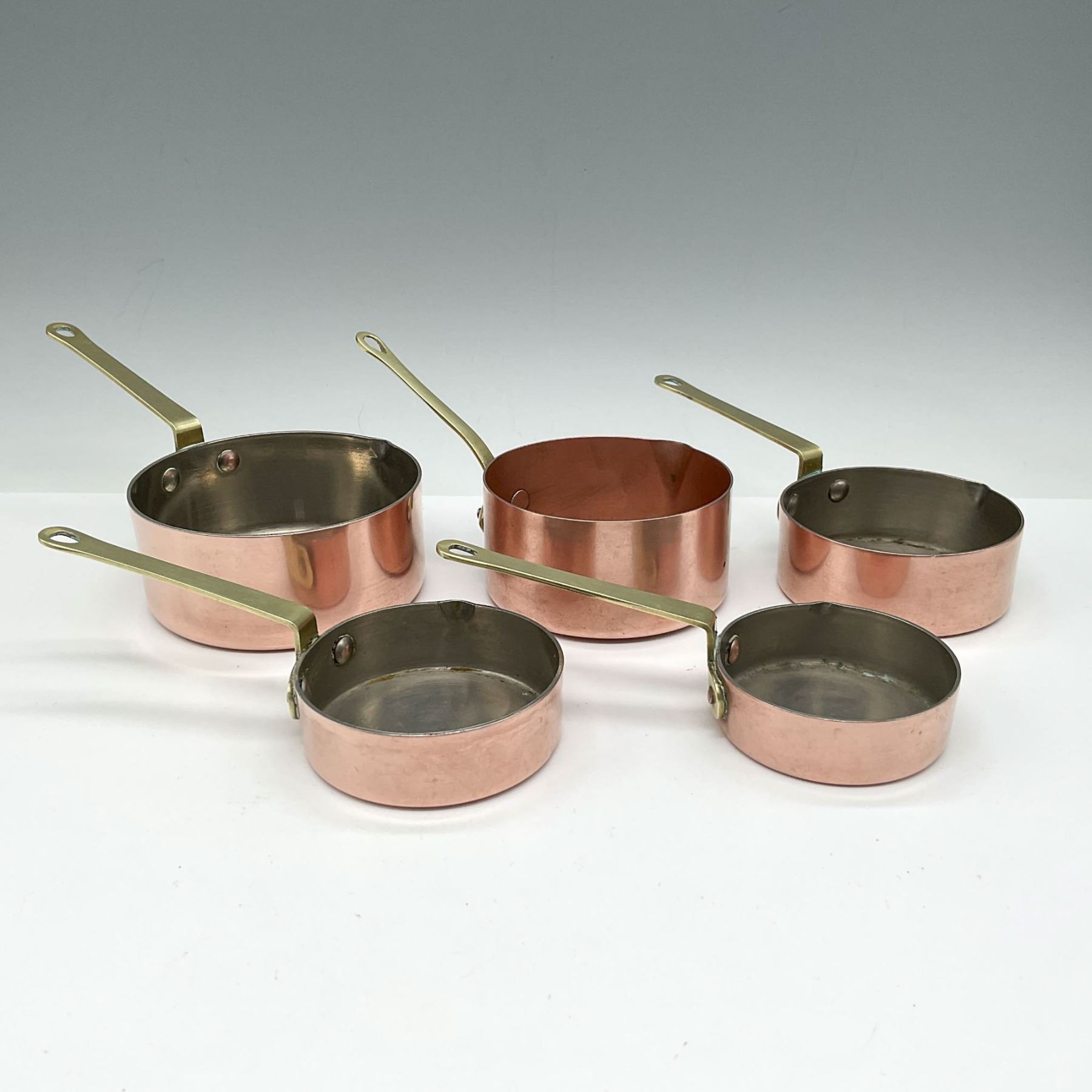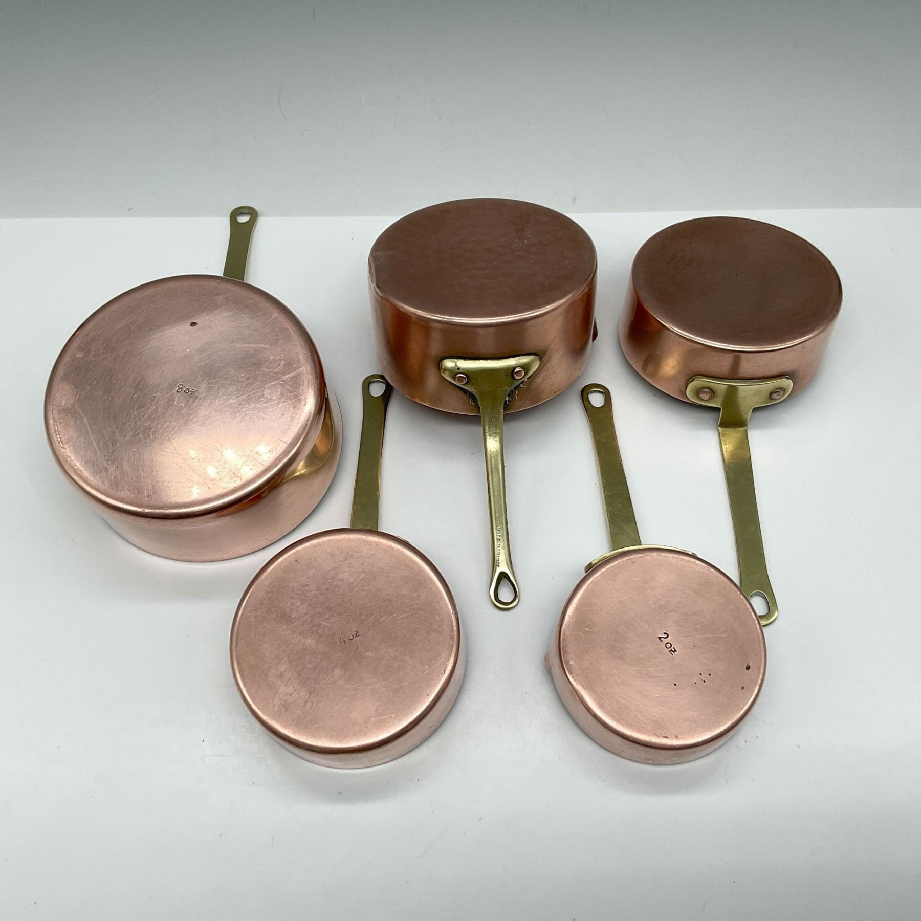 Lot includes hammered copper saucepan with brass handle 7oz. - marked made in France; plus 4 copper saucepans with brass handles with impressed marks 2oz., 4oz., 6oz. and 8oz. Largest piece 7"L x 4"W x 3"H.