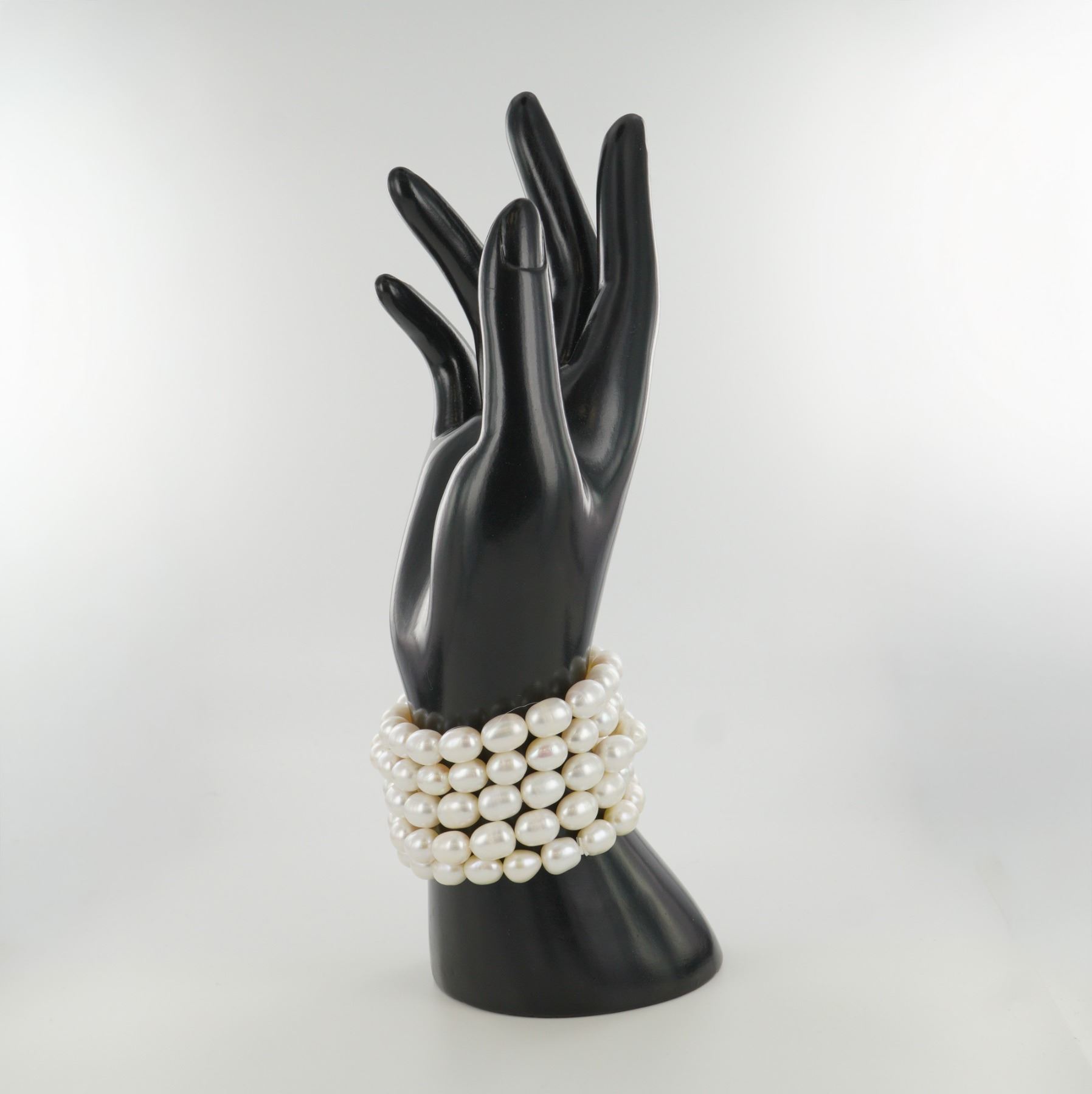 A lovely collection of five stretch bracelets featuring lustrous white freshwater pearls. Each bracelet is designed with smooth oval pearls that highlight their natural sheen and subtle variations, offering timeless beauty and versatility. The expandable elastic construction ensures a comfortable fit for most wrist sizes. Perfect for stacking together or wearing individually for a refined, classic look. Total combined weight: 88.3g.