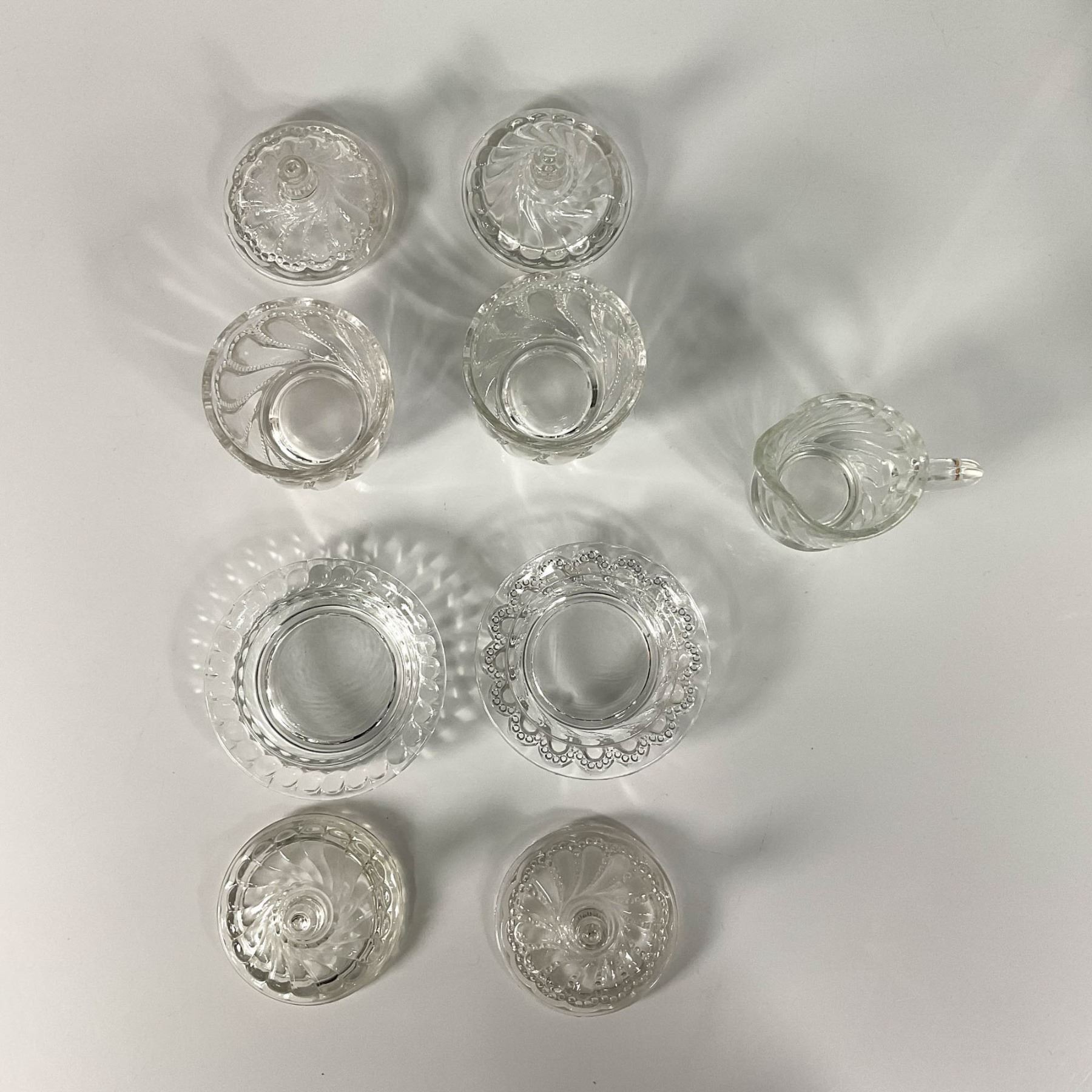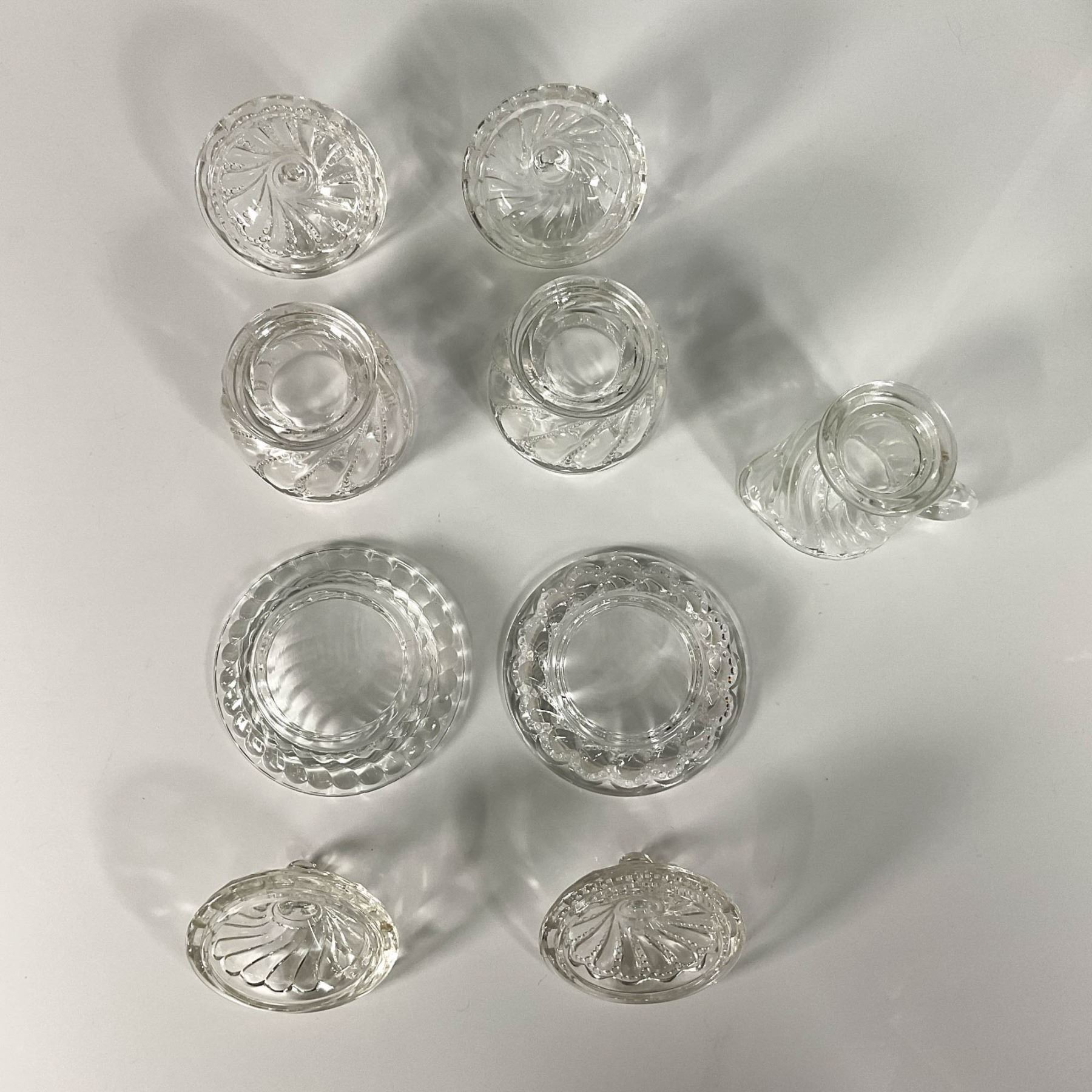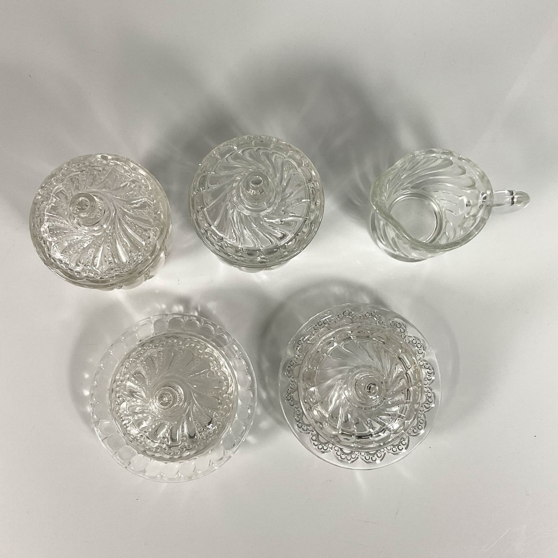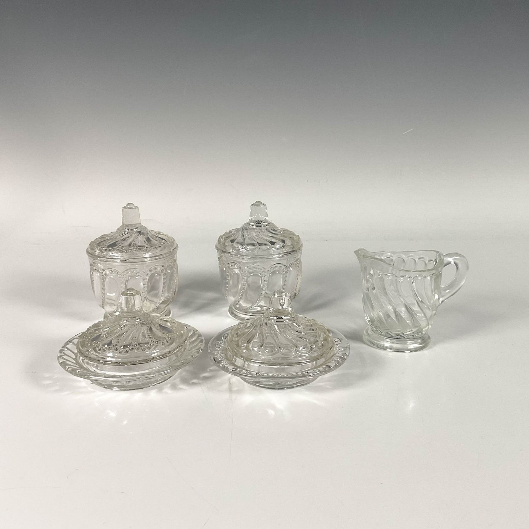 Twist patterned set includes two butter plates with lids, two sugar bowls with lids, and a creamer. Butter plate with lid: 3.5"W x 2.25"H. Sugar bowl with lid: 2.75"W x 3.75"H. Creamer: 3.5"L x 2.25"W x 2.75"H.