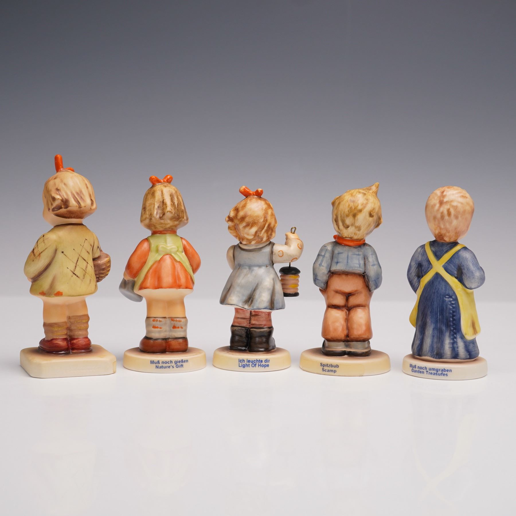 Five porcelain figurines depicting children in various activities. The group includes Light of Hope (2233), a girl holding a lantern; Natures Gift (729), a child carrying a basket; I Brought You a Gift (497), a girl holding a watering can; Scamp (553), a boy with hands in his pockets; and Garden Treasures (1222), a child with a shovel. Each figurine is marked on the underside with the Goebel and M.I. Hummel Club insignia.
