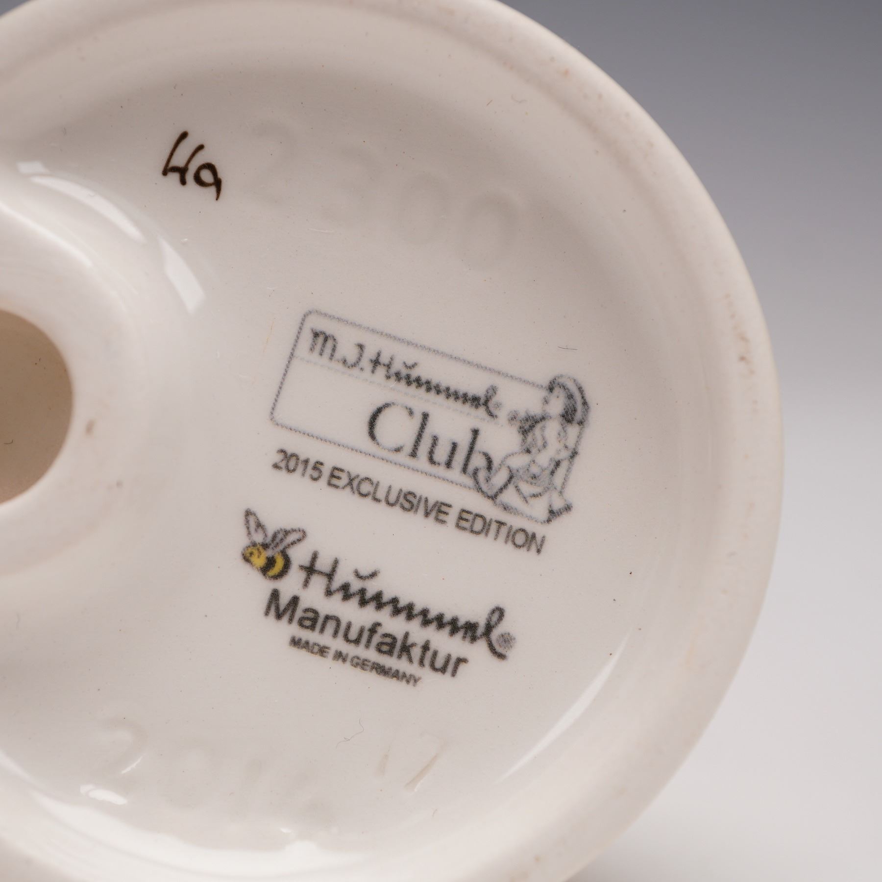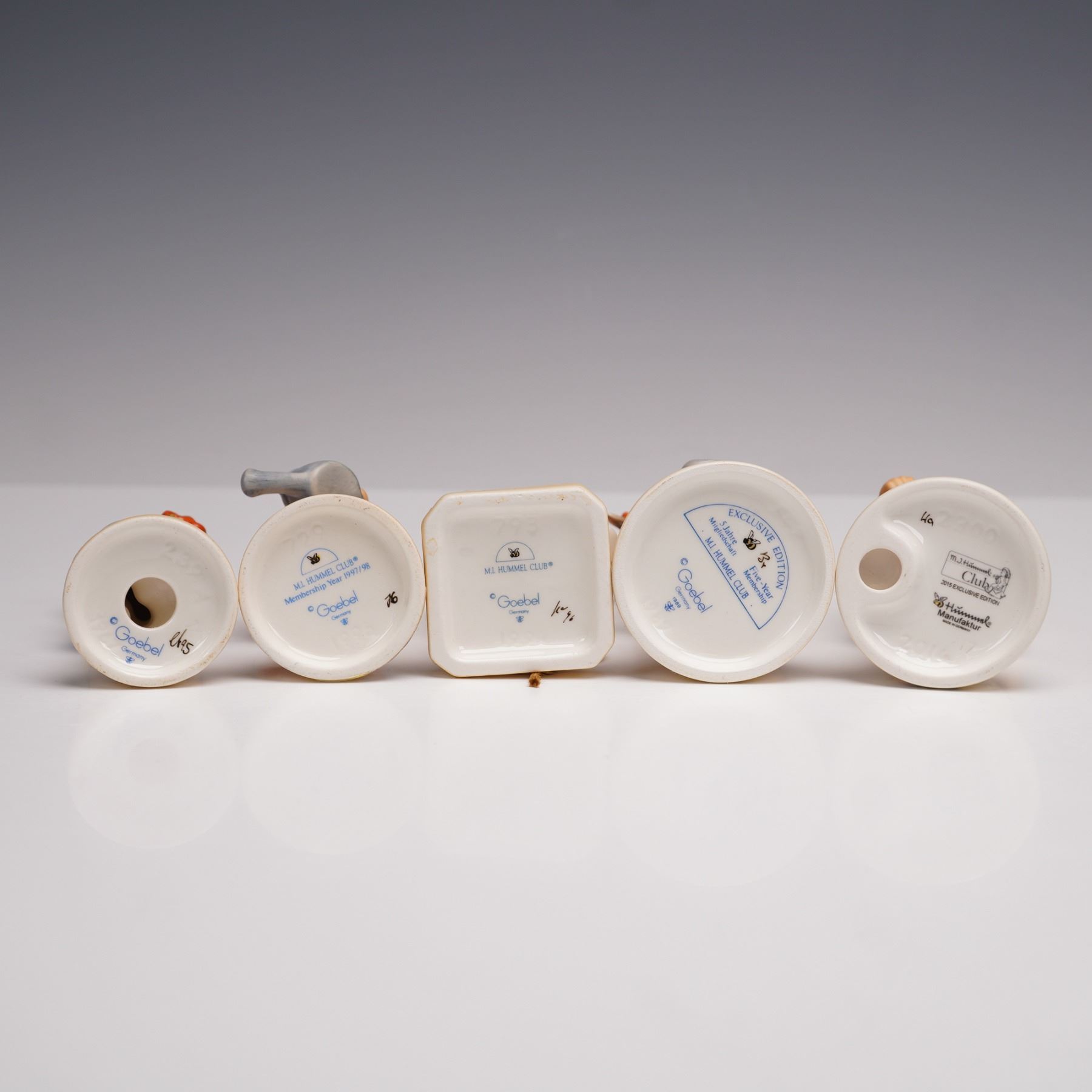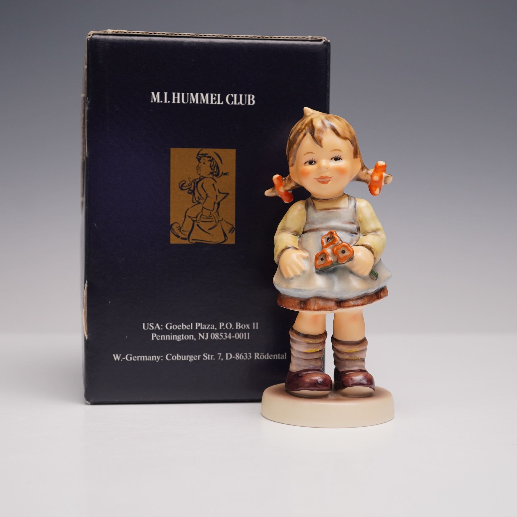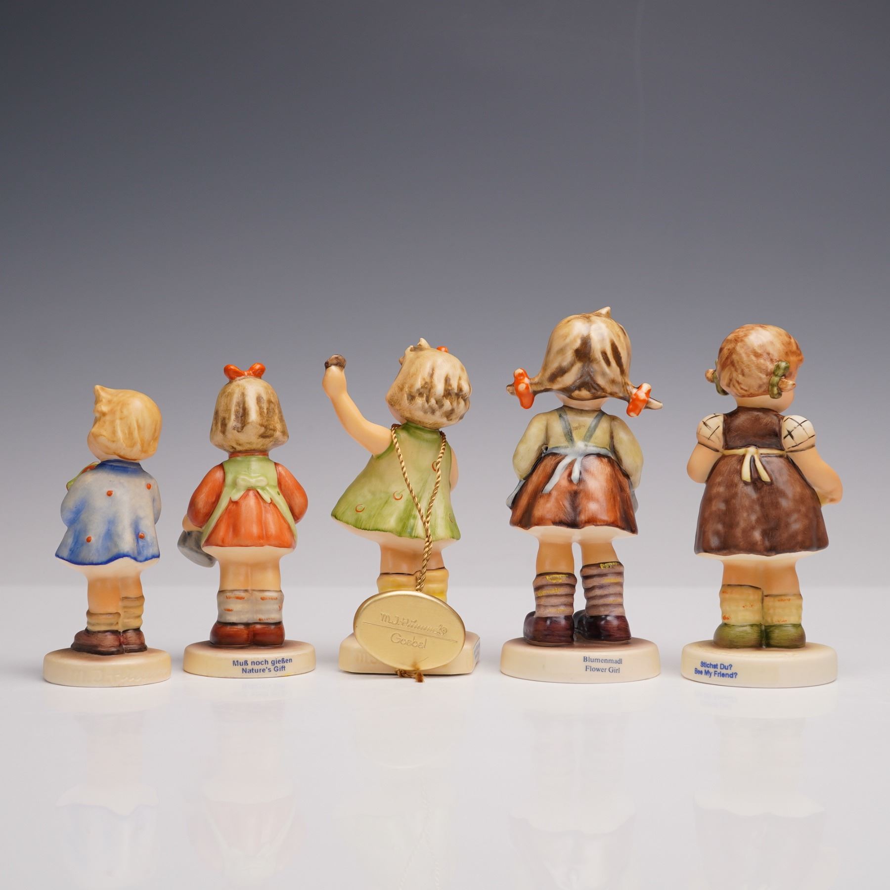 A fascinating collection of five hand painted figurines each modeled as young girls with flowers and butterflies, florals, and other poses. Includes Nature's Gift, Forever Yours, Bee My Friend?, Flower Girl, and Girl with Nosegay. Each figurine stands upon a circular or square base. M. I. Hummel impressed backstamp. Goebel backstamp. This item has its original box. Box measures: 3.75"L x 5.75"W x 3.75"H.