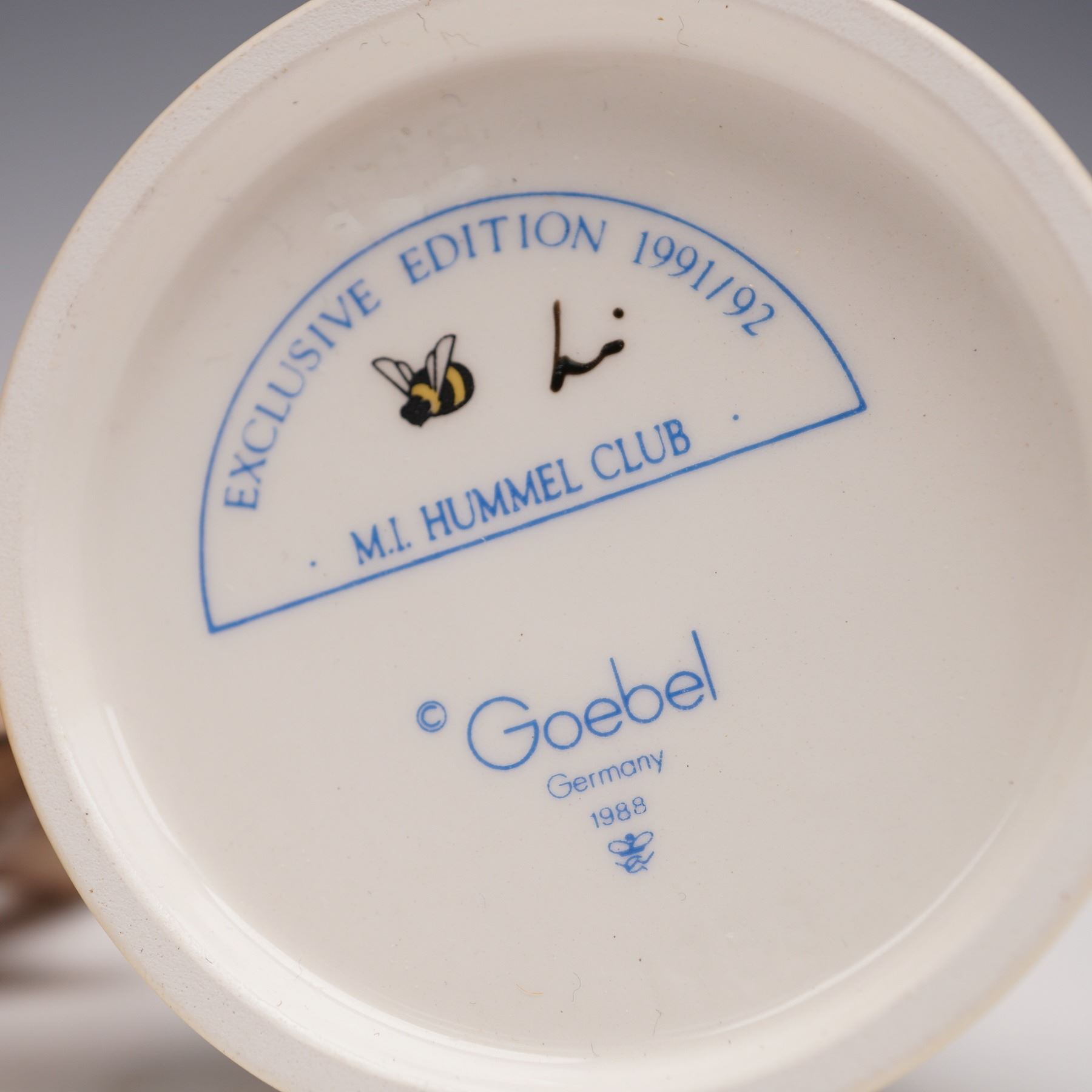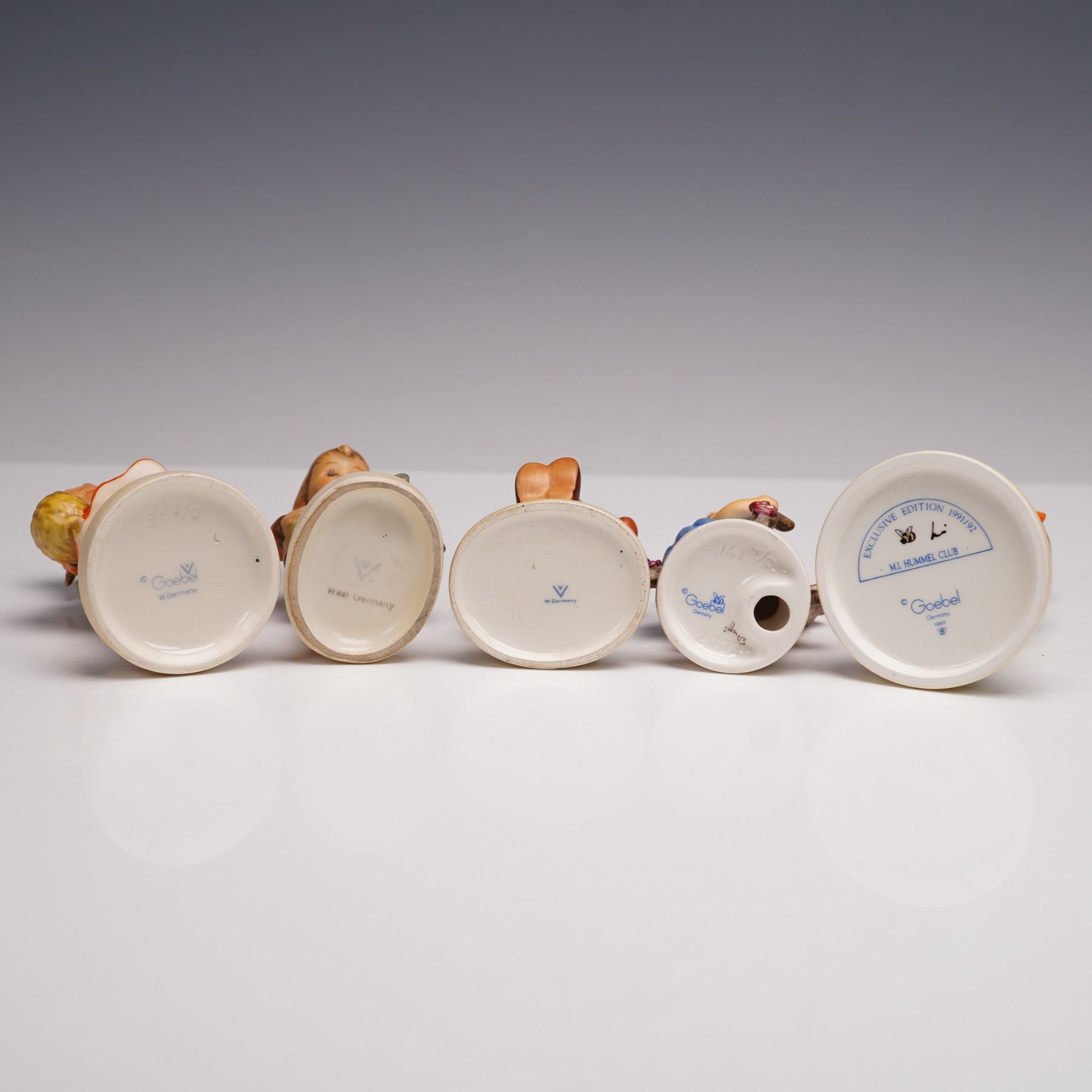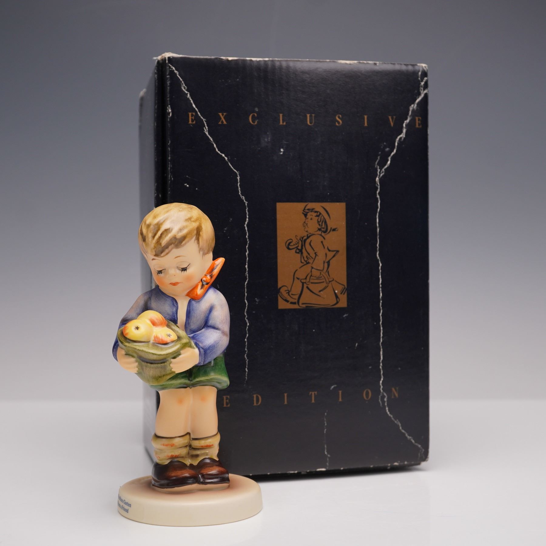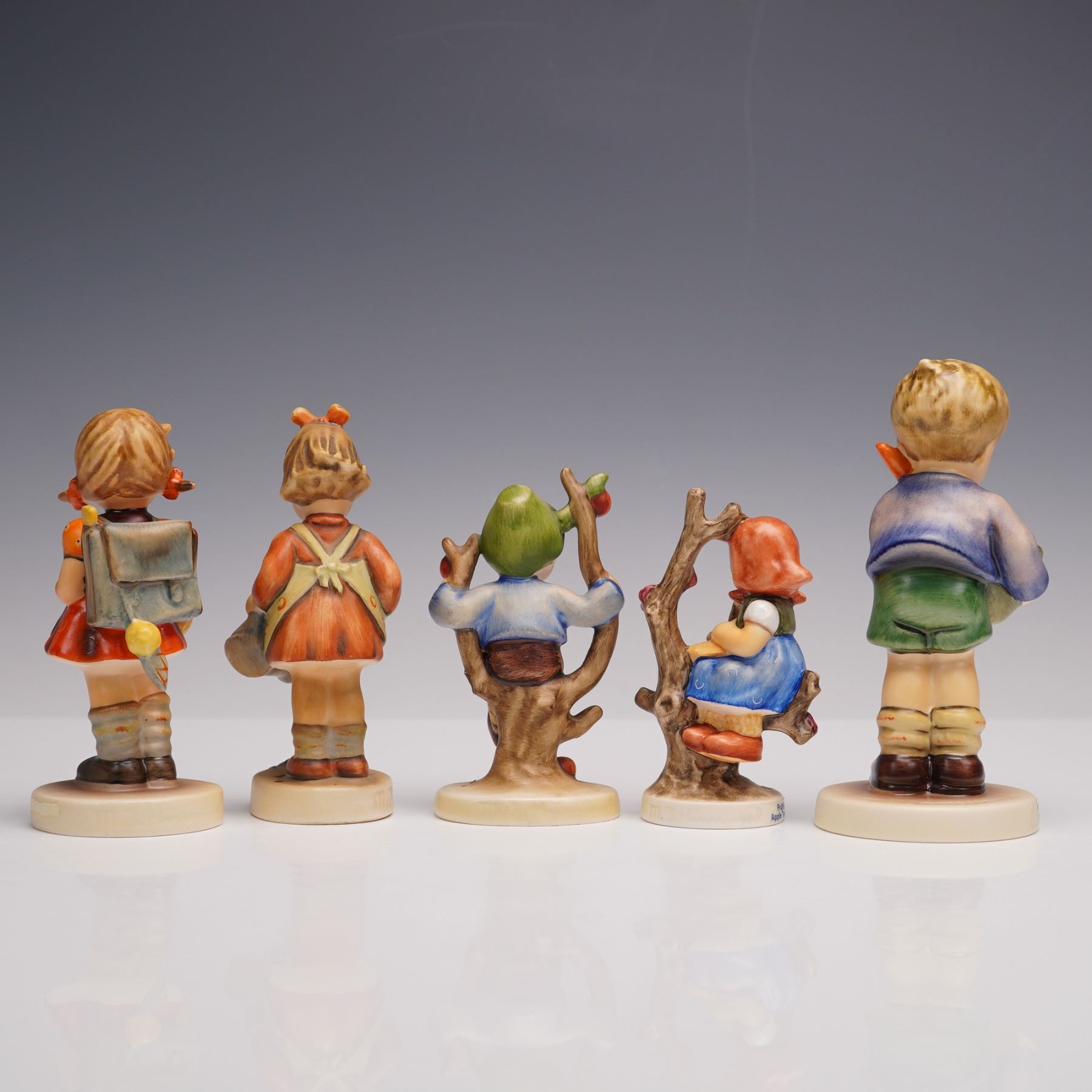 A lot of five porcelain figures, each hand-painted and depicting children in seasonal or pastoral settings. The group includes Apple Tree Girl, Apple Tree Boy, Gift from a Friend, School Girl, and Little Gardner. Each figurine stands upon a circular base. M. I. Hummel impressed backstamp. Goebel backstamp. This item has its original box. Box measures: 5"L x 7.75"W x 4"H.