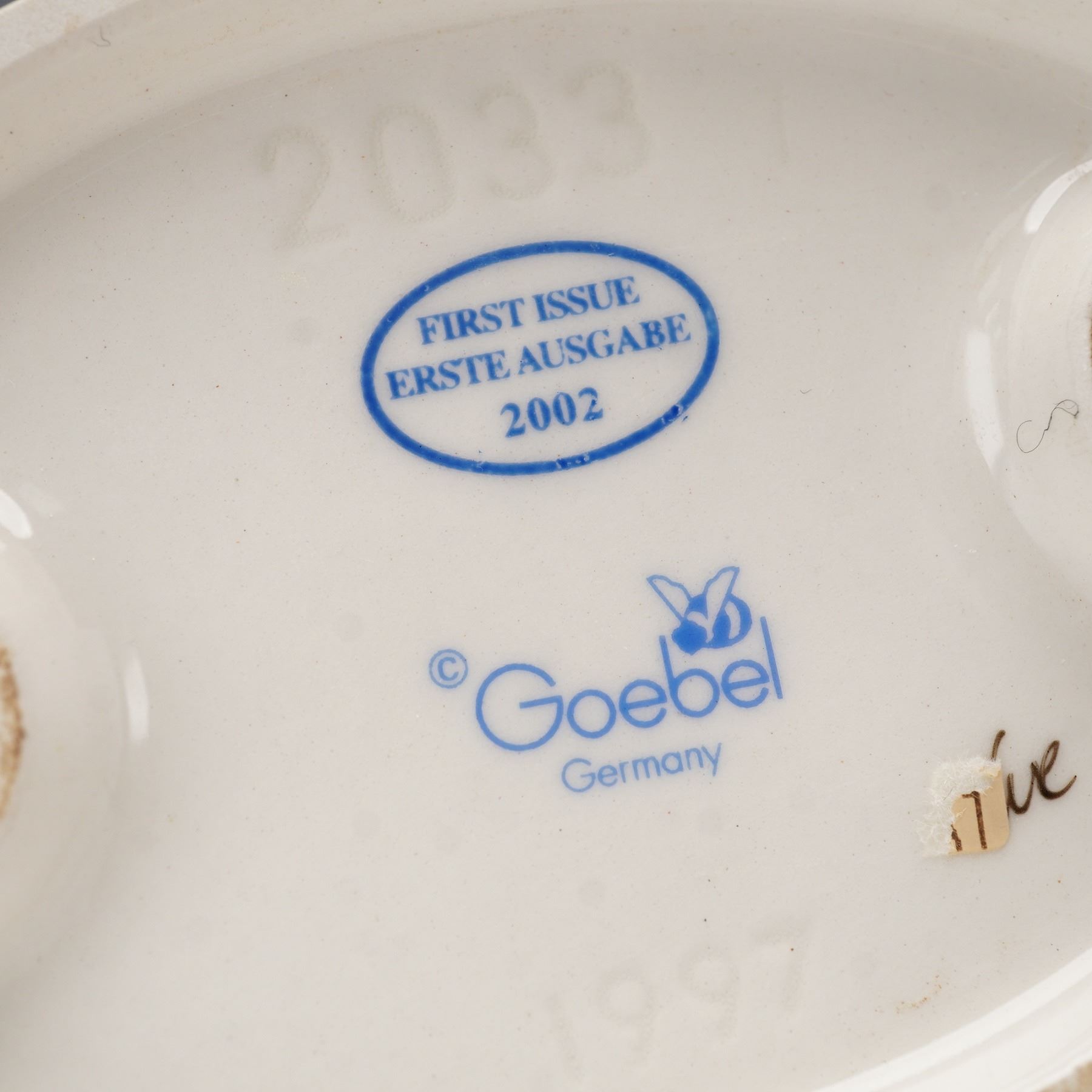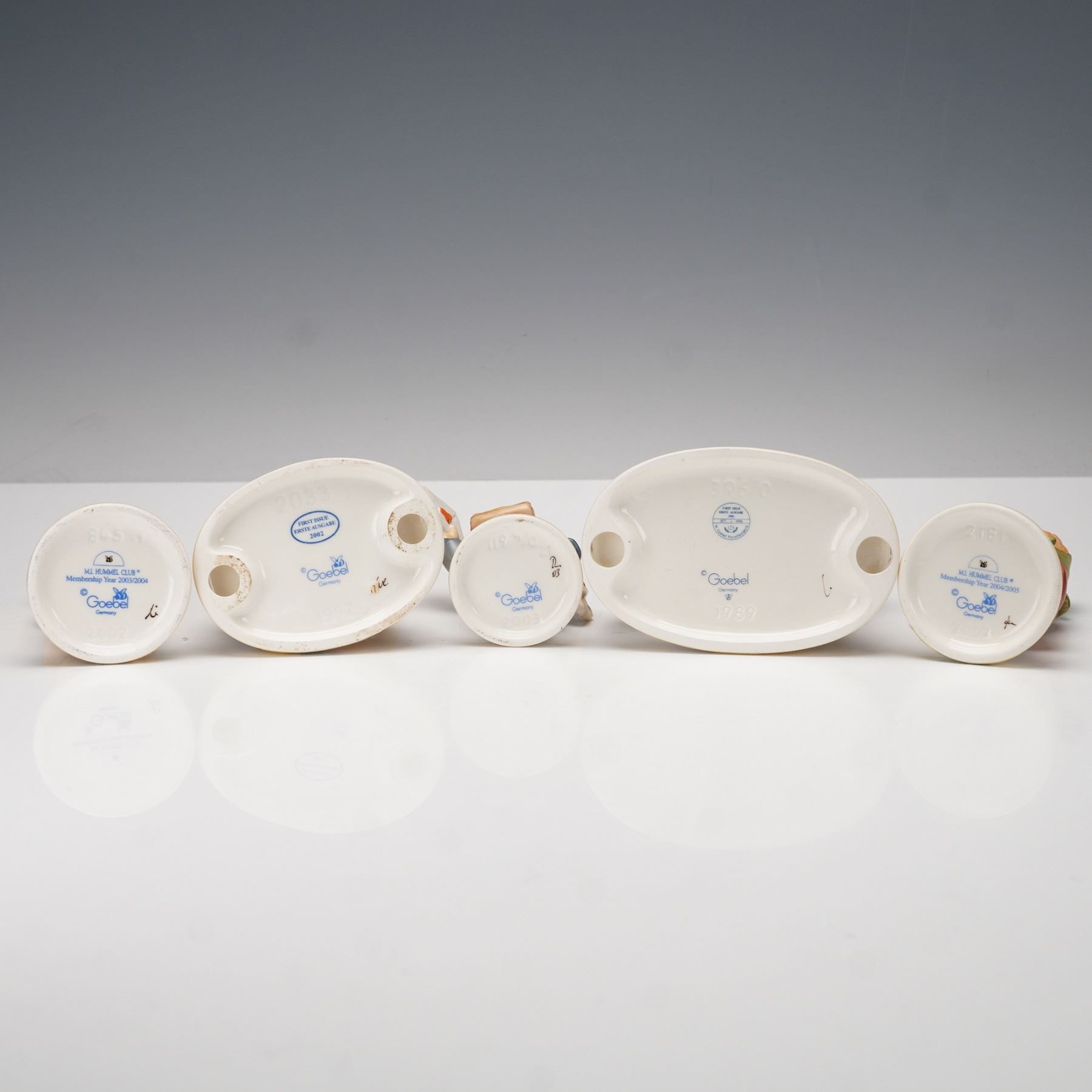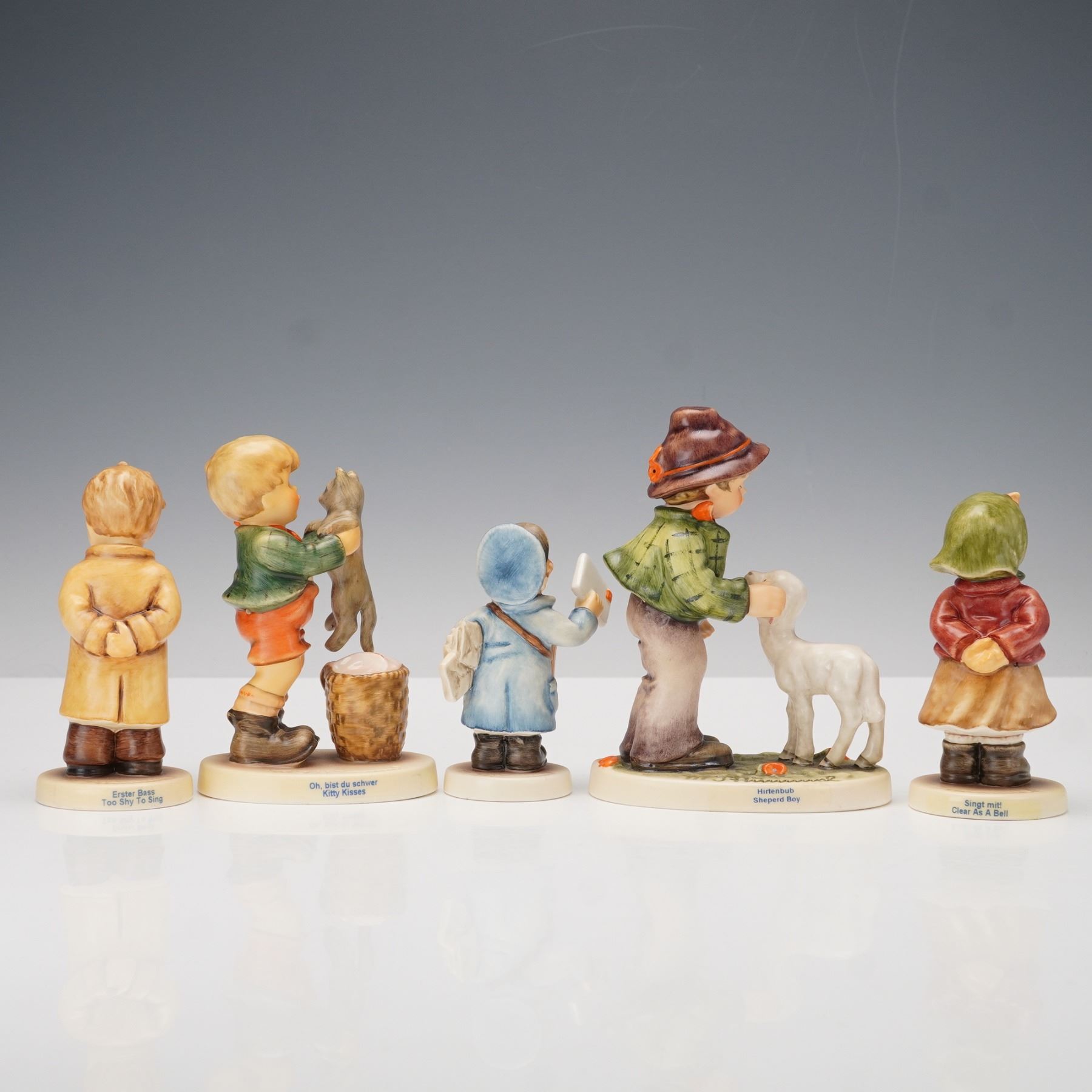 Attractive group of five hand-painted M.I. Hummel/Goebel figurines including Shepherd Boy (model 395), Too Shy to Sing (845), Kitty Kisses (2033, bearing the blue First Issue 2002 oval as shown), Clear As A Bell (2181), and Postman (119). Each piece displays the classic Hummel palette with fine facial detail and is marked on the base with the Goebel Germany backstamp and impressed model number.