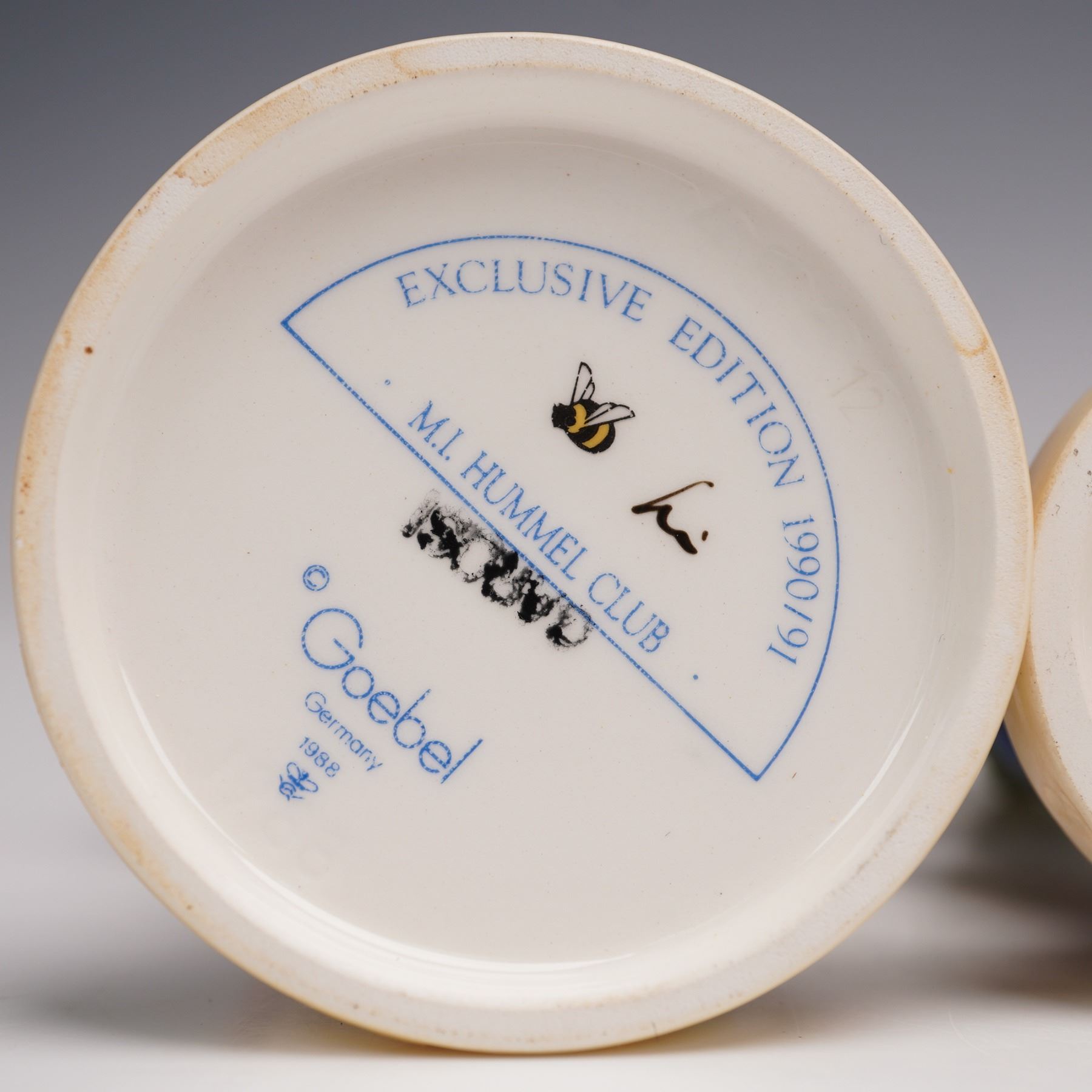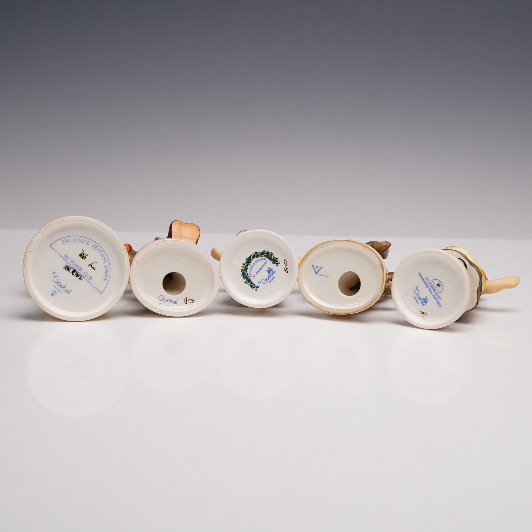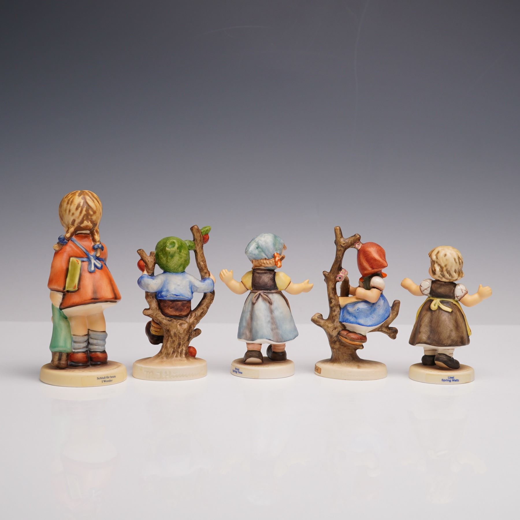 Five enchanting hand painted porcelain figurines l, each depicting charming children in various poses. The lot includes Spring Time, I Wonder, Spring Waltz, Apple Tree Boy, and Apple Tree Girl. Each figurine stands upon a circular or square base. M. I. Hummel impressed backstamp. Goebel backstamp.