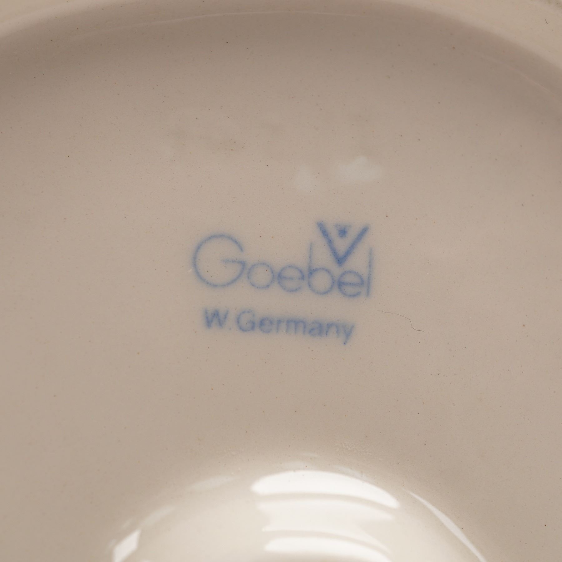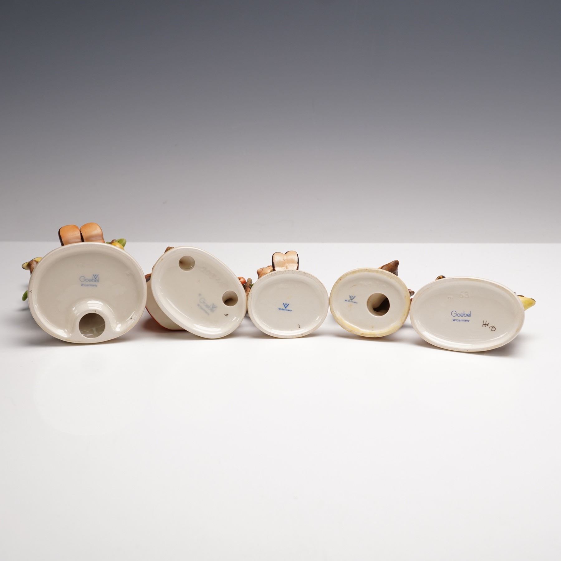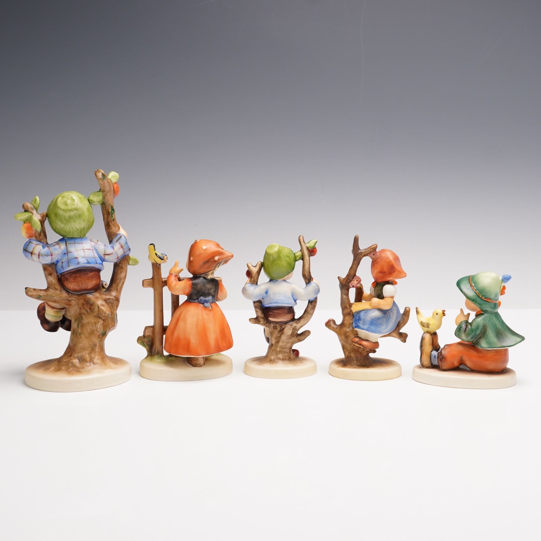 A charming ensemble of five each crafted with refined detail and finished in hand-painted decoration. This lot features Apple Tree Girl, 2 Apple Tree Boy figures, Signs of Spring, and Singing Lesson. Various young children in different activities such as two boys perched upon fruiting trees, a girl leaning against a fence with bird companion, a young maiden seated within a blossoming tree, and a boy on the ground with a chick at his side. M. I. Hummel impressed backstamp. Goebel backstamp.